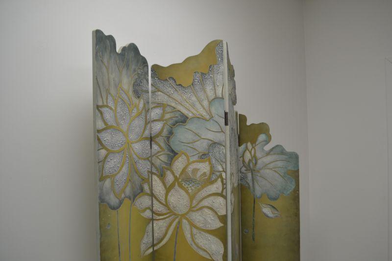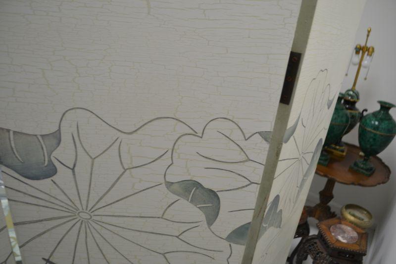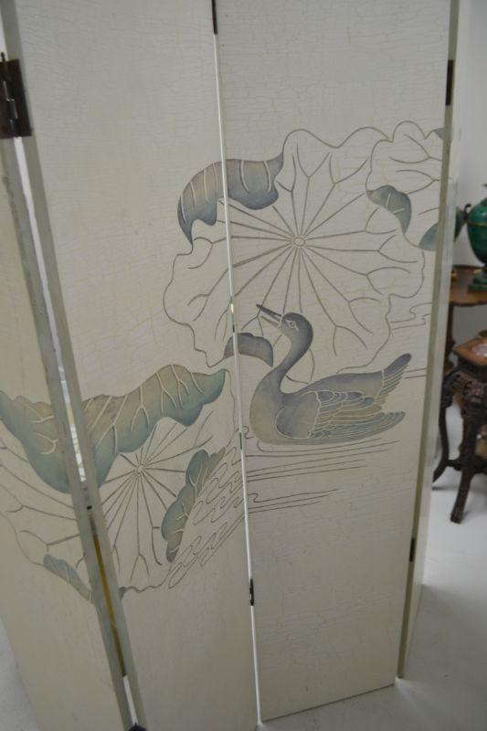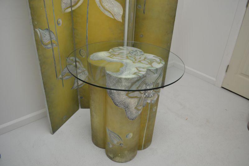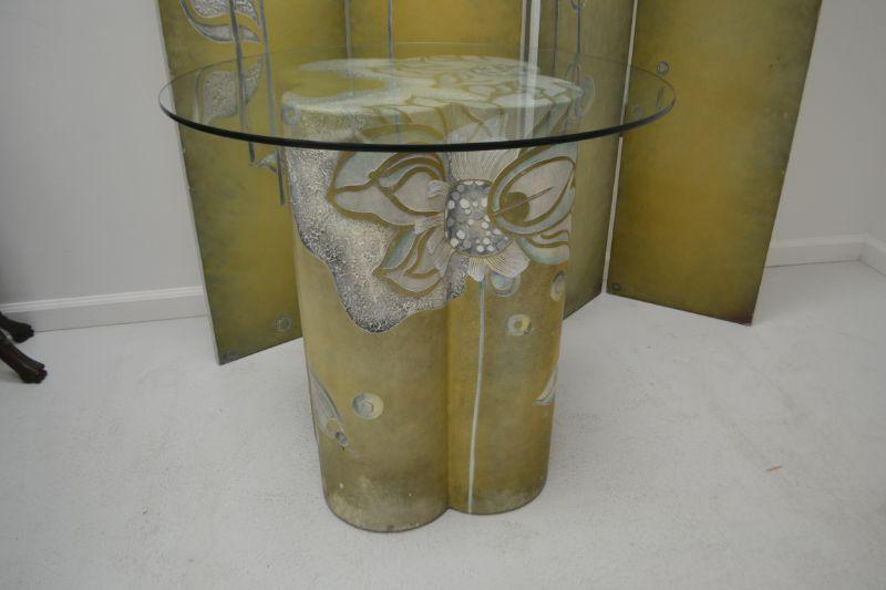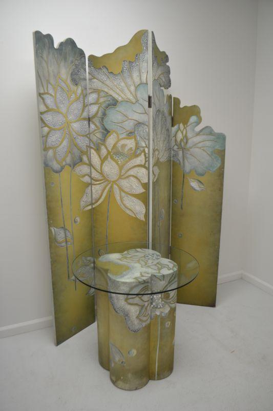 CARVED WOOD FOLDING 4 PANEL ROOM DIVIDER WITH MATCHING TABLE WITH GLASS TOP (NEEDS CLEANING, VERY NICE QUALITY ITEM). EACH PANEL IS 16" WIDE, SHORTEST PANEL IS 69" TALL, TALLEST PANEL IS 84" TALL