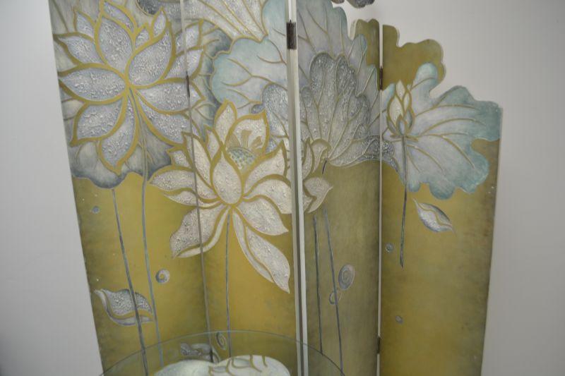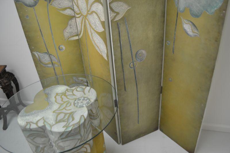 LOT 478 CARVED WOOD FOLDING 4 PANEL ROOM DIVIDER WITH MATCHING TABLE WITH GLASS TOP