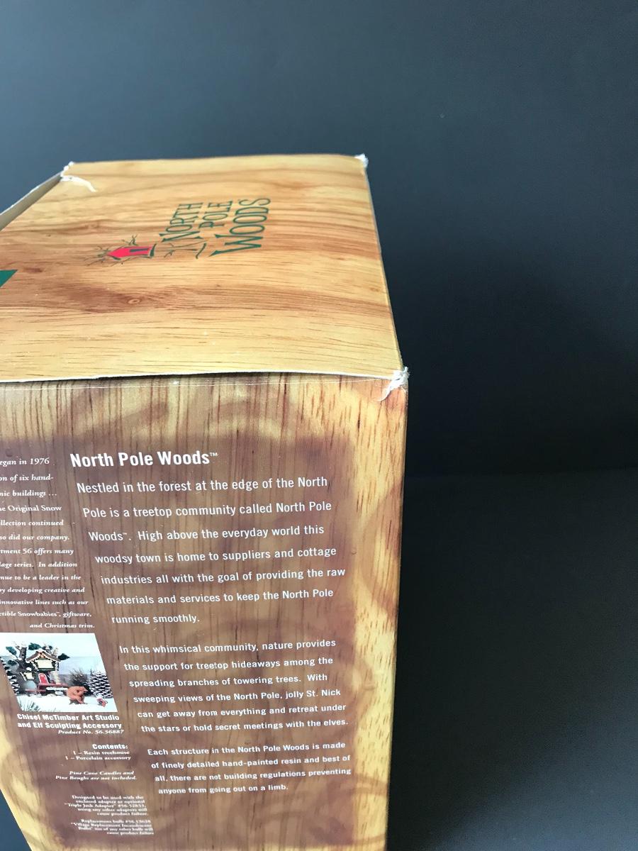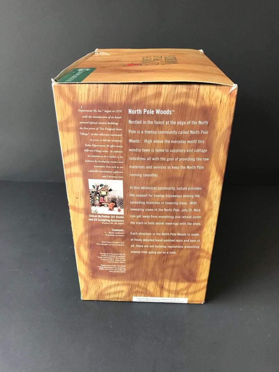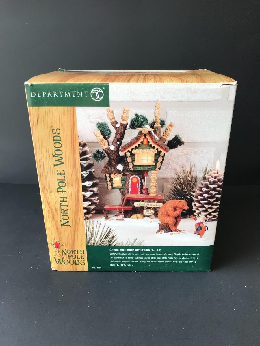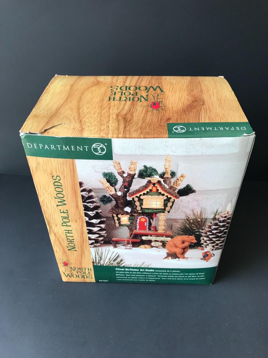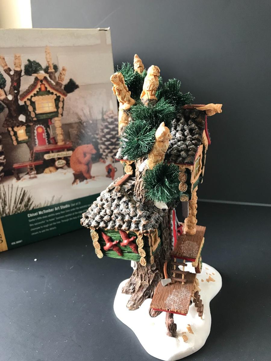 Chisel McTimber Art Studio - Department 56 - North Pole Woods. Figure and power adapter are missing. All Holiday items in this auction are as-seen. The client collected a lot of holiday pieces and some are new in box, some were displayed once and come with original box, and some have been displayed and come with no box. They are all pre-owned in some fashion and have been stored in an attic or on shelf in library. Please see all pictures. The pictures show condition, measurements if taken, and what is included in the lot. Due to the large amount that we photograph and the time frame, we are not always able to take measurements. All items unless noted, are pre-owned and have been used. Thank you