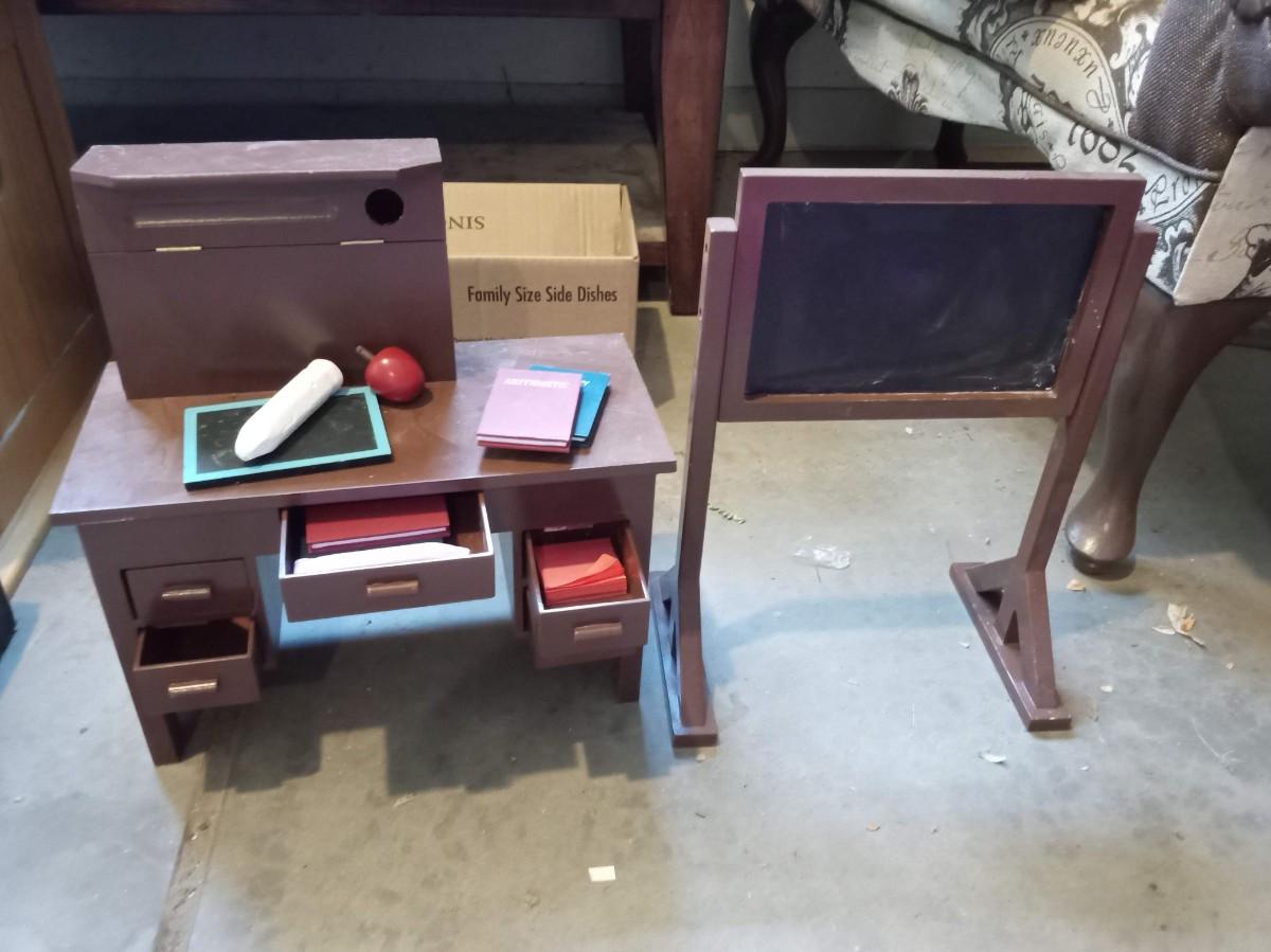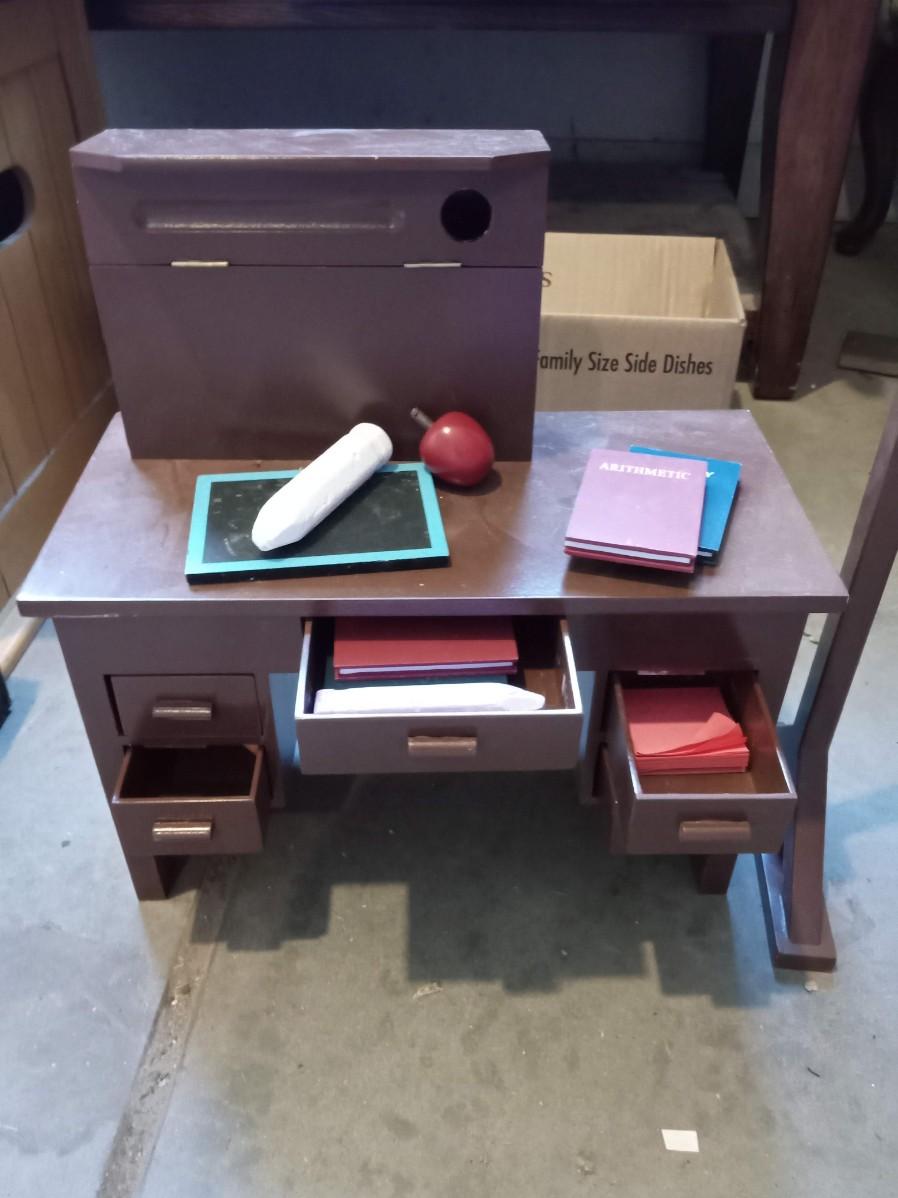 MAKE BELIEVE DOLL SIZE DESK IS 13" X 7" X 9" IT CONTAINS FAKE BOOKS, CHALK AND APPLES, IT HAS WORKING DRAWERS. THE CHALKBOARD IS FUNCTIONAL