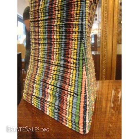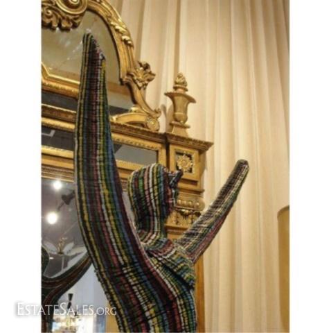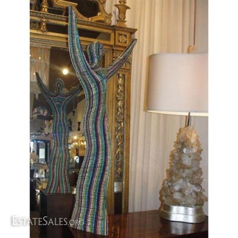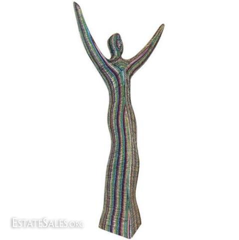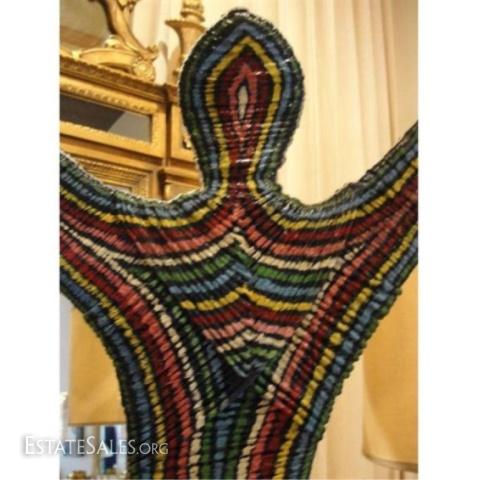 LOT 47C: LARGE GEORGE R BUCHER SCULPTURE, STYLIZED FIGURE IN MULTI COLOR ROPE, TITLED "OPEN ARMS" SIGNED, 48"H X 23"W X 10"D, SKU387.47