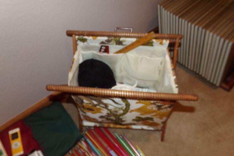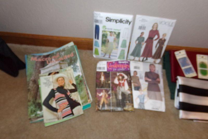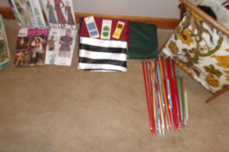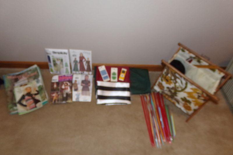 KNITTING NEEDLES AND BAG, FABRIC, PATTERNS, AND MORE