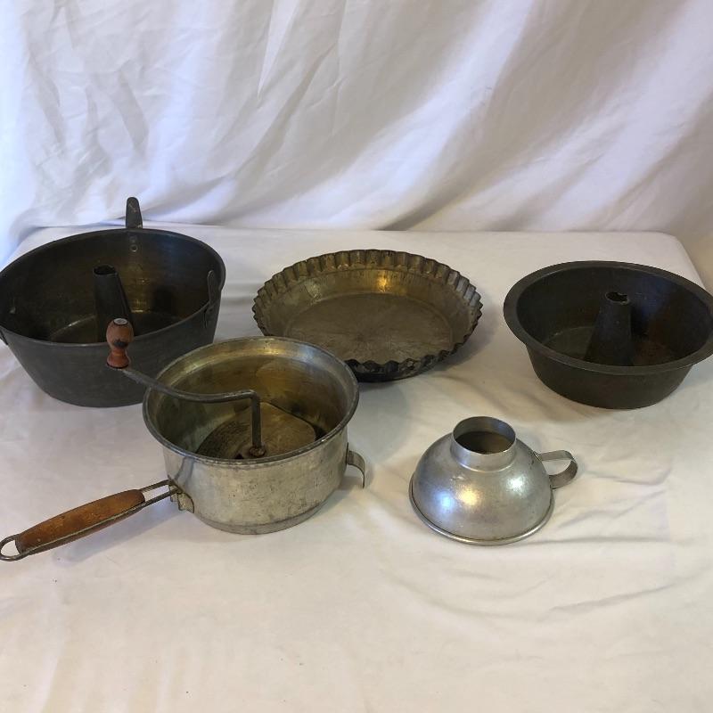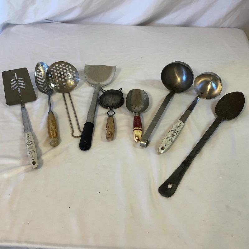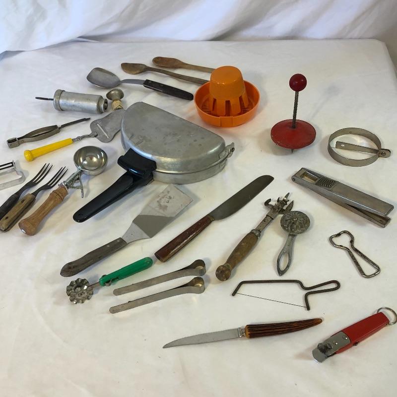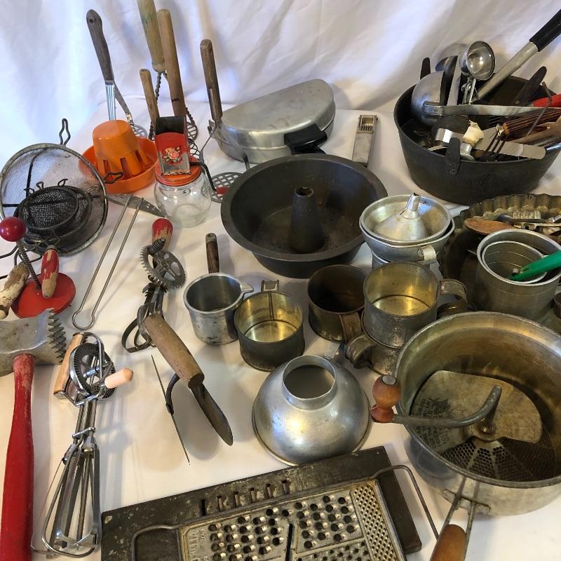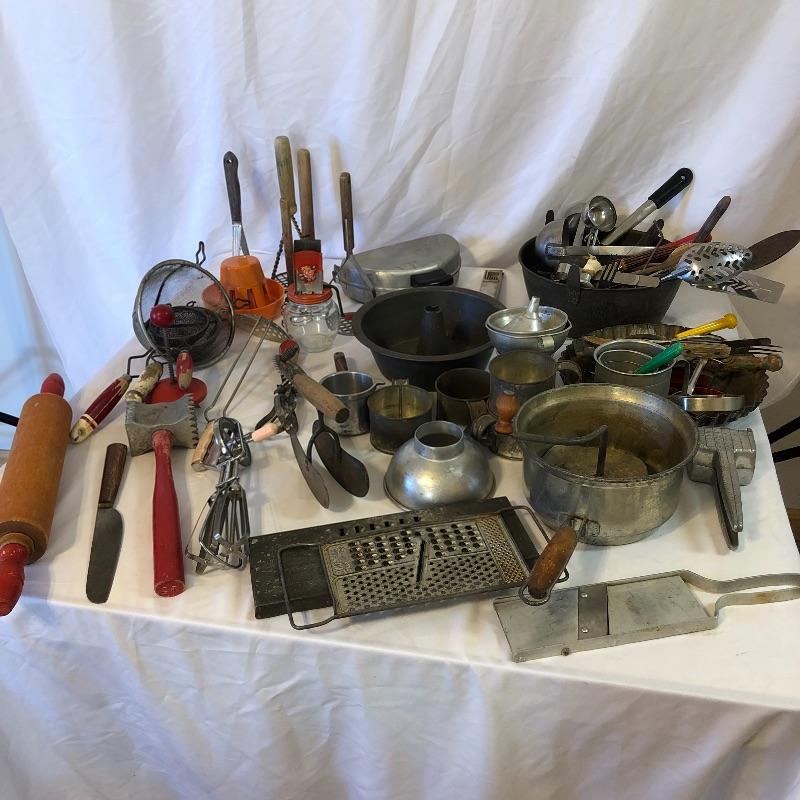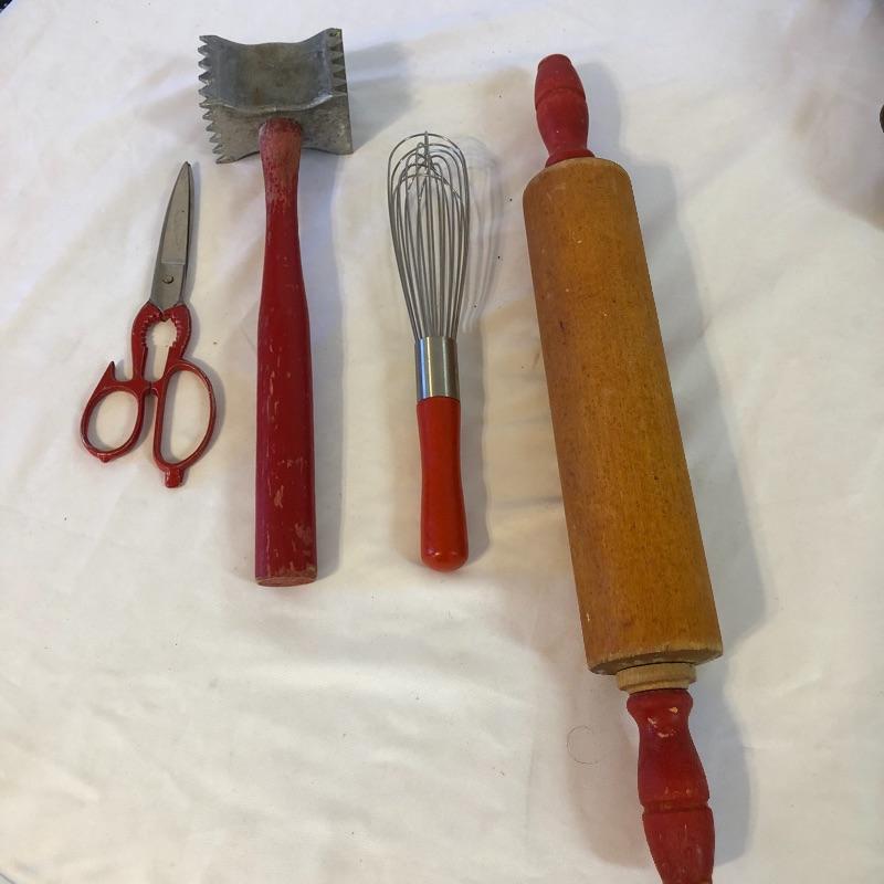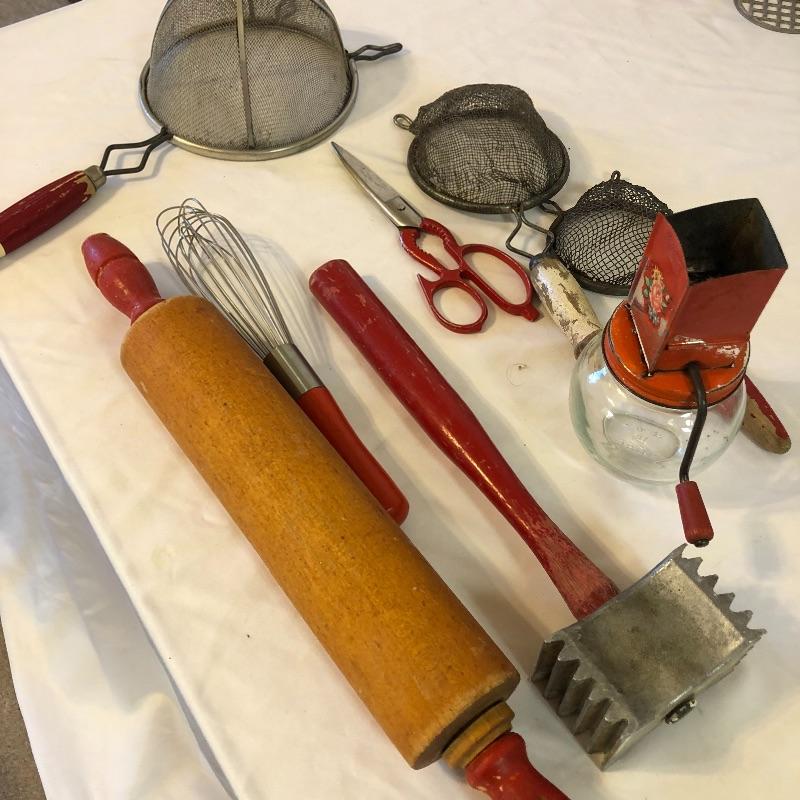 Relive the past with these nostalgic kitchen items! Lot includes baking pans, rolling pin, red handled utensils and much, much more! Shipping available.