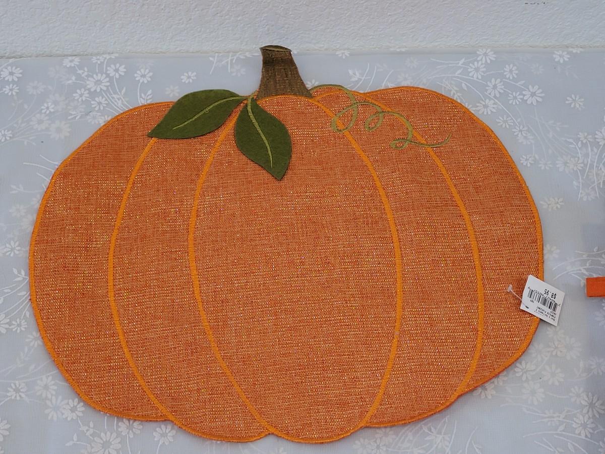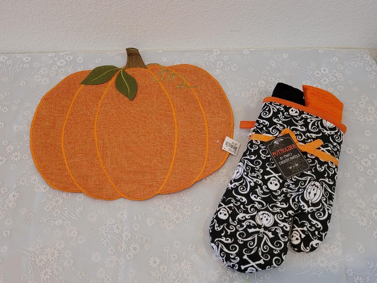 Lot 48: Pumpkin Table Mat and Oven Mit and (2) Distowels
