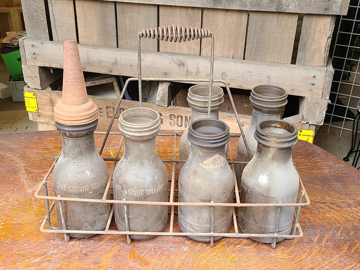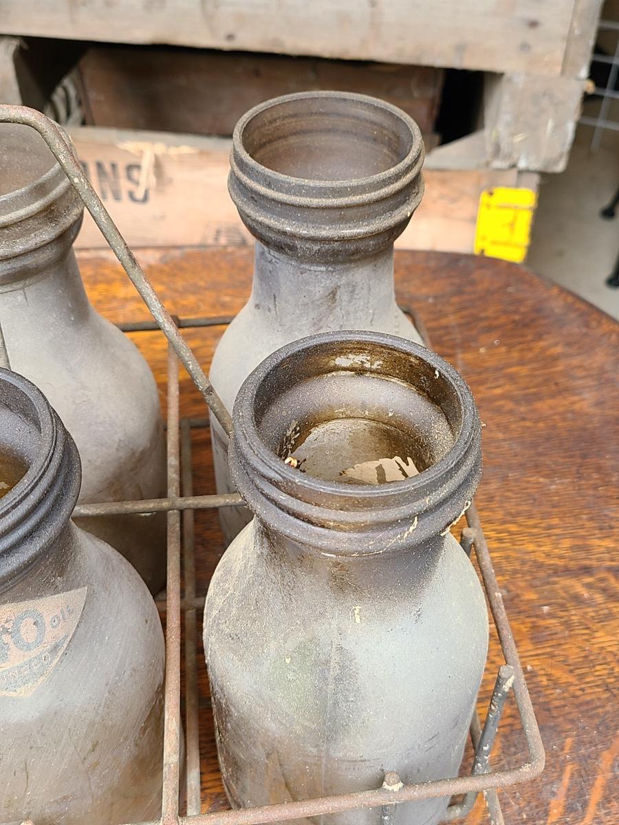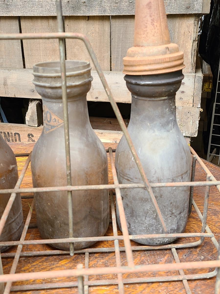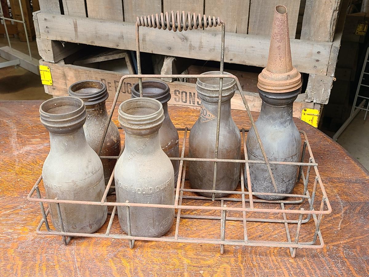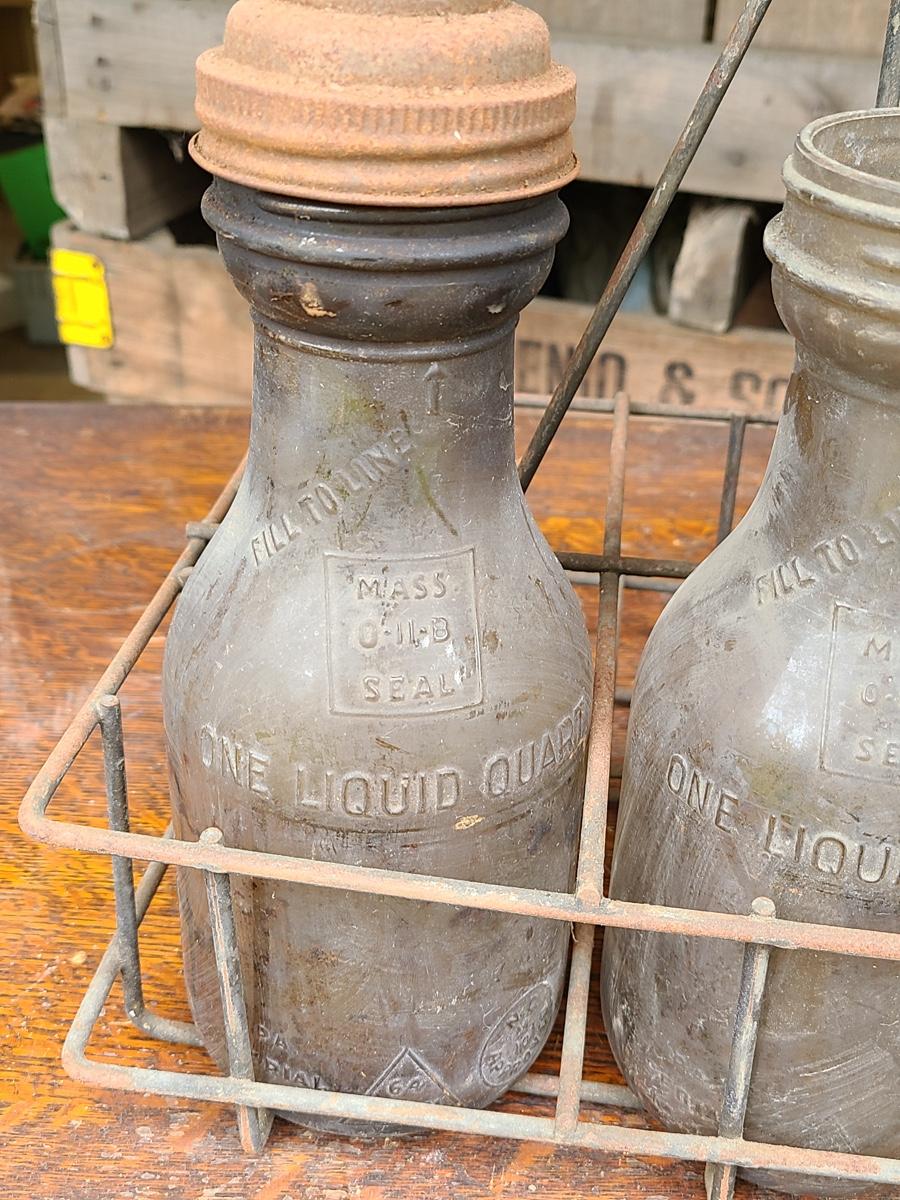 Lot 483: Vintage/Antique Oil Bottles (Sunoco stickers) and Carry Cage