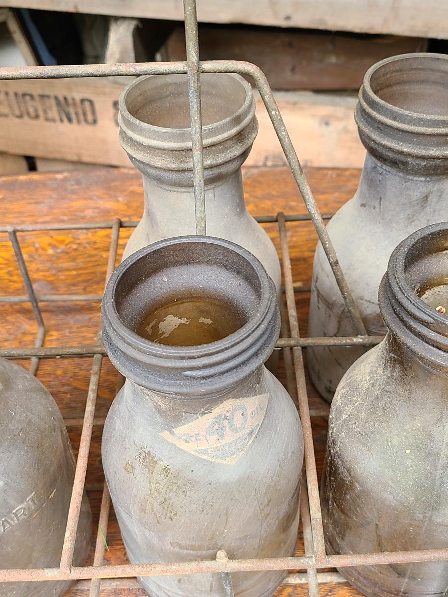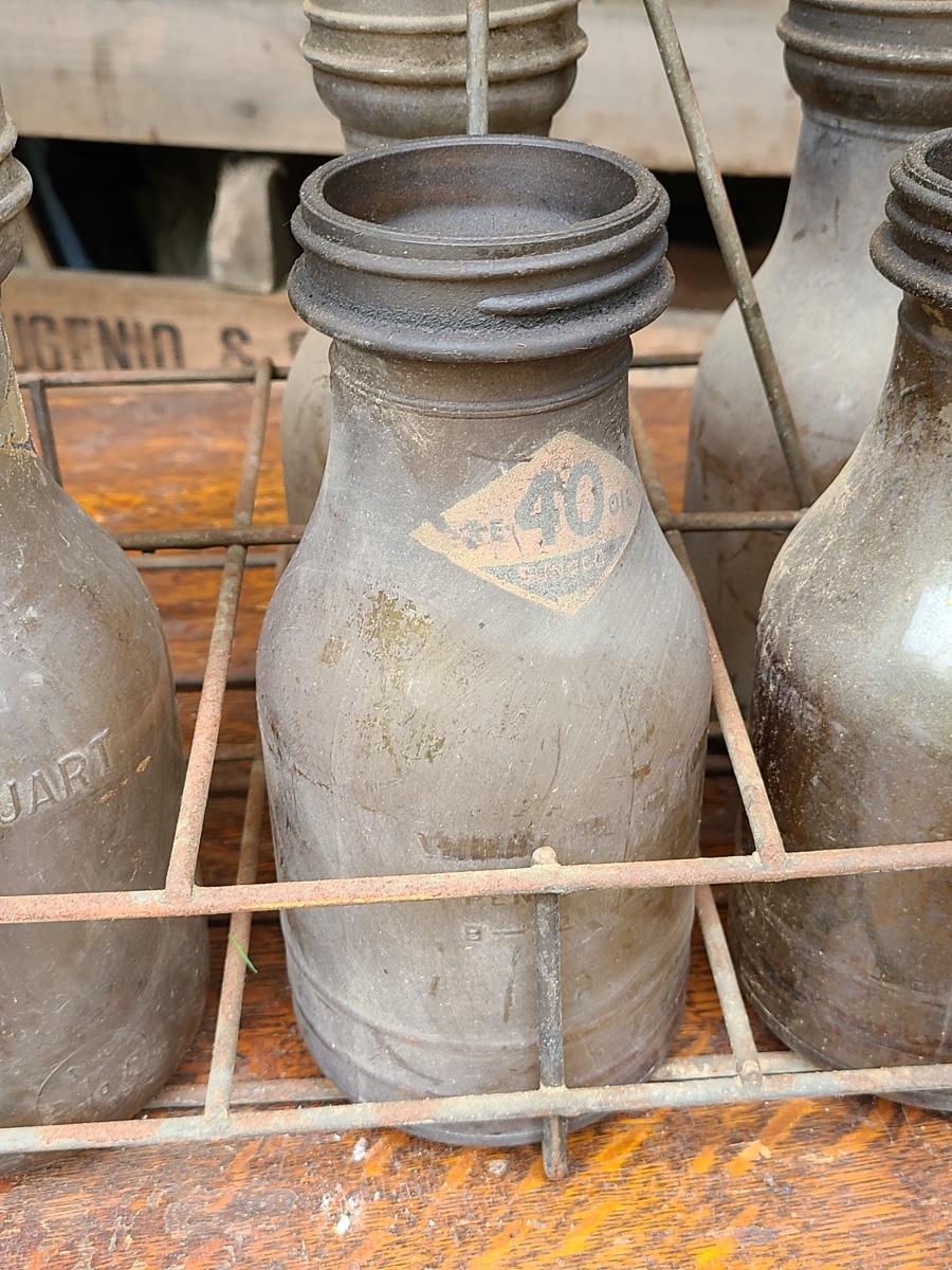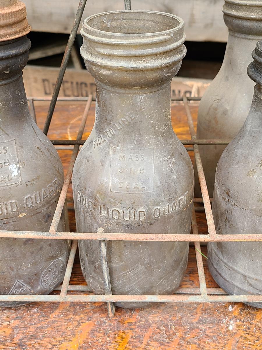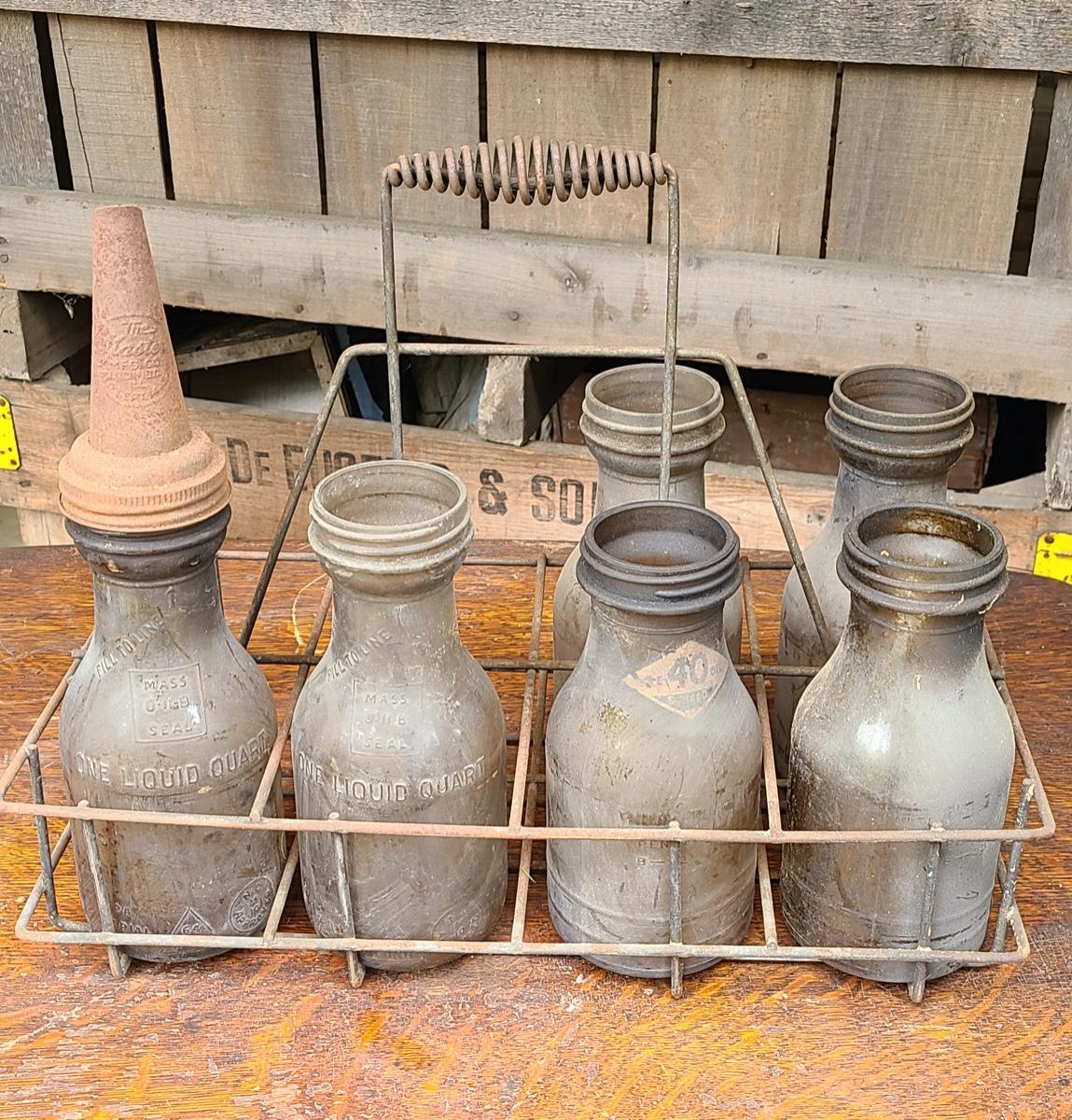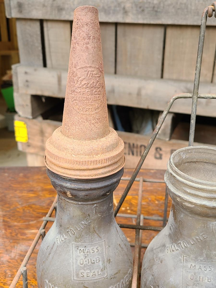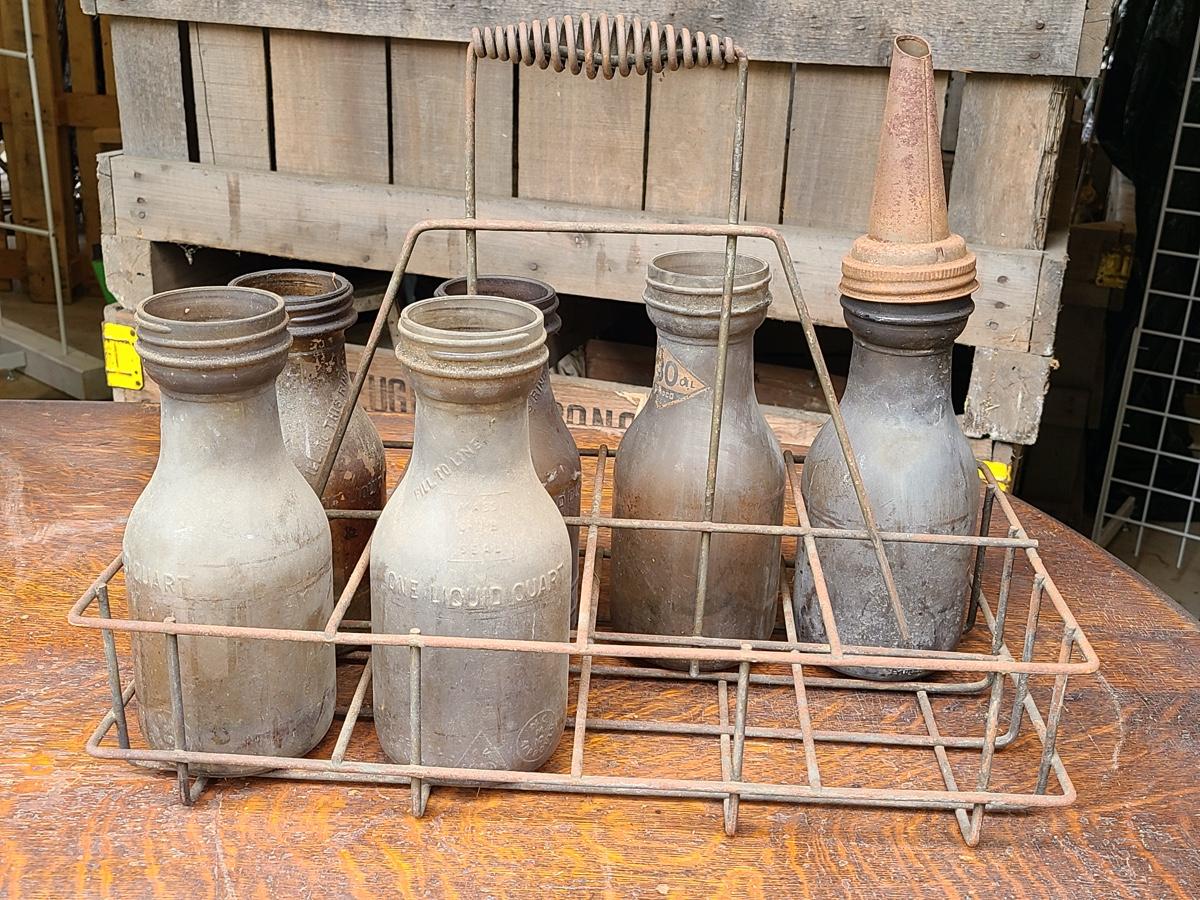 Lot 483: Vintage/Antique Oil Bottles (Sunoco stickers) and Carry Cage