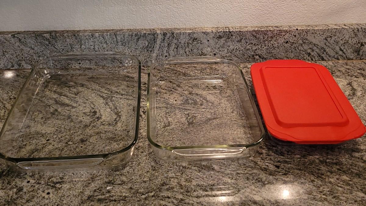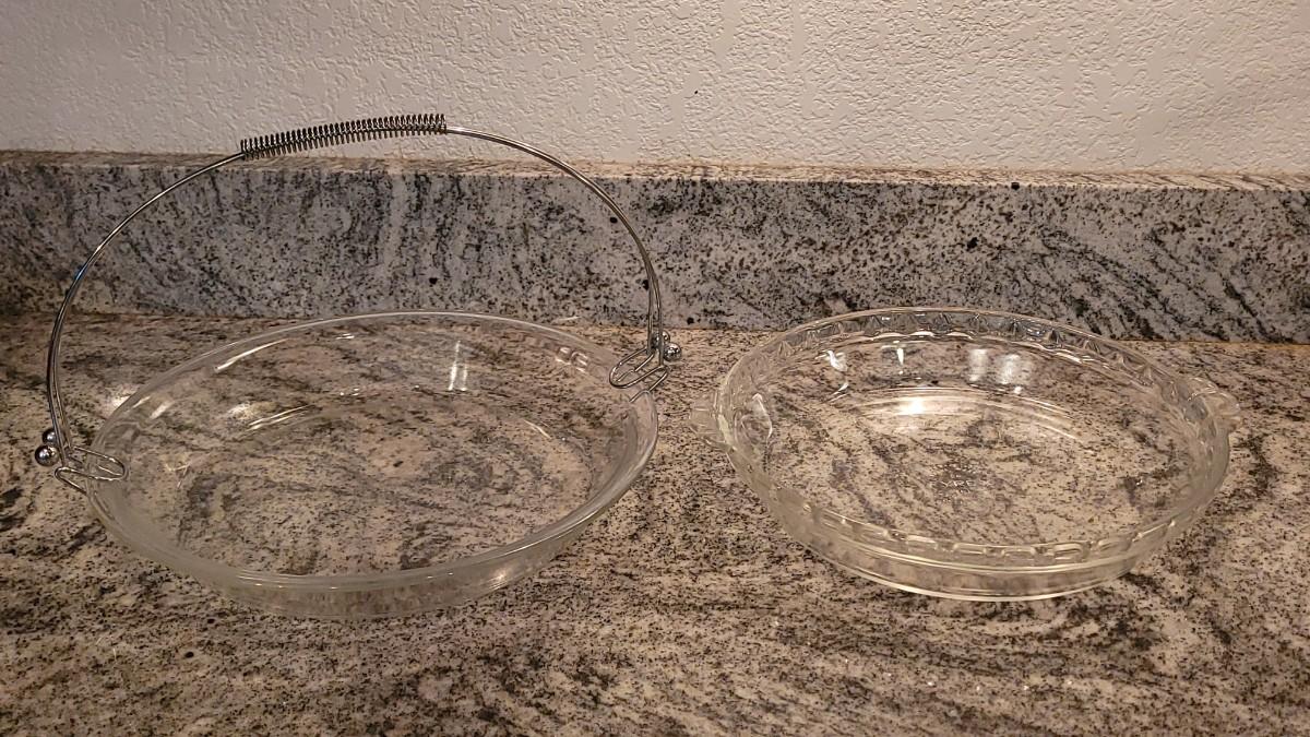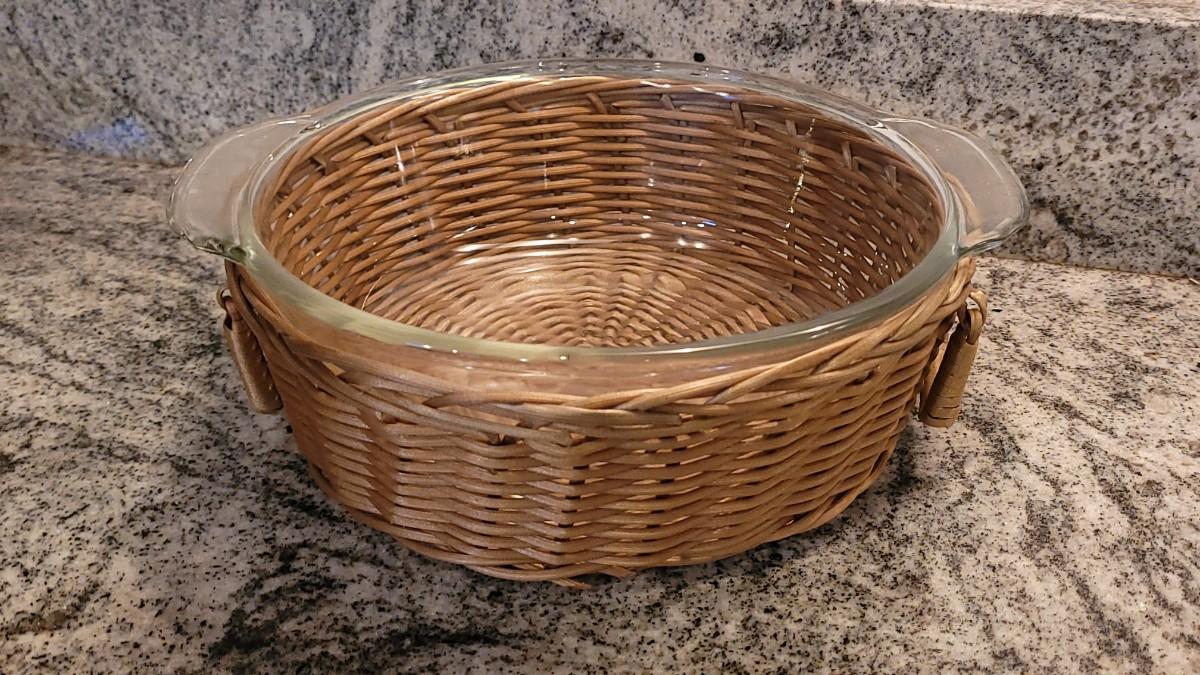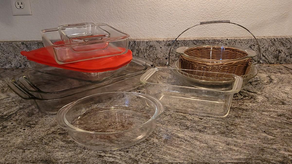 Lot 48: PYREX Casserole Dishes & Pie Plates with Attachable Handle and Basket