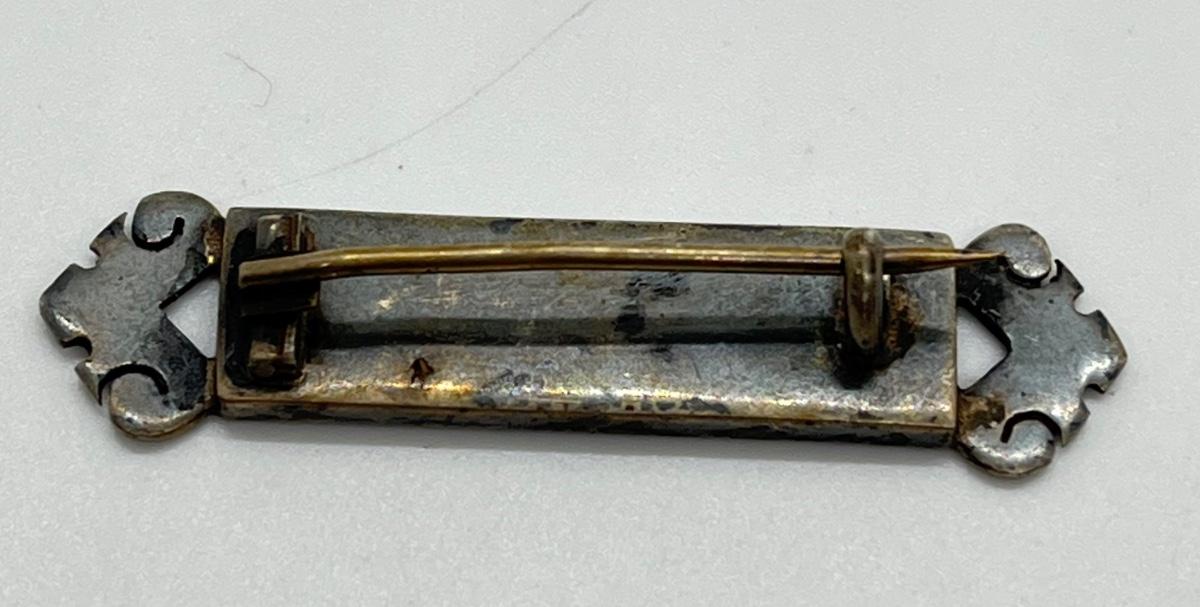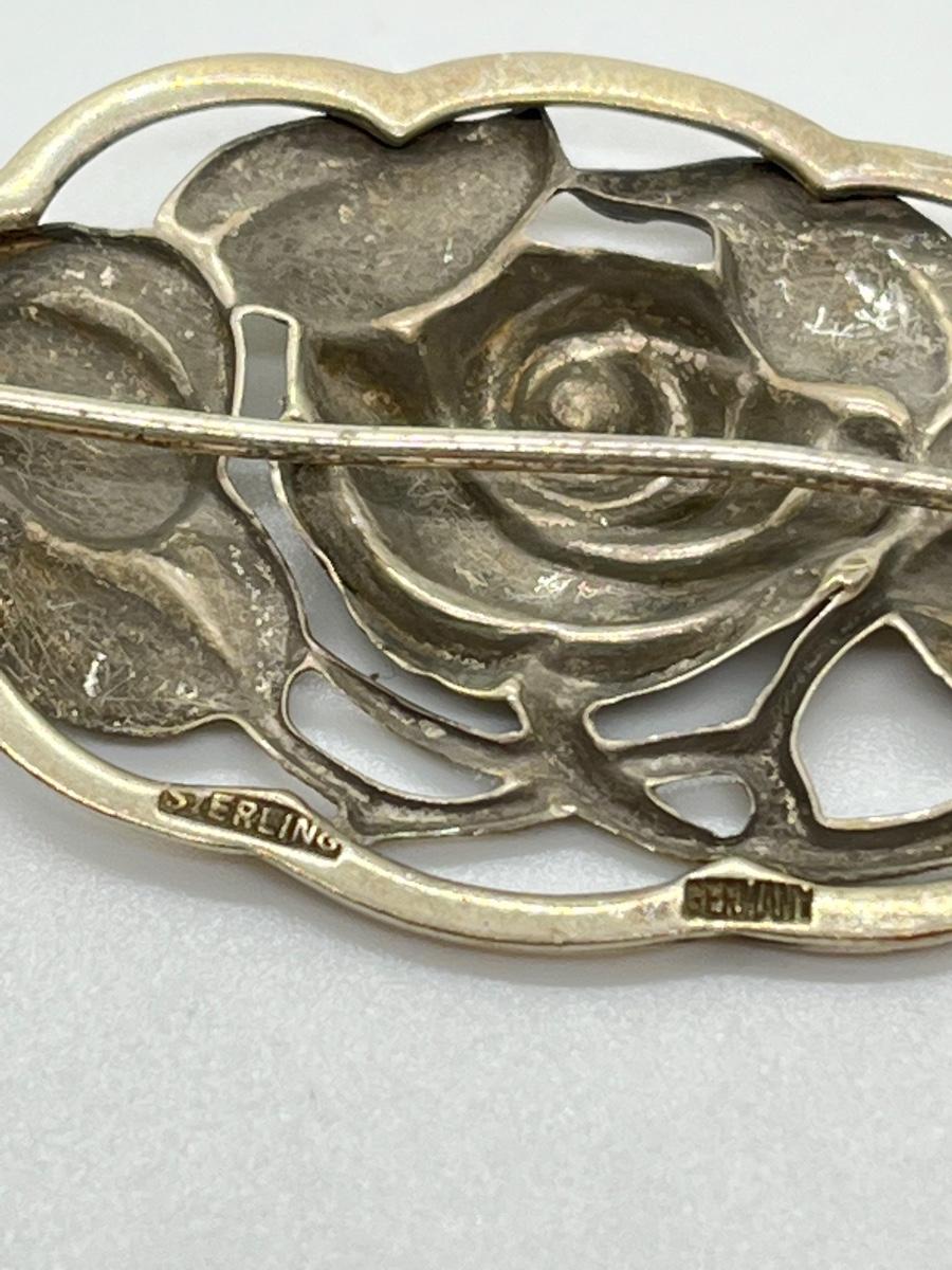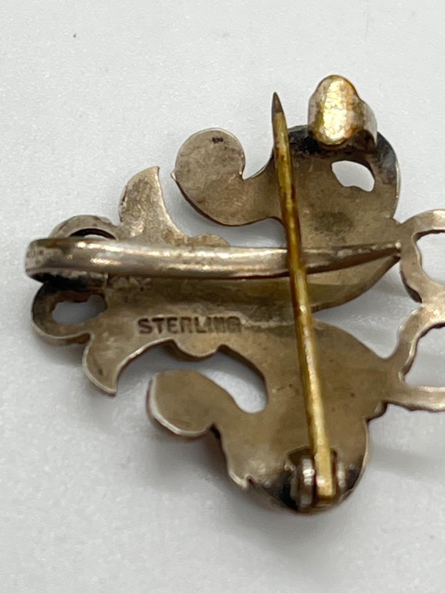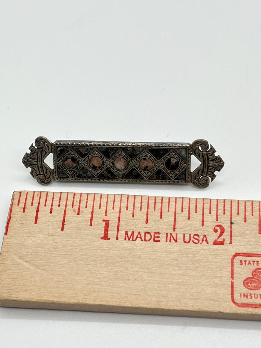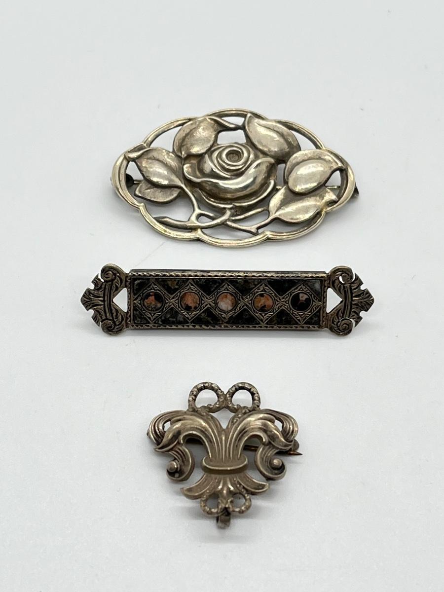 LOT 48: Sterling Silver Pins - Watch Holder, Rose Leaf Made in Germany & Antique Bar Pin Inlaid with Pink Agate