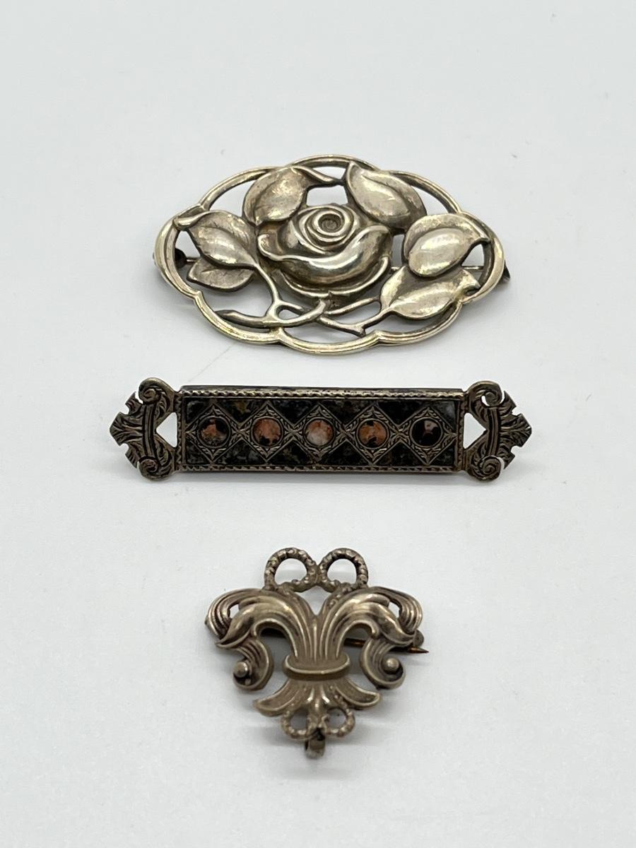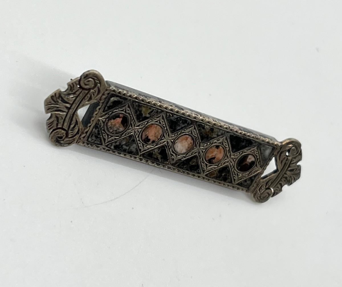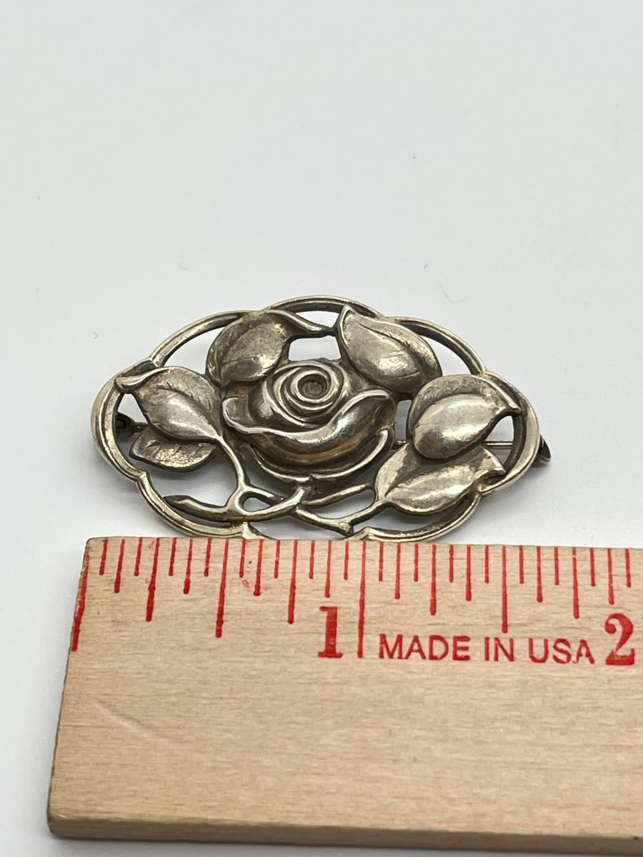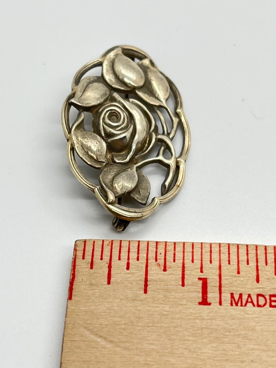LOT 48: Sterling Silver Pins - Watch Holder, Rose Leaf Made in Germany & Antique Bar Pin Inlaid with Pink Agate