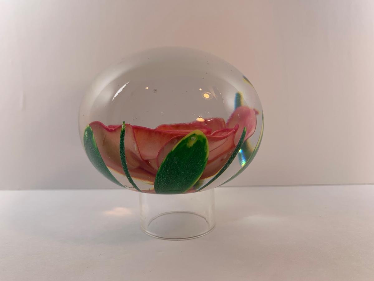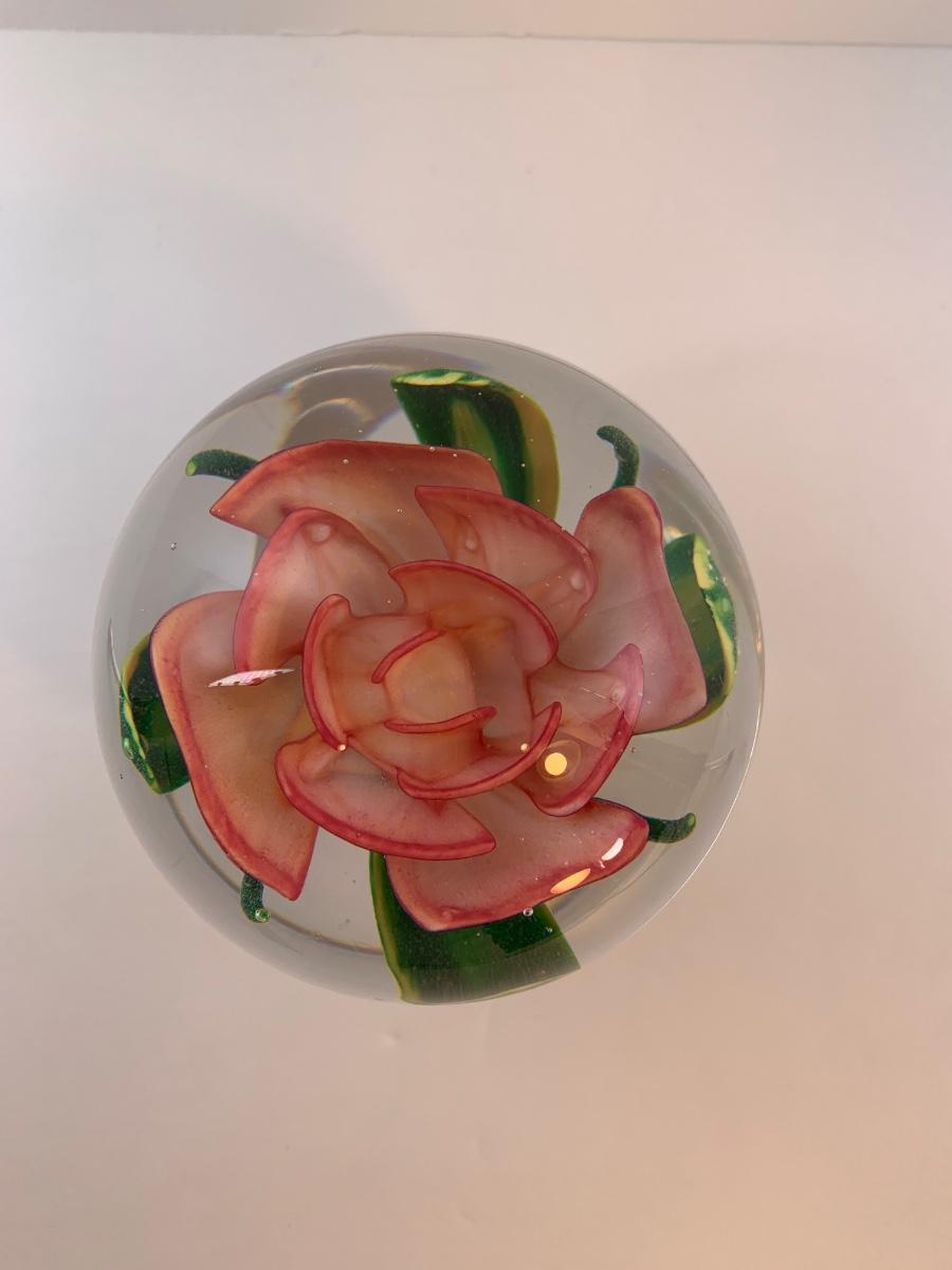 Pairpoint light pink crimp rose with green leaves. Signed on bottom edge "P", 3 1/2" x 2 1/2"