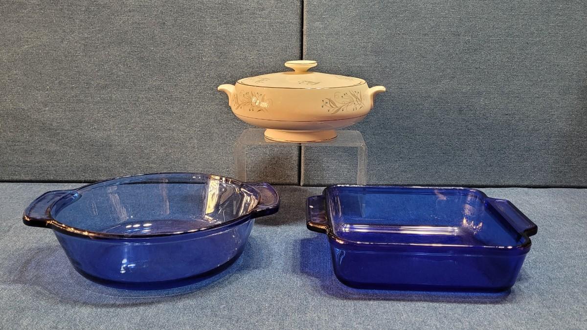 Lot 48: Cover Dish and (2) Blue Anchor Casserole Dishes