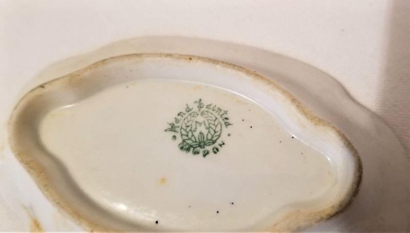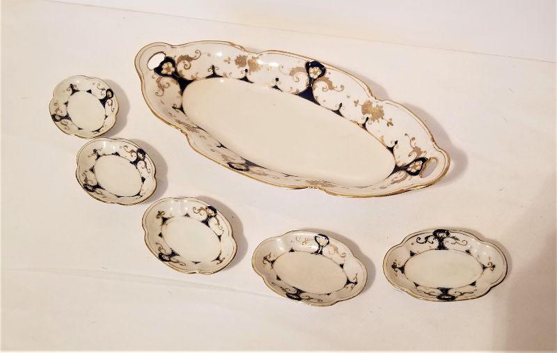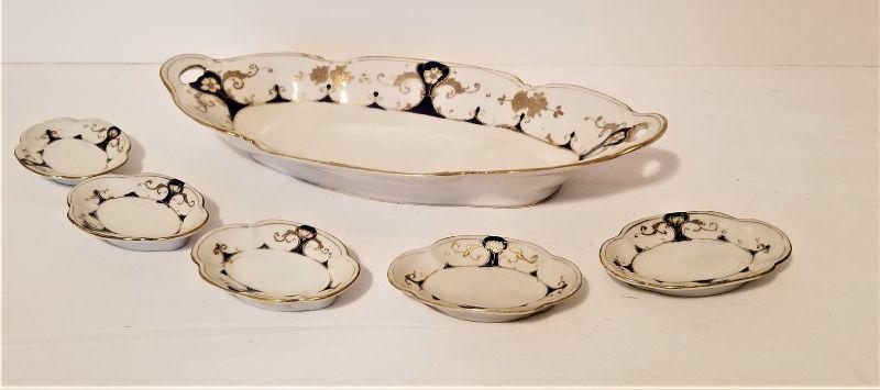 Sweet antique serving set - large bowl with 5 smaller matching pieces. Green "Nippon" mark. Larger bowl is 12" long and 5.5" across. Smaller pieces are 3.5" long. One has a small chip to the edge. Ca. 1920.
