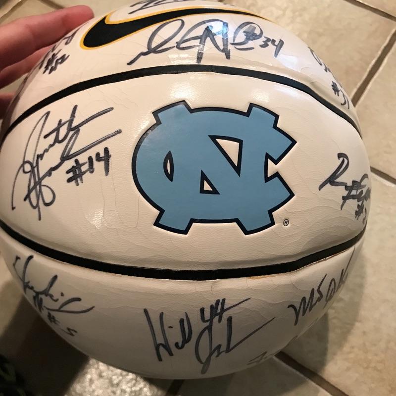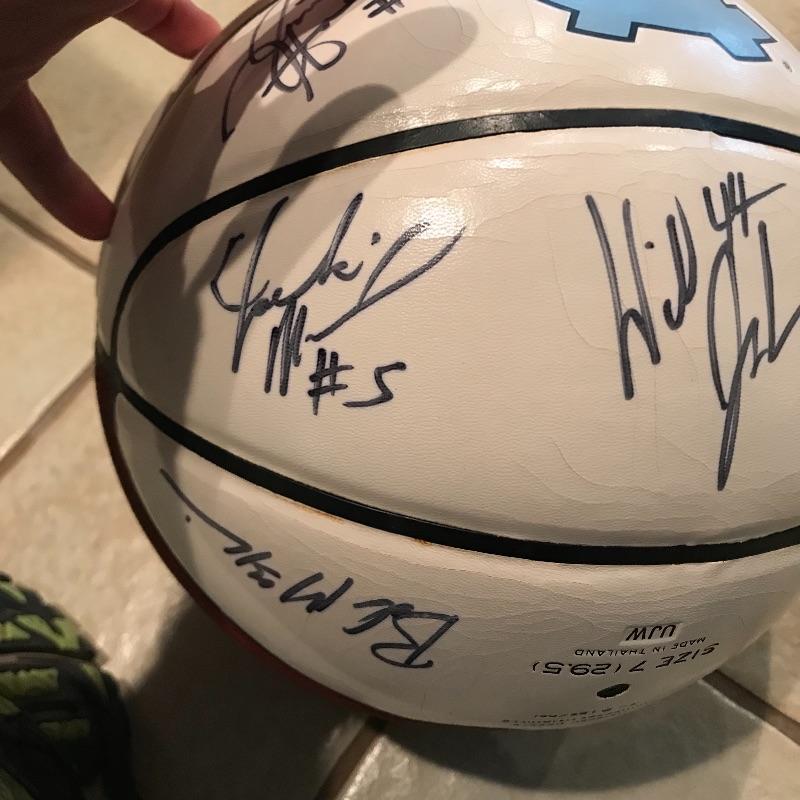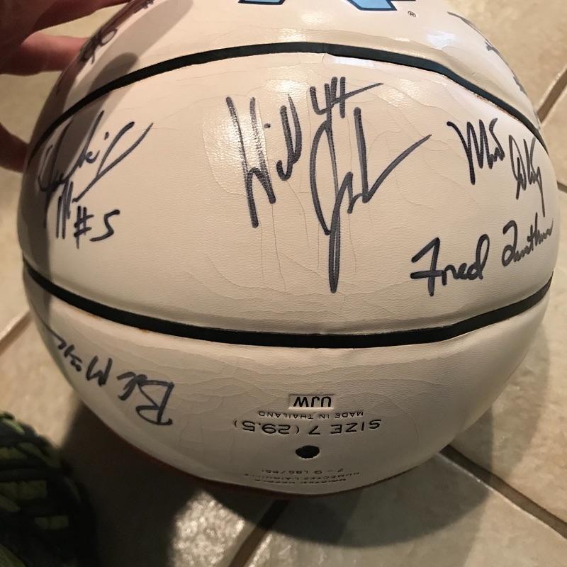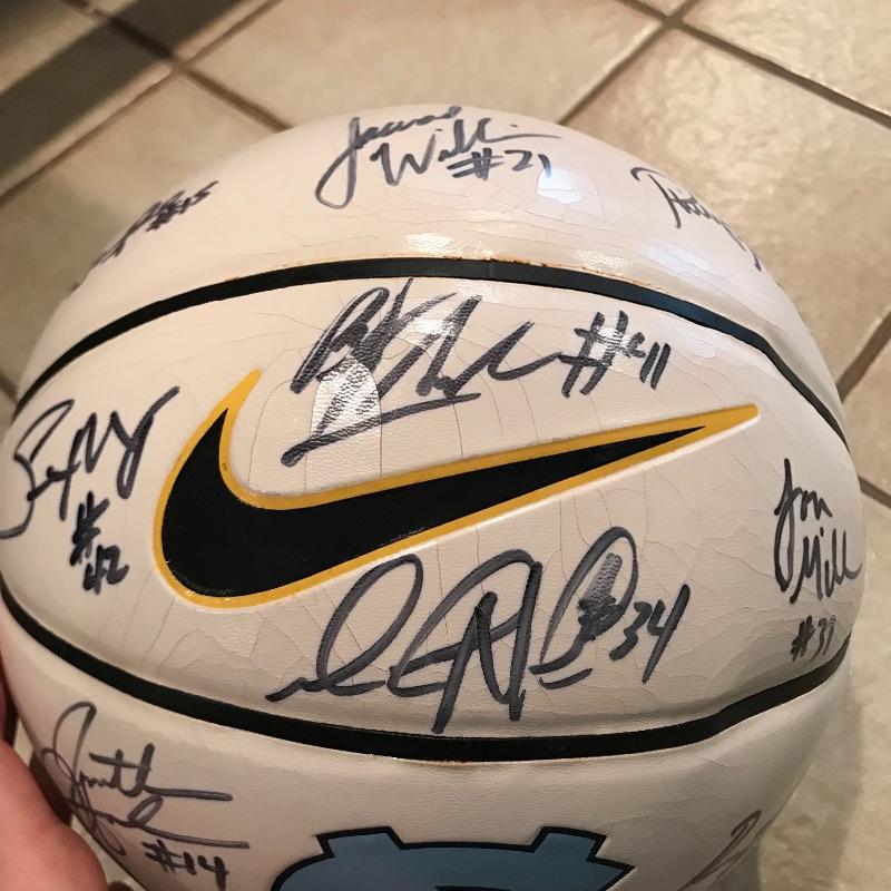 Lot includes signed UNC Tar Heels white leather basketball. Based on names we assume it’s from the 2001-2002 season. Signatures include Adam Boone, Orlando Menéndez, Jasón Capel, Brian Bersticker, Brian Morrison and more. No COA. Shipping available.