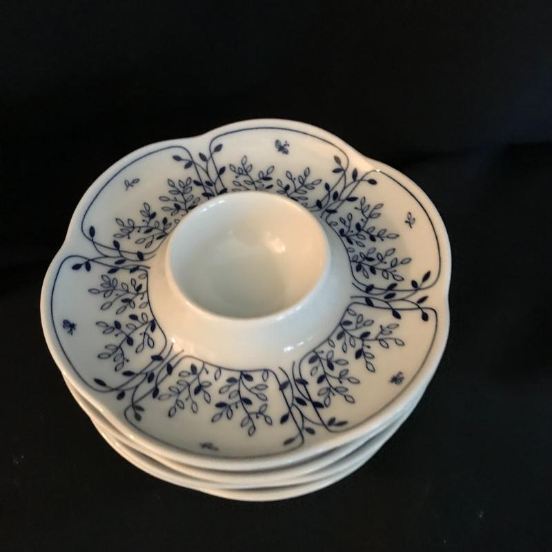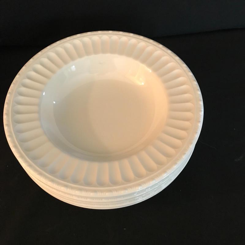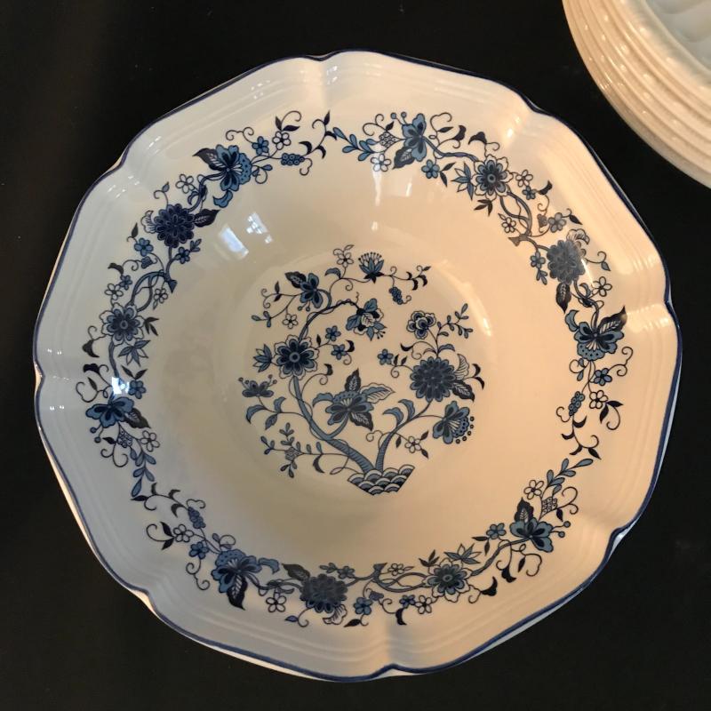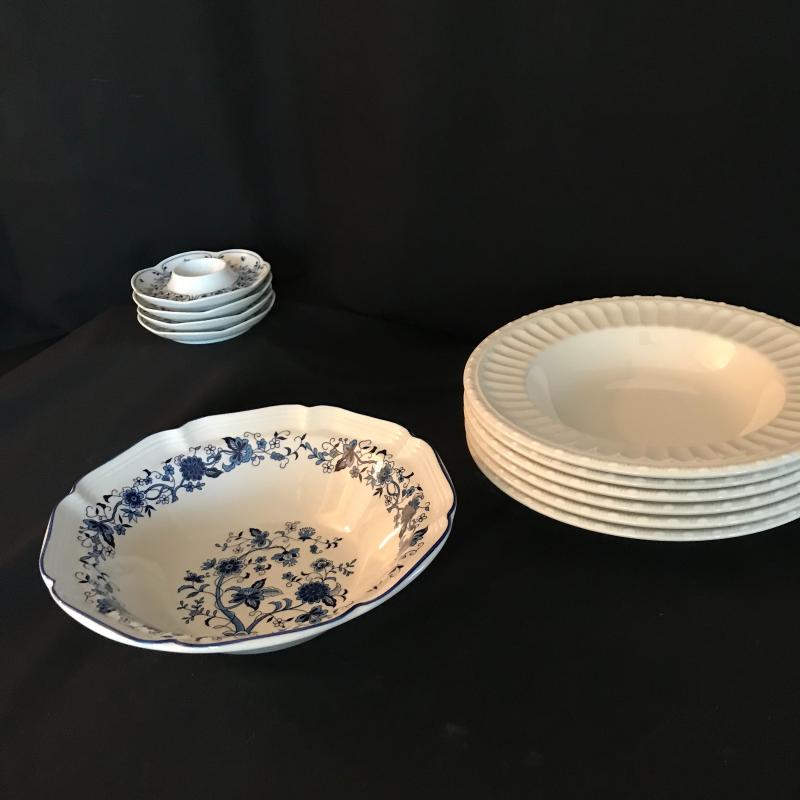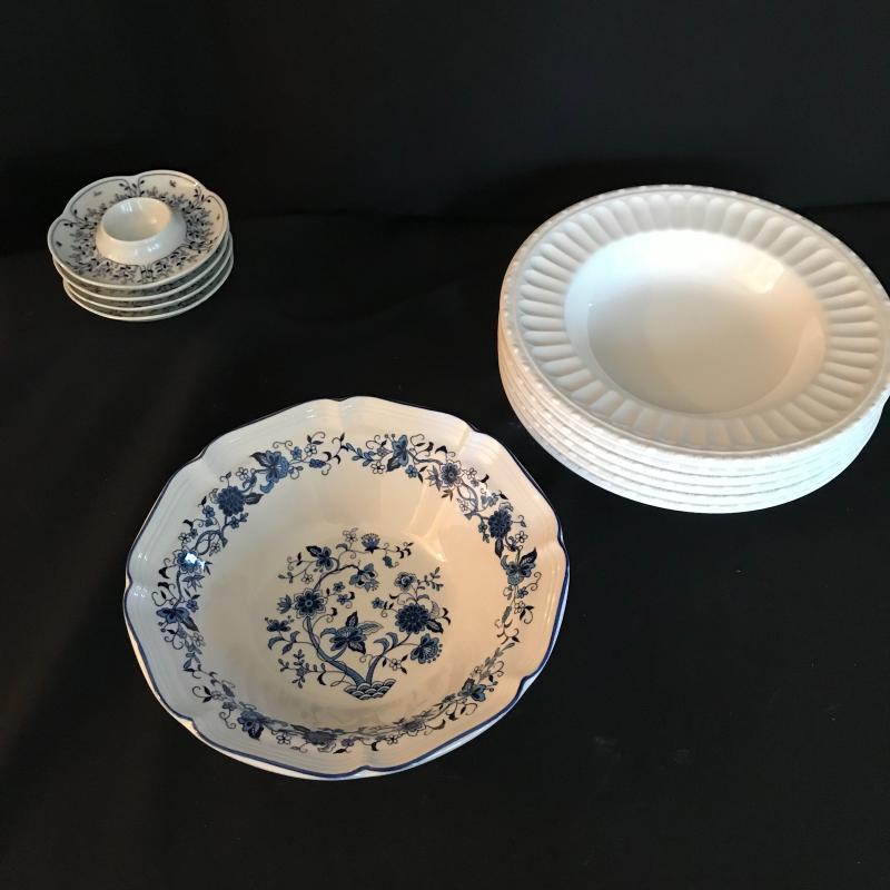 One Hankook service bowl in blue and white, set of 6 white Palazzo stew dishes, and 4 blue and white egg dishes. This lot is available for shipping or local pick up in Flat Rock, NC.