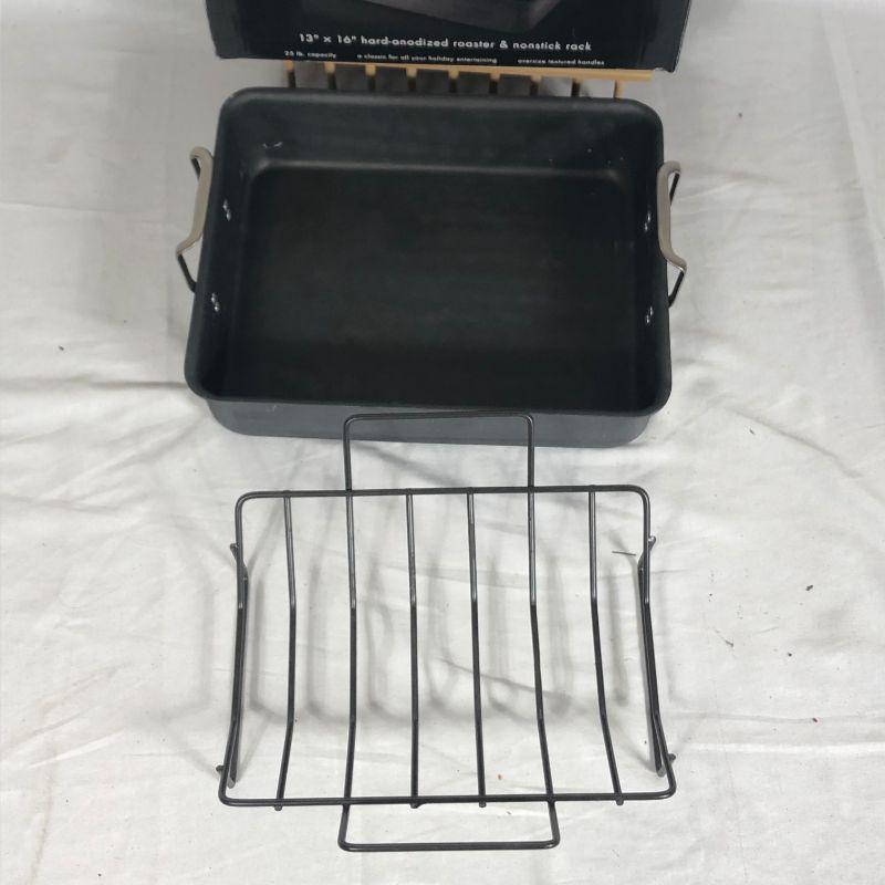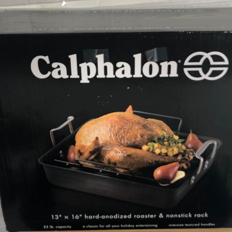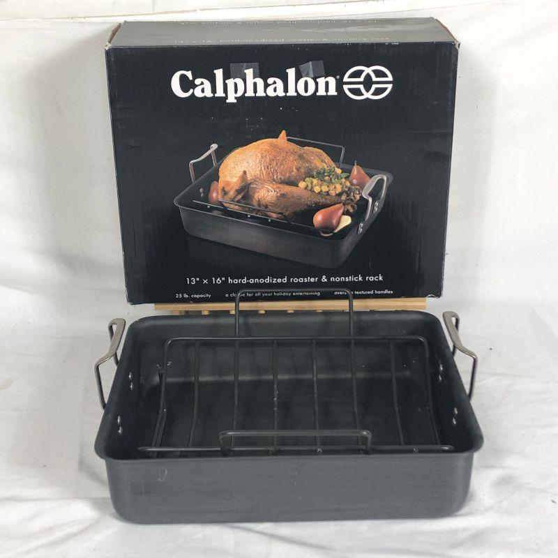 Only used once, with original box. 25lb capacity Calphalon roasting pan with rack. Measures 16" x 13".