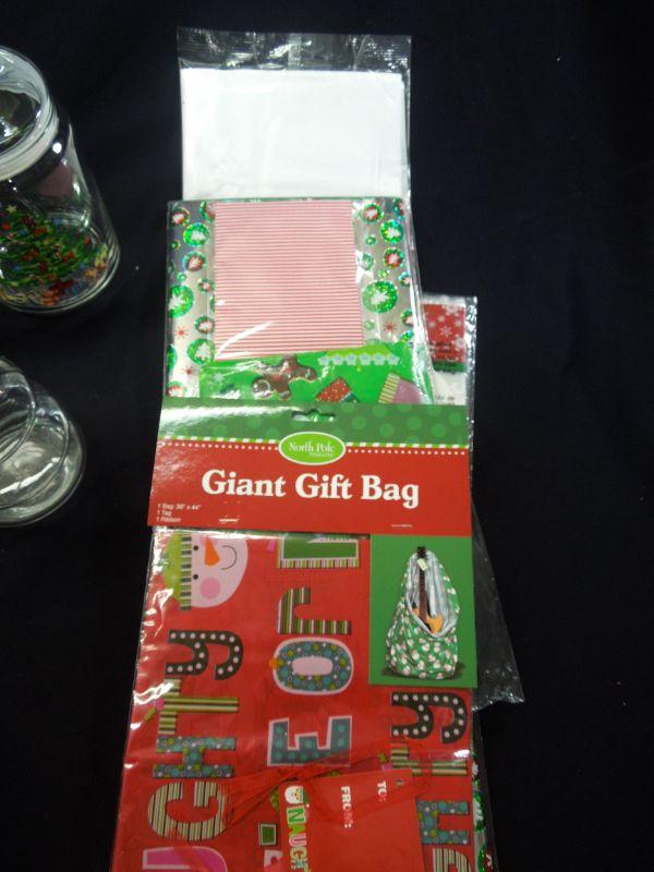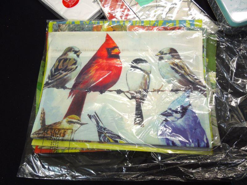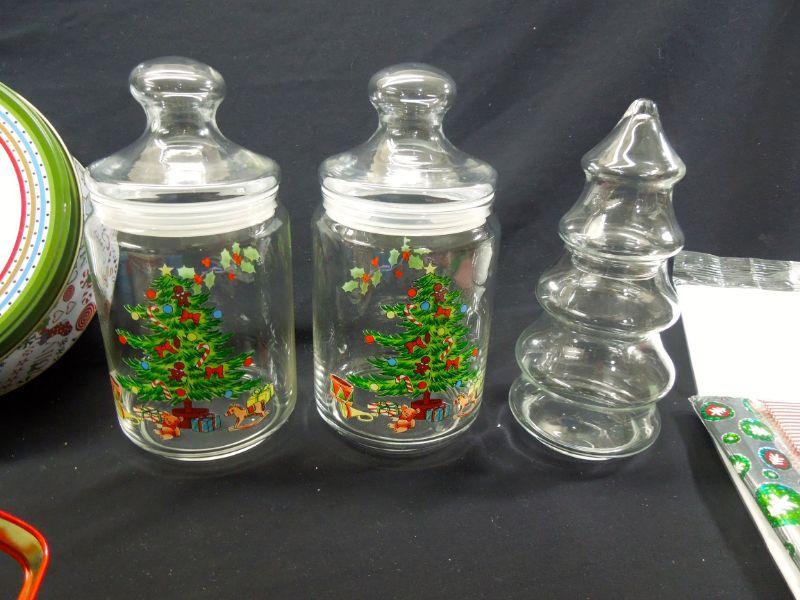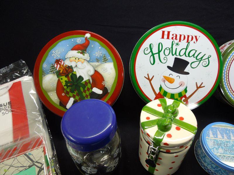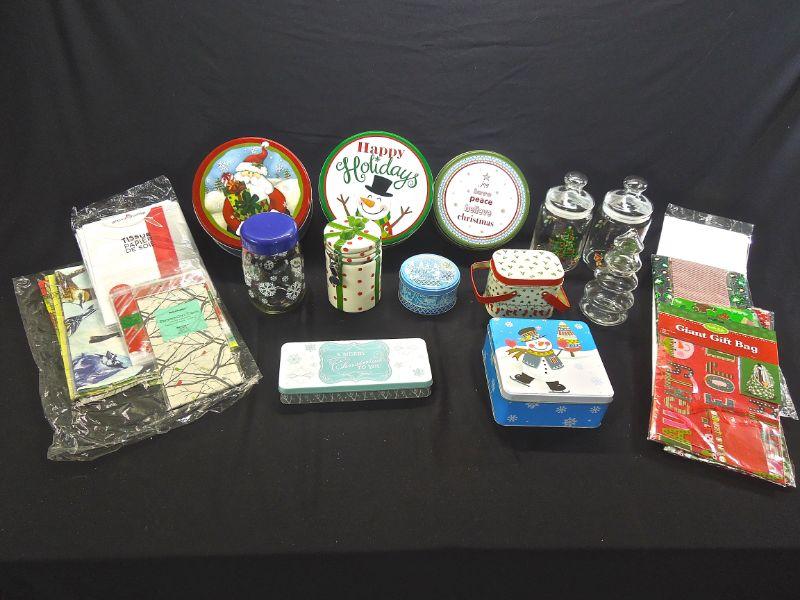 7 tins; 4 candy jars; a ceramic canister; a bird banner; many packs of unopened christmas tissue and gift bags.