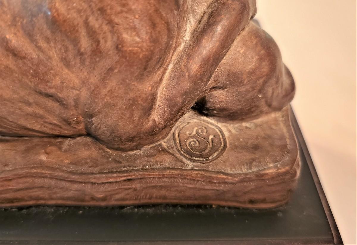 This piece has a foundry mark that we could not identify. Contemporary piece - Dog with cats - cast metal on a laminate base. 5.5" tall, 7.25" across at the base. A magnet won't stick. Heavy, but I don't think it's bronze. You be the judge.