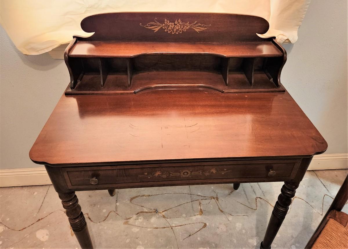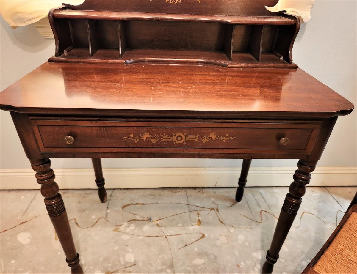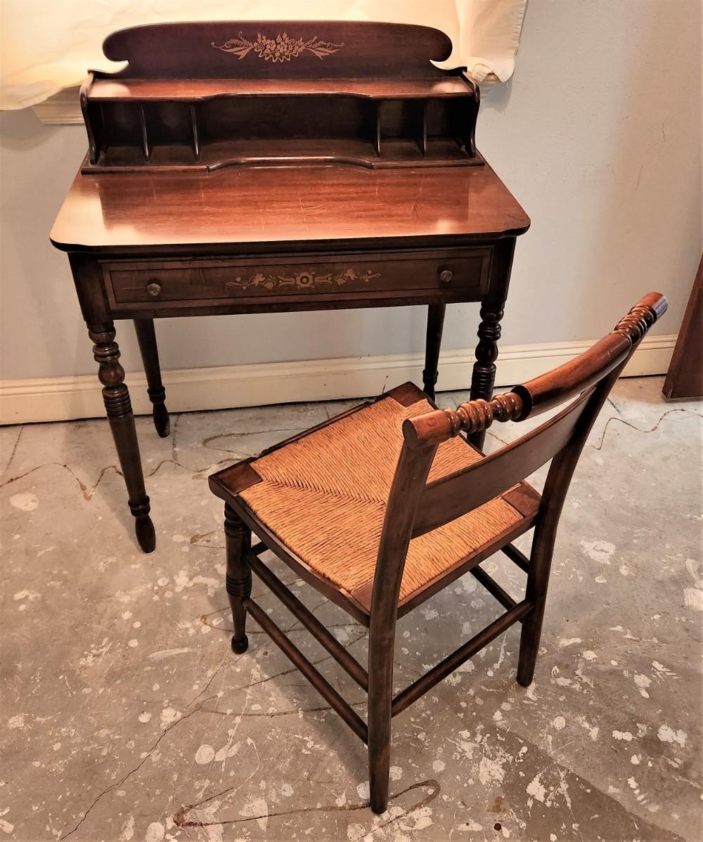 Vintage Dixie Furniture Company Ladies' Desk with rush bottomed chair - desk has one drawer, vintage condition, 19.5" deep, 32" across, 40" tall at the back. Chair is 18" across, 34" tall - great condition/quite sturdy. .
