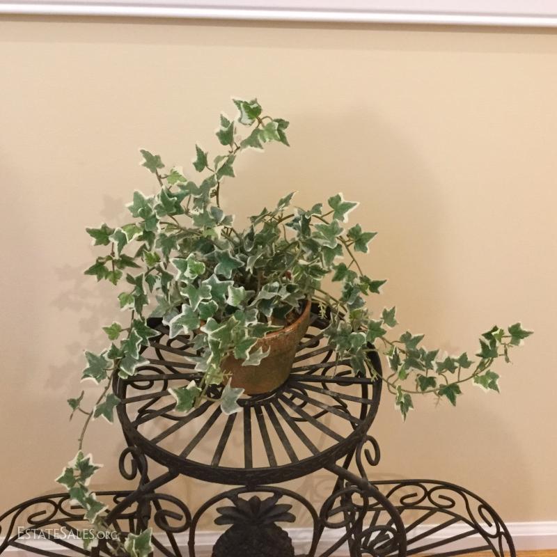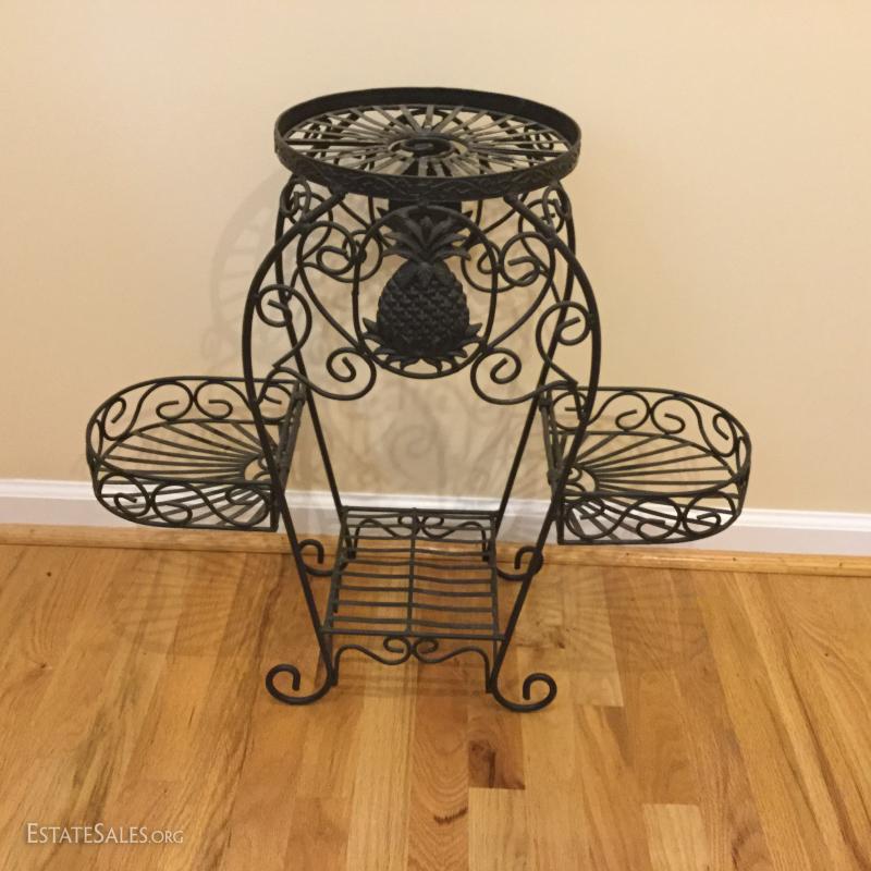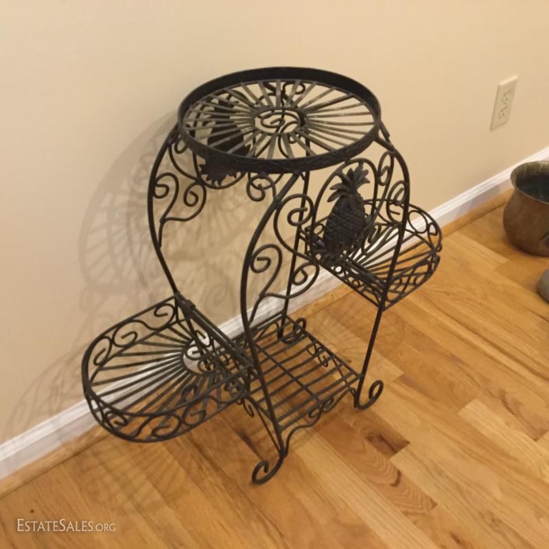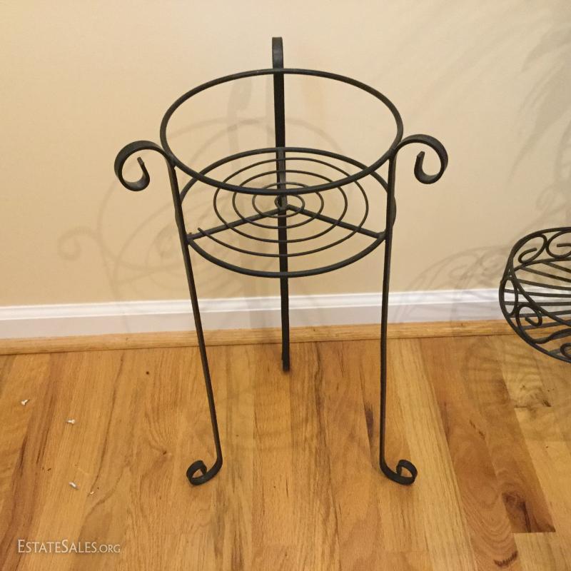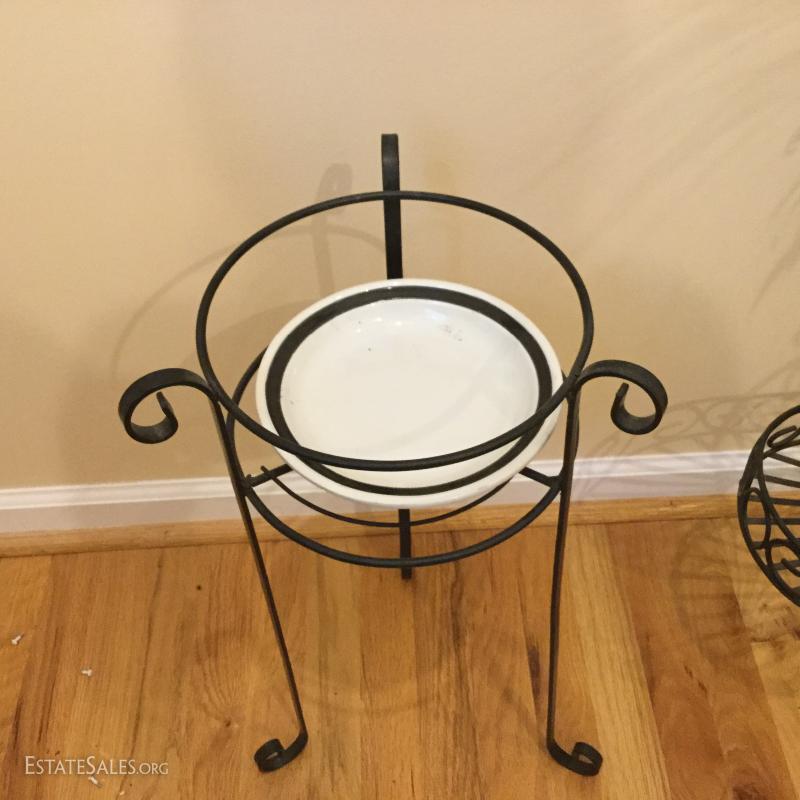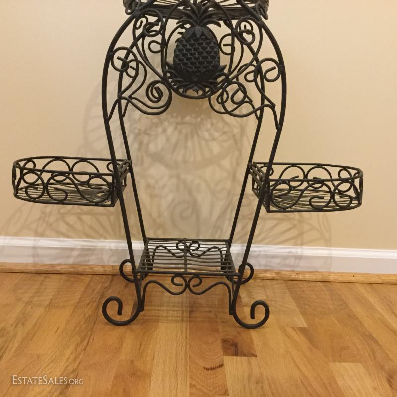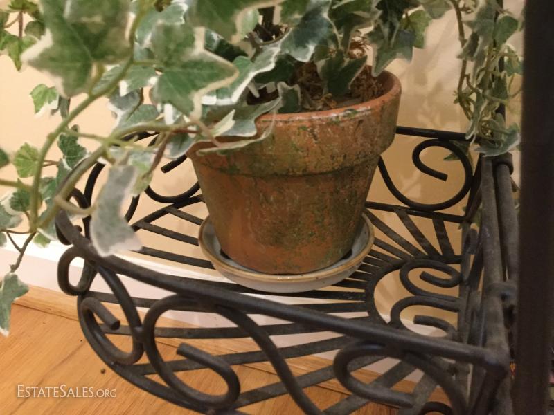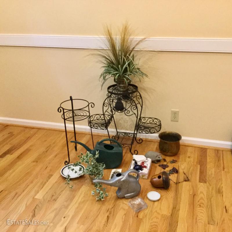 Large metal garden plant holder, 27"l x 9"w x 24"tall. Smaller plant stand is 21" tall. Gorgeous blown glass hummingbird feeder. Wooden acorn bird feeder. Plastic watering cans. A few artificial plants and more. See pictures.
