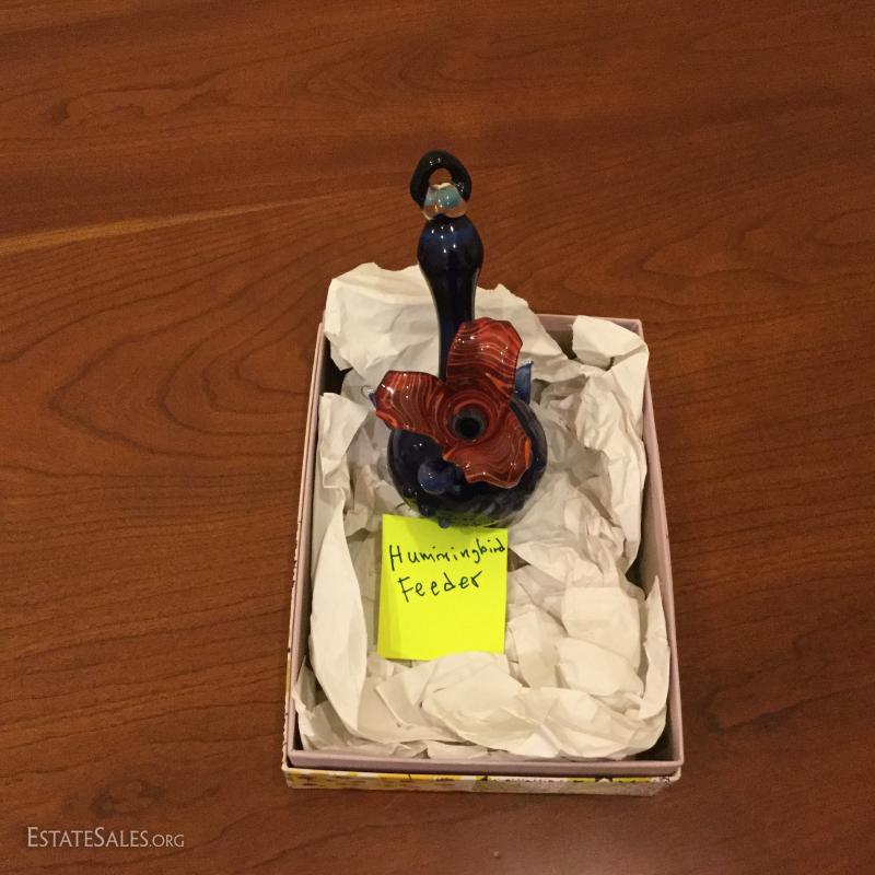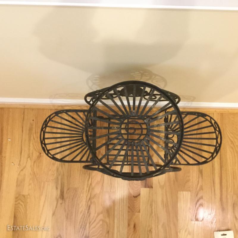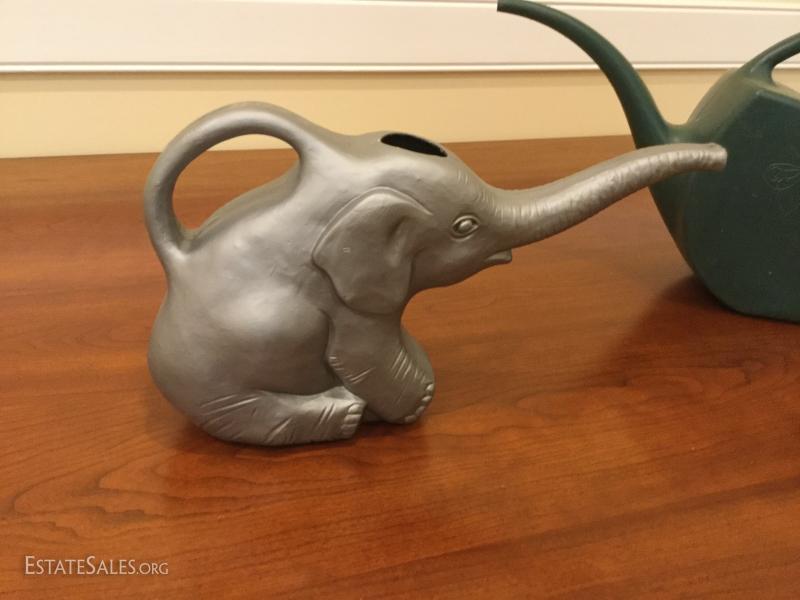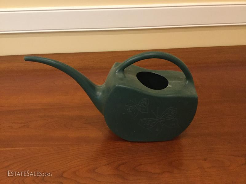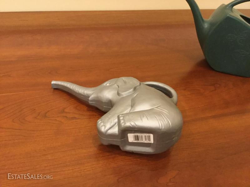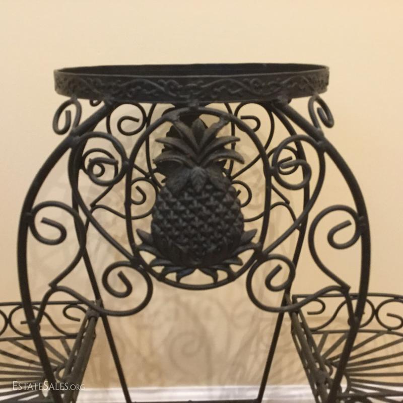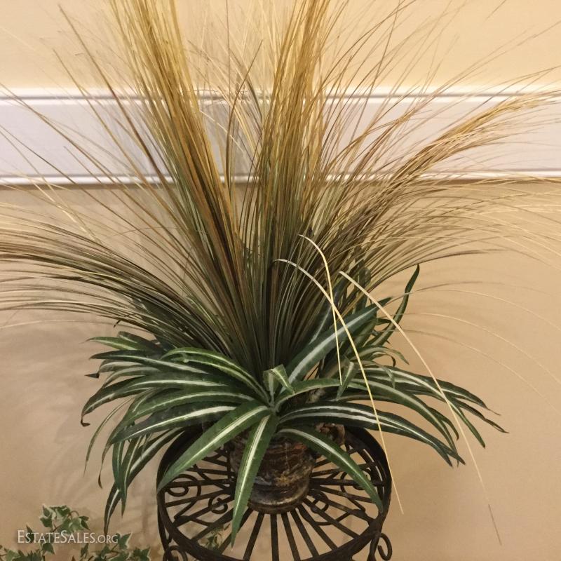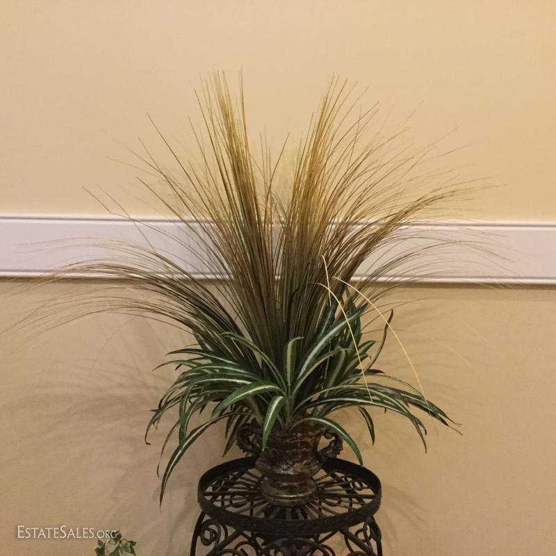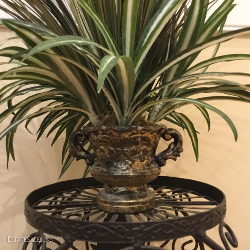Large metal garden plant holder, 27"l x 9"w x 24"tall. Smaller plant stand is 21" tall. Gorgeous blown glass hummingbird feeder. Wooden acorn bird feeder. Plastic watering cans. A few artificial plants and more. See pictures.