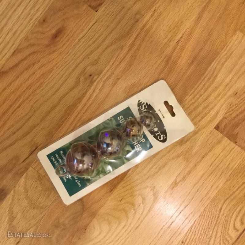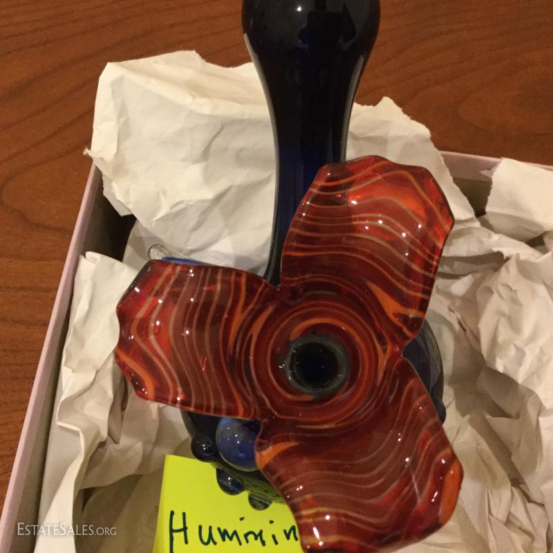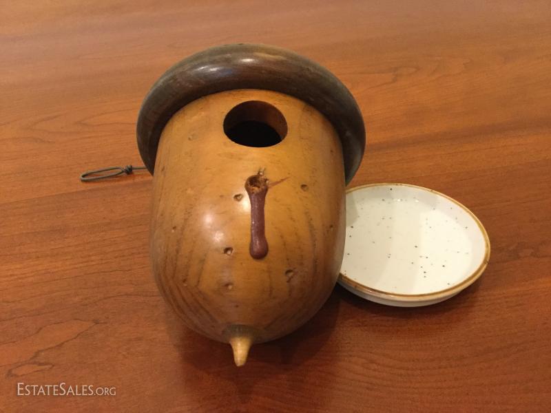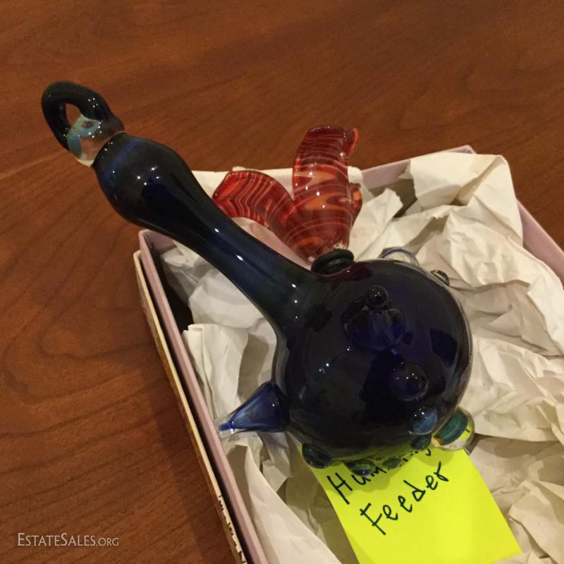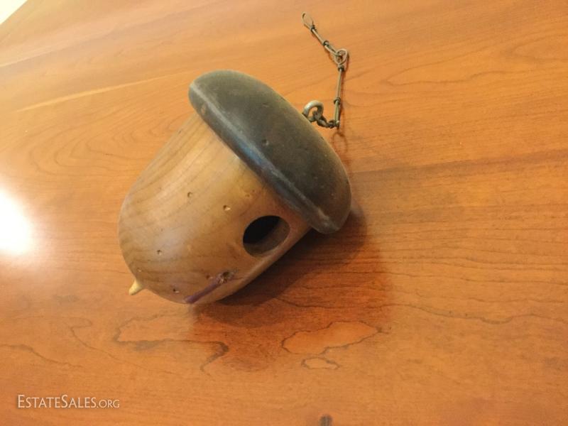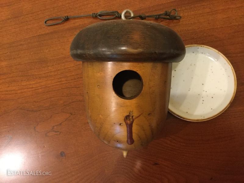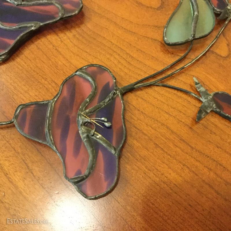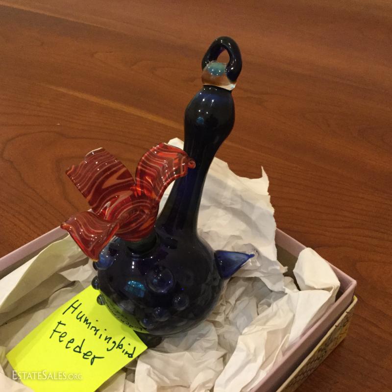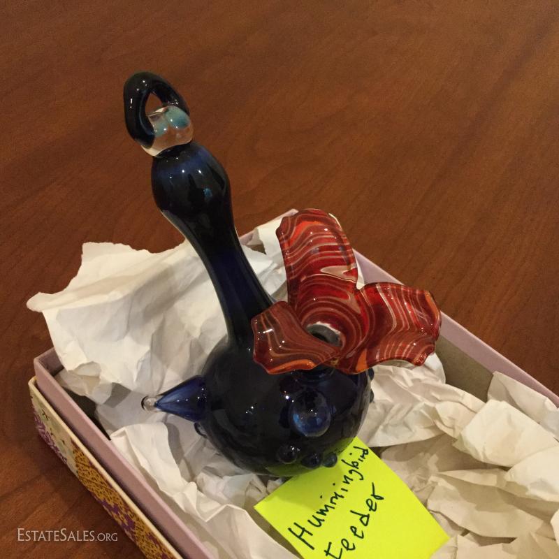 Large metal garden plant holder, 27"l x 9"w x 24"tall. Smaller plant stand is 21" tall. Gorgeous blown glass hummingbird feeder. Wooden acorn bird feeder. Plastic watering cans. A few artificial plants and more. See pictures.