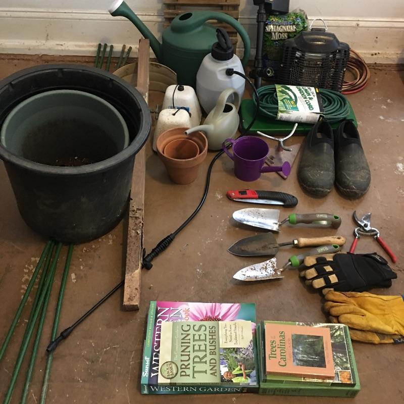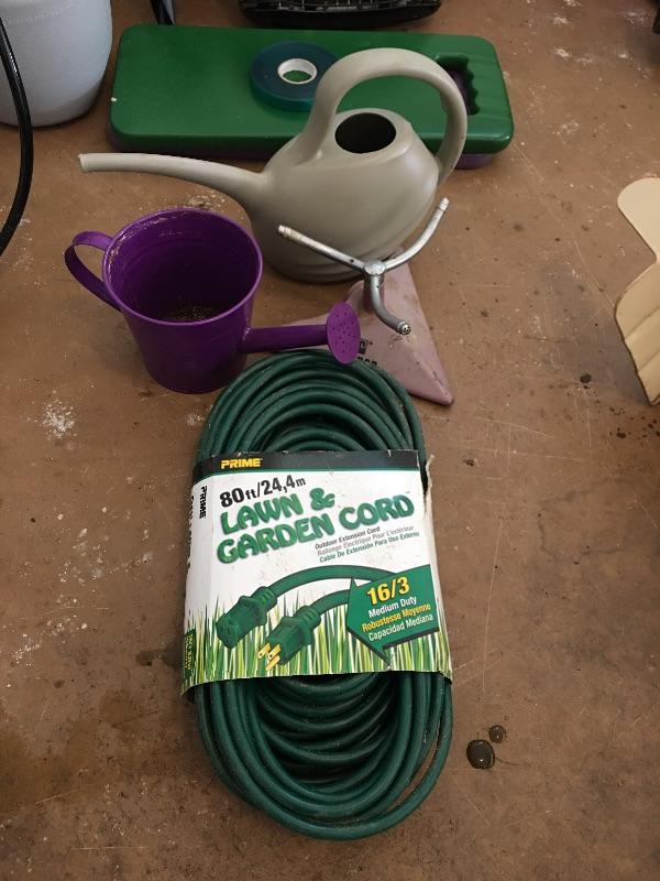 For all you gardeners out there this array is for you. Lot includes hose hanger with sticker, Muck shoes size 12, extension cord, water cans, folding saw, hand diggers , mini table, books, one gallon sprayer, bug zapper and more. Bug zapper powered on when tested.