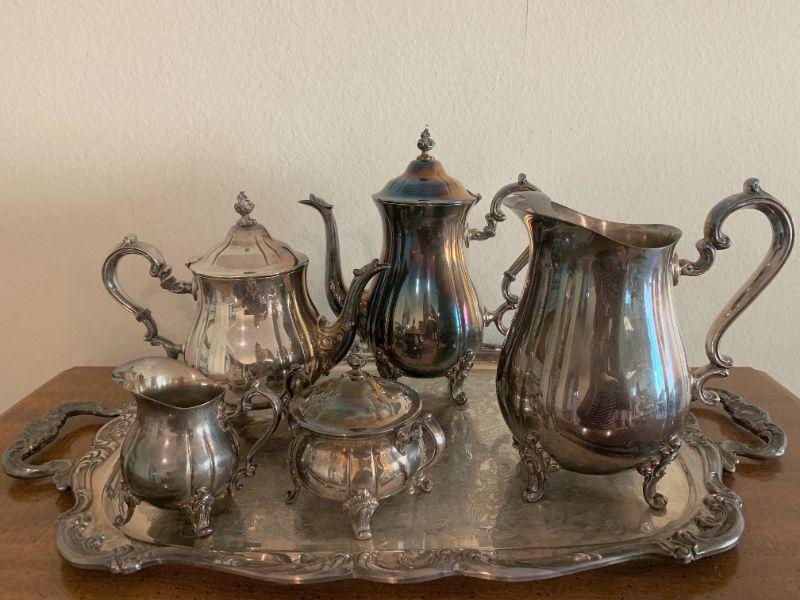 Large tray, coffee pot, tea pot, water pitcher sugar & creamer silver plate by Gorham.