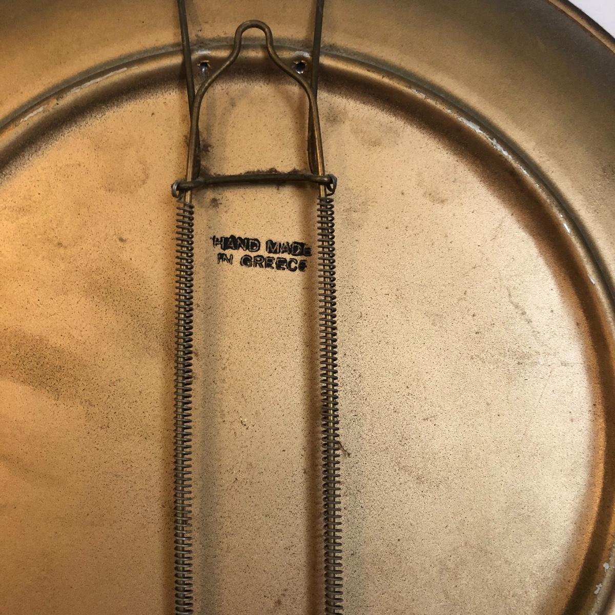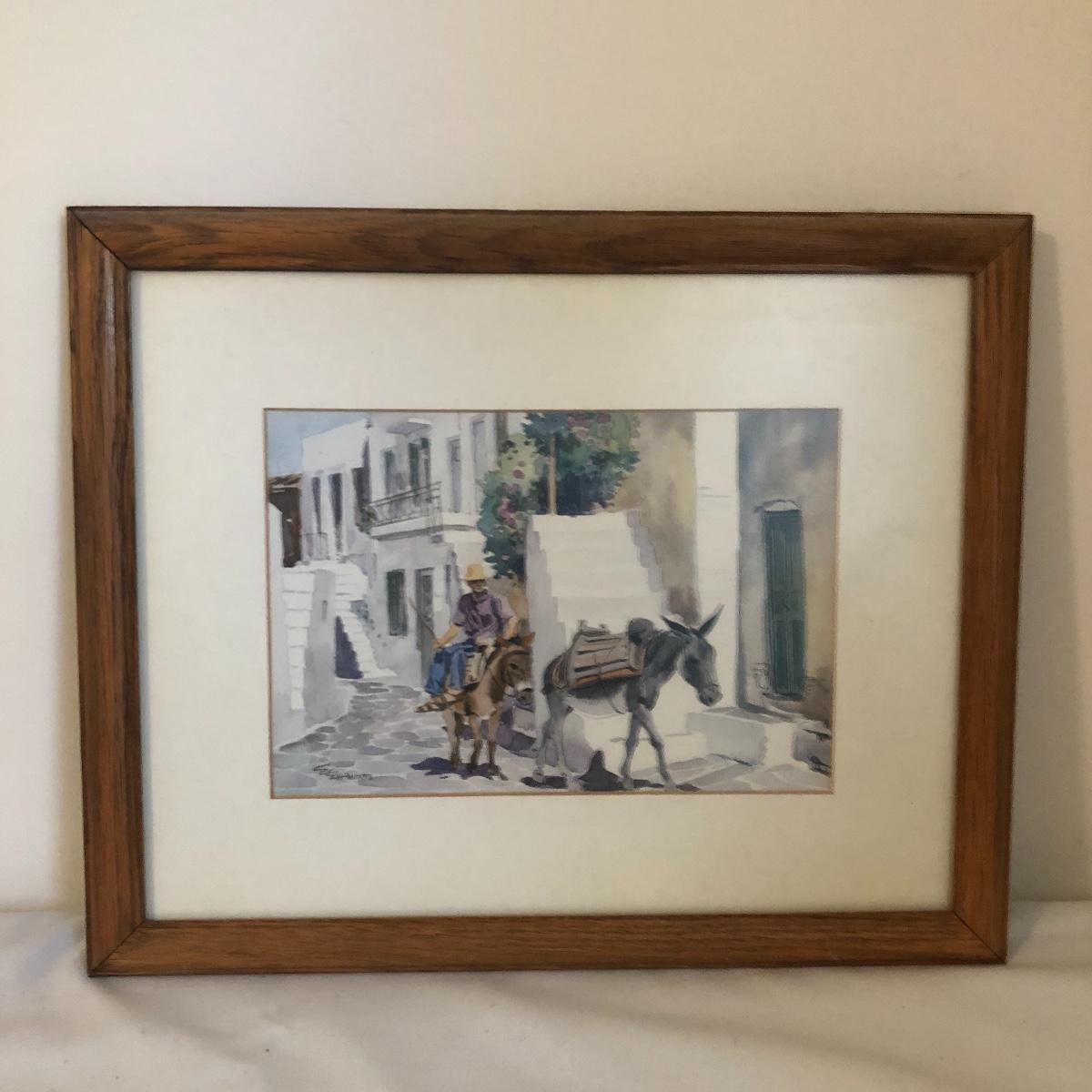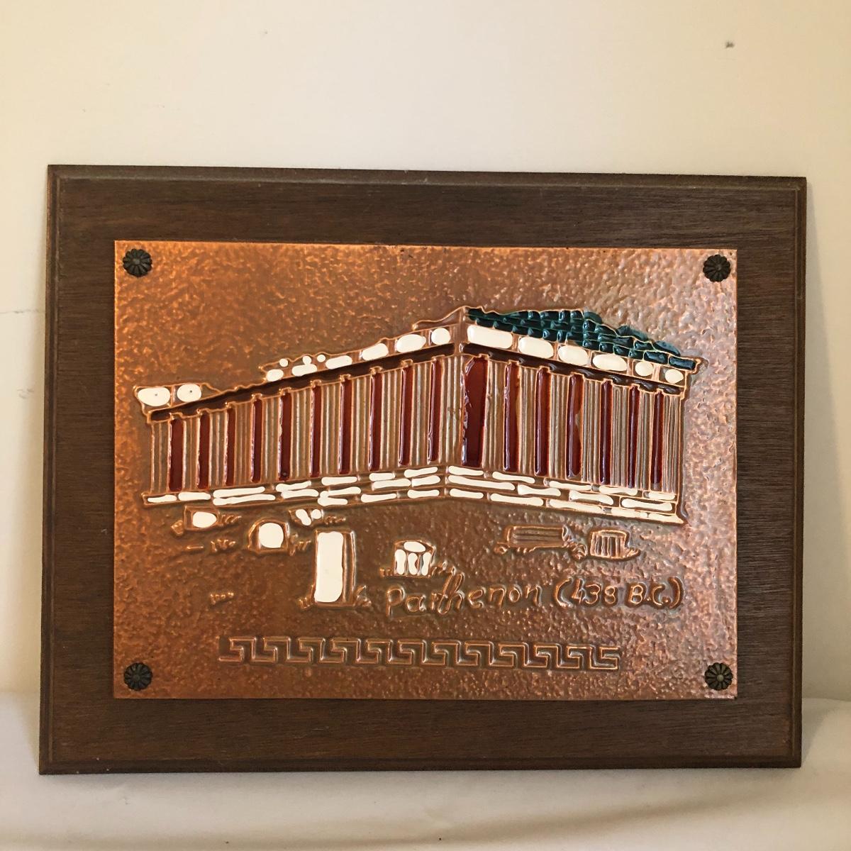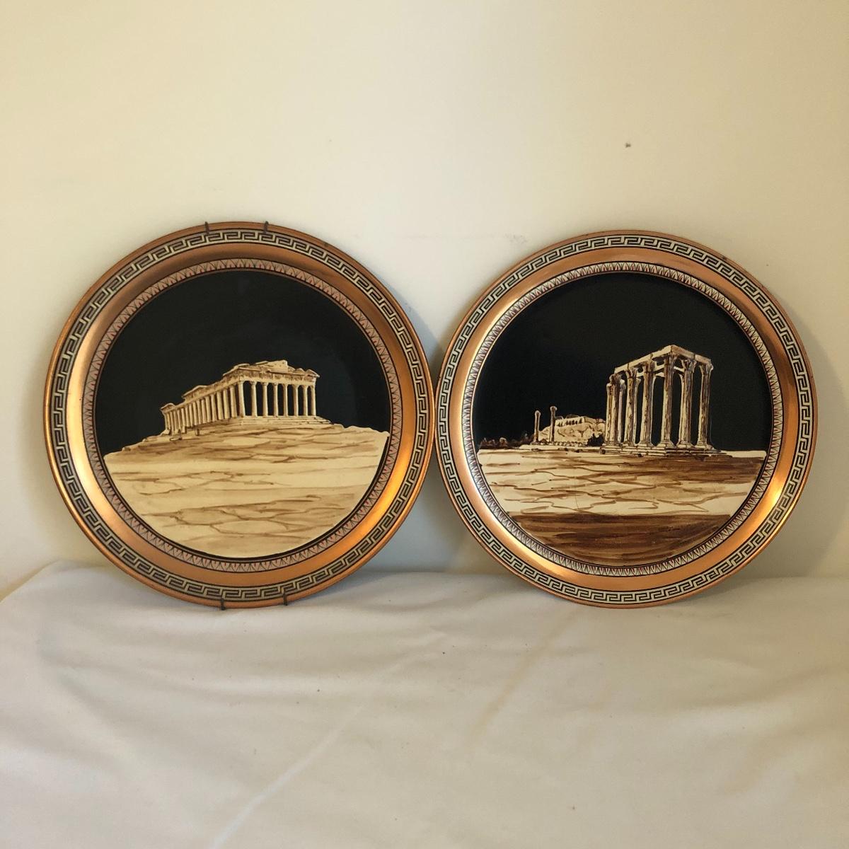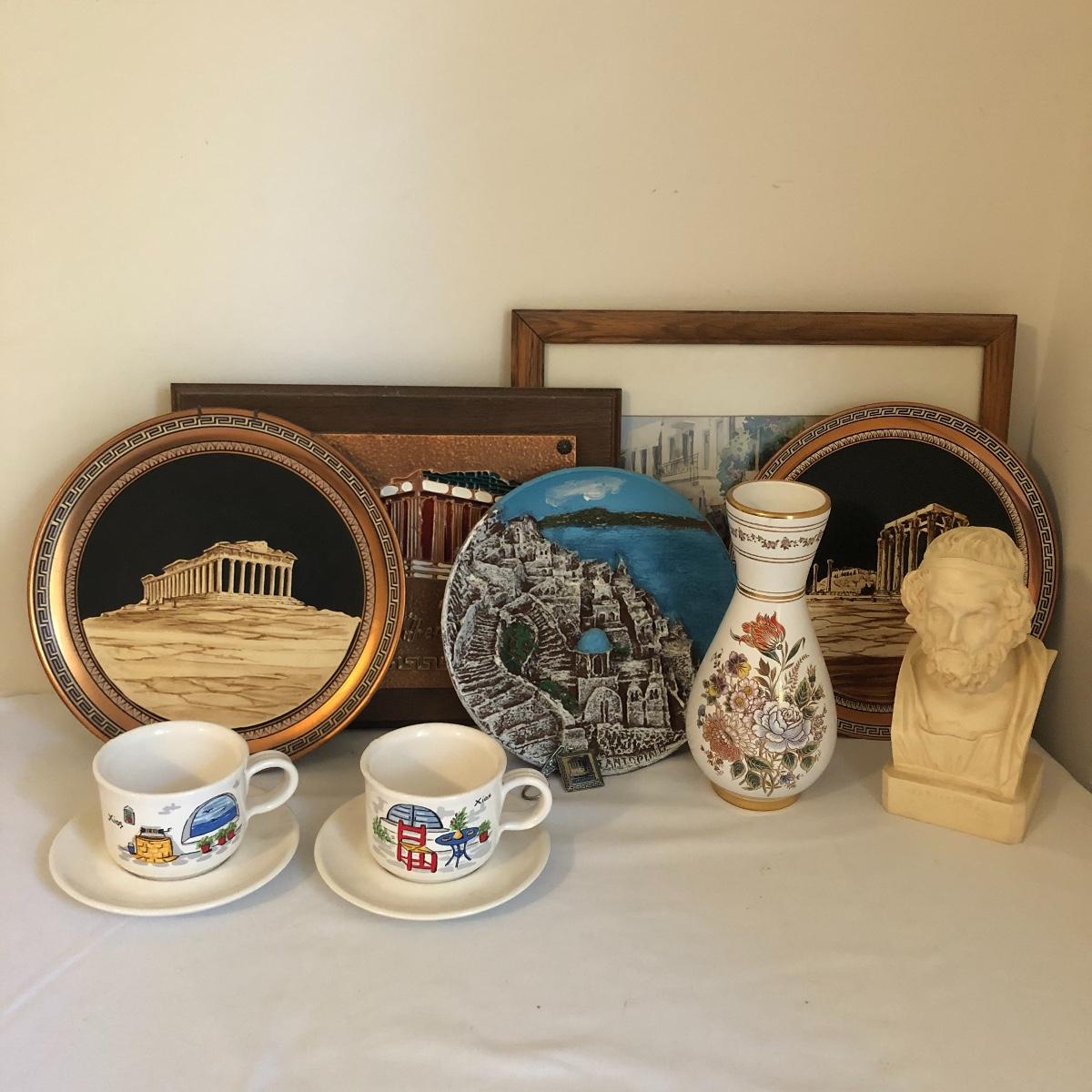 A nice find for the Greek lover in your life. Lot includes framed art, plaque with what appears to be a copper mounted piece, two mugs and saucers, three plates with classic buildings, Neofitou vase with 24k gold and more. Largest frame measures 12.75” x 15.75”.