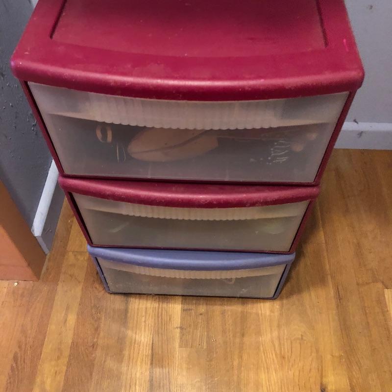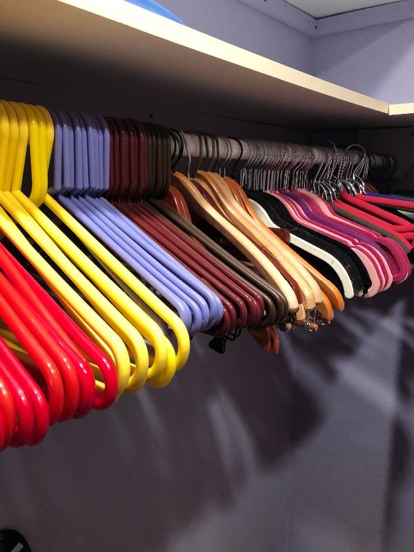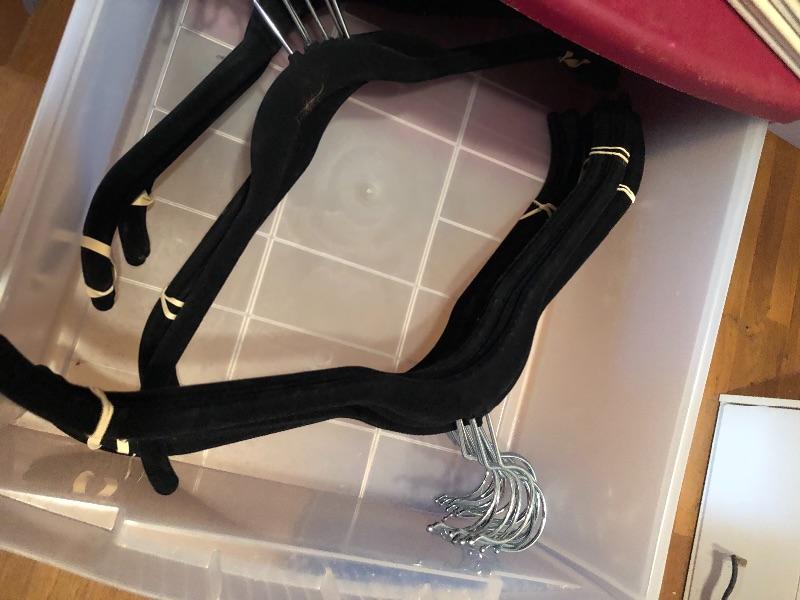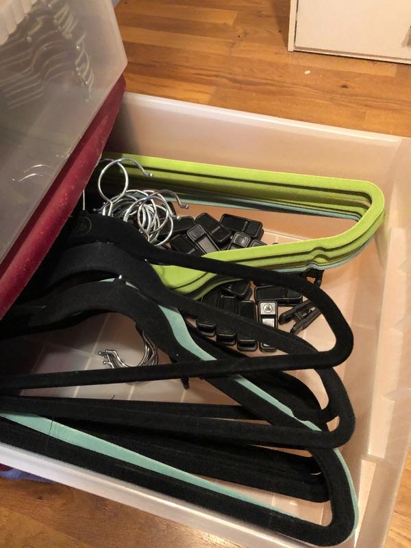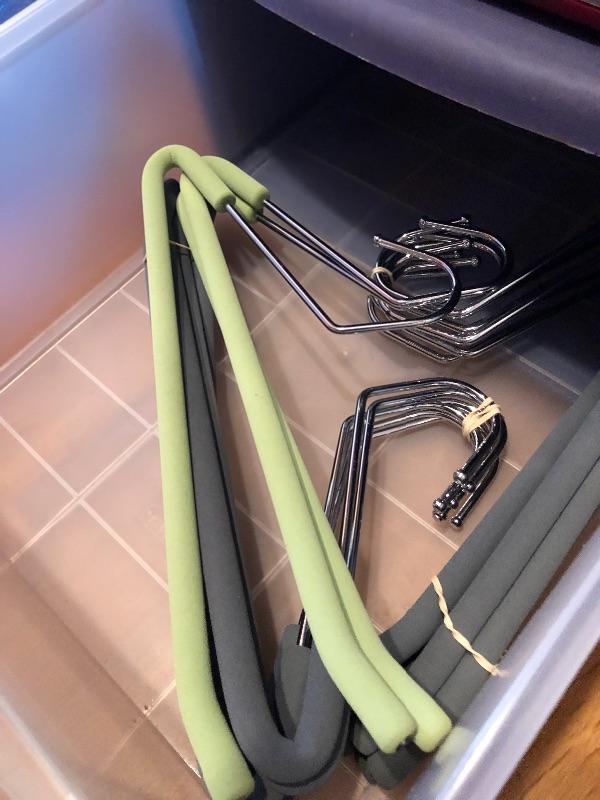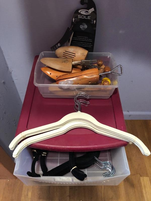 This lot includes hangers, shoe forms, and storage! Hangers are hard plastic, foam, wooden and felt. The plastic three drawer bin is included with this lot. There are three Ziploc flexible totes and two Ziploc big bags. Local pick up only.