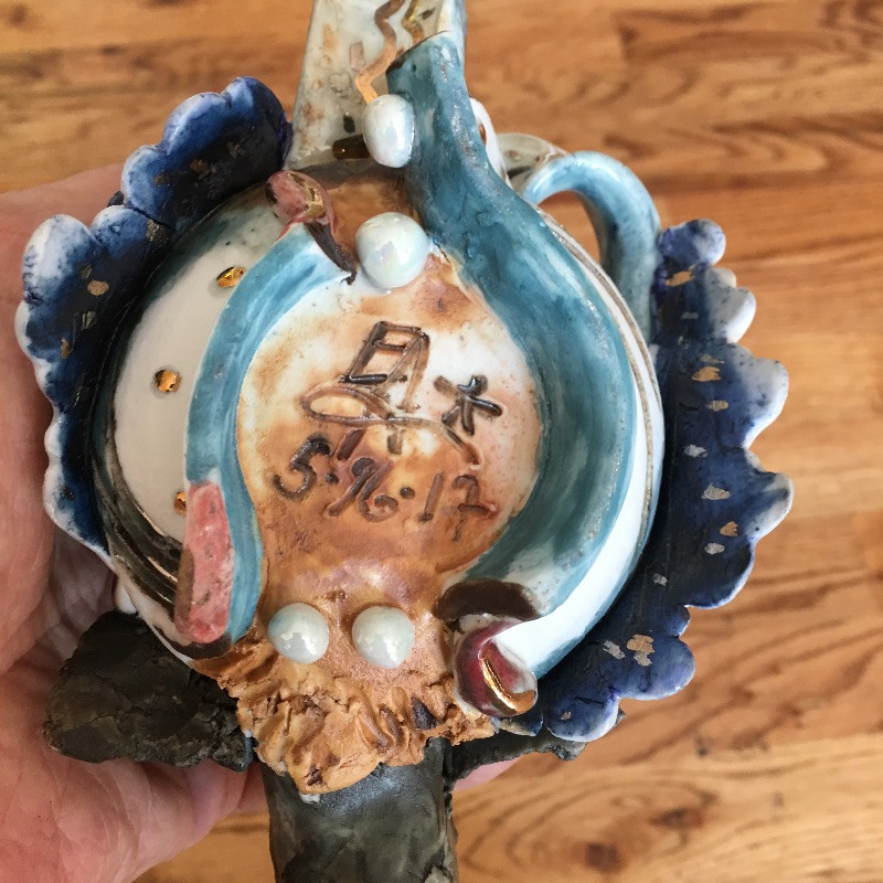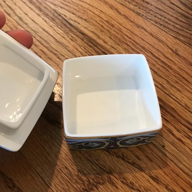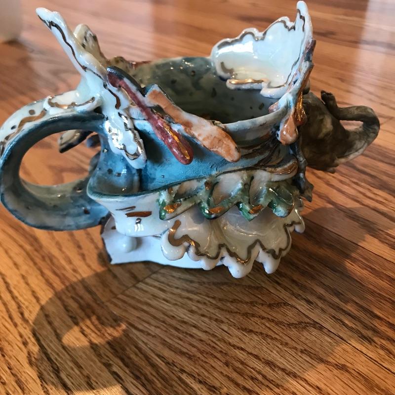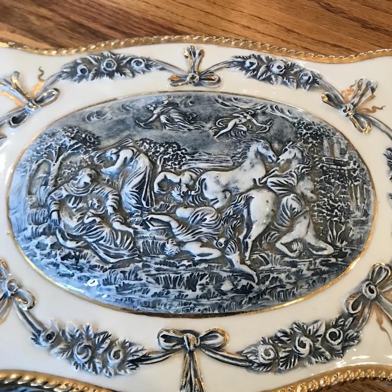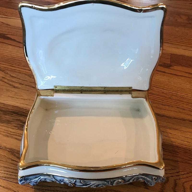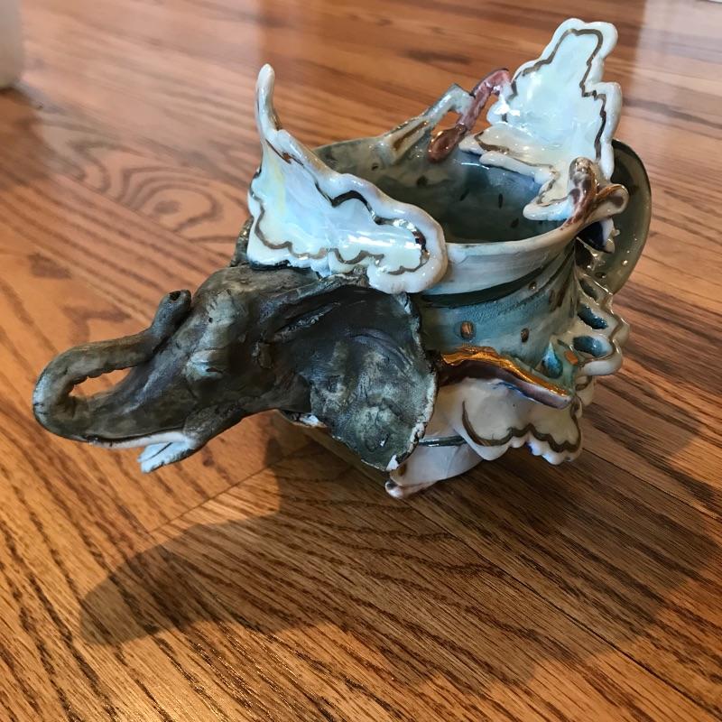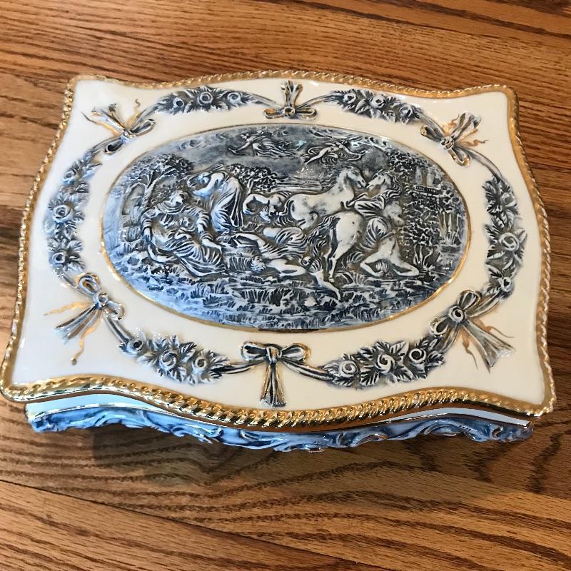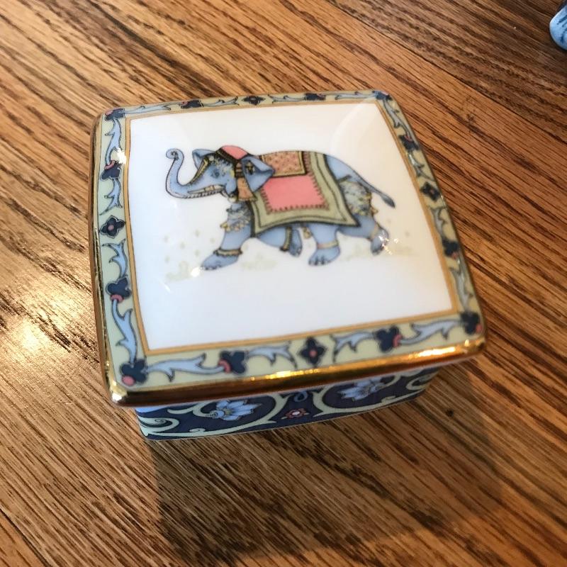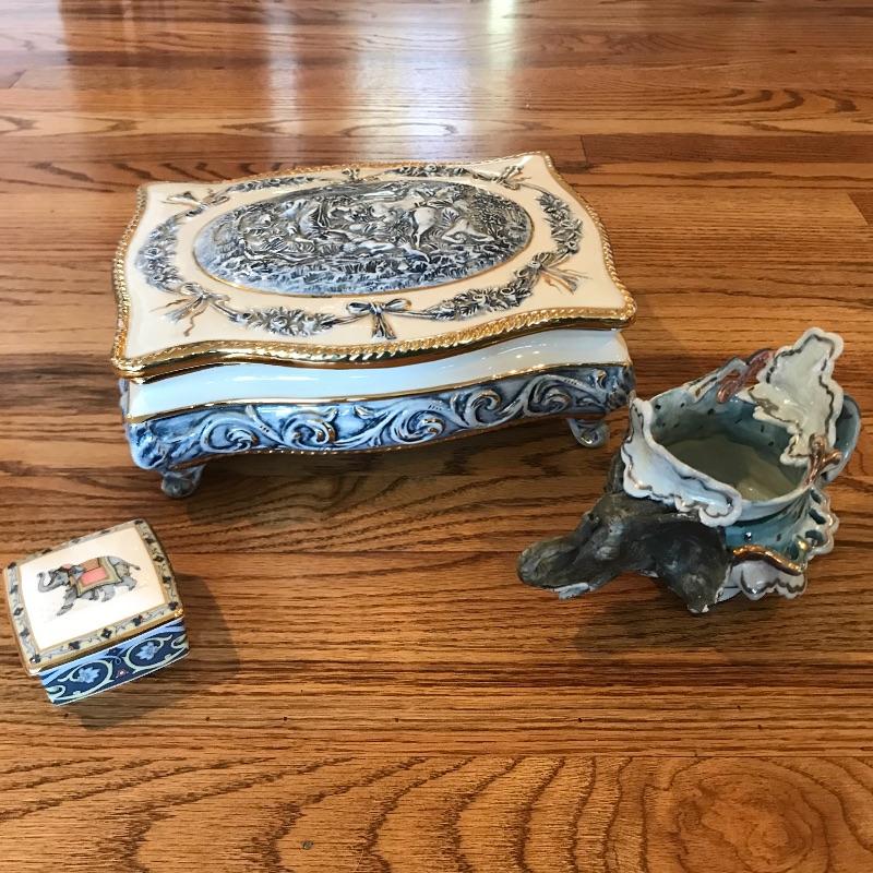 Lot includes R. Capodimonte Italian ceramic box with gold trim (approx. 11” x 9” x 4.5”), a small ceramic elephant box and a one-of-a-kind piece of elephant art with matte and glossy ceramic details. Signature is illegible. Dated 5/16/17. Shipping available.