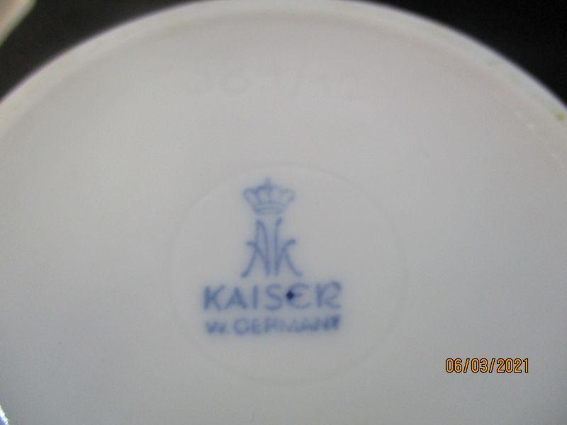 This matches Lot 46, but there are no flaws found anywhere. It stands about 4.75" tall and the backstamp mark was used by Kaiser between 1970-1990.