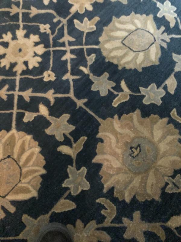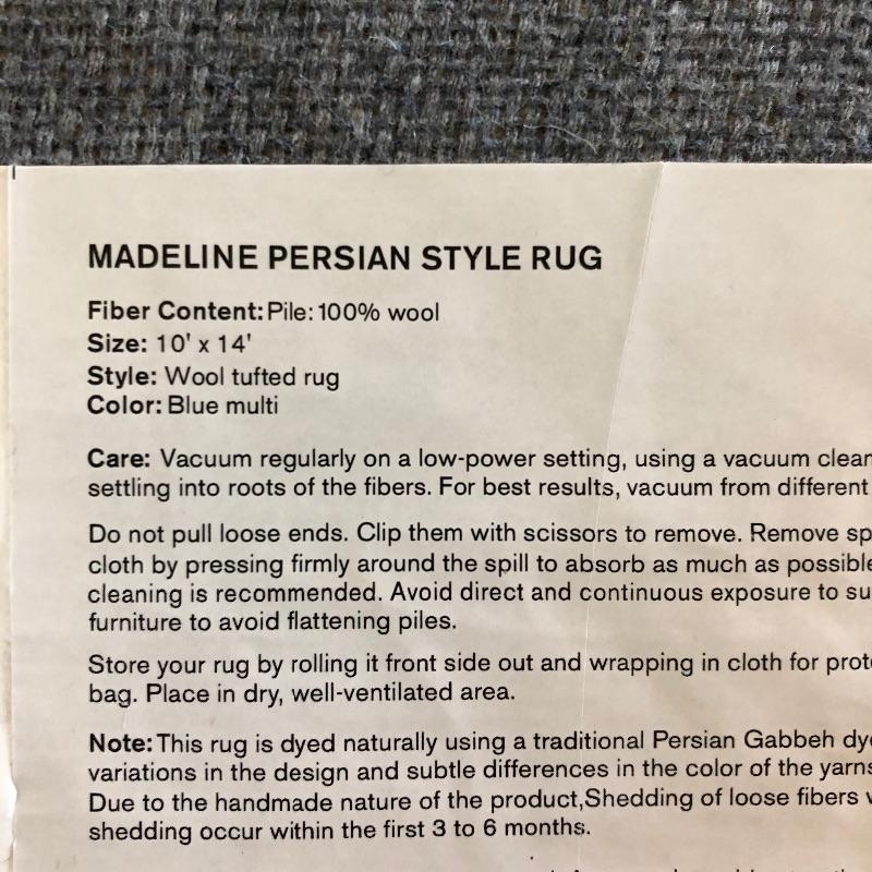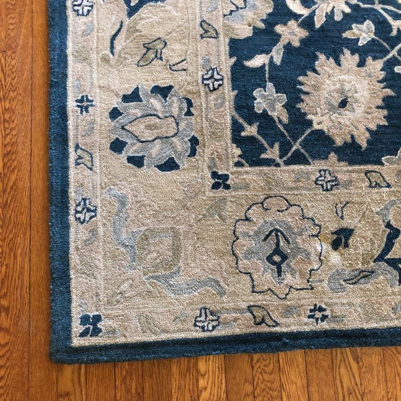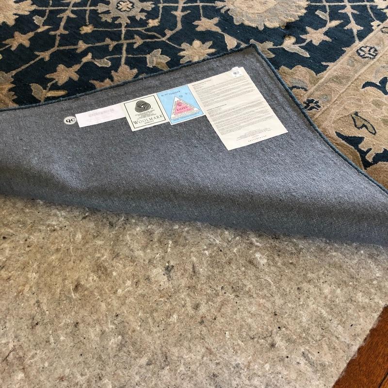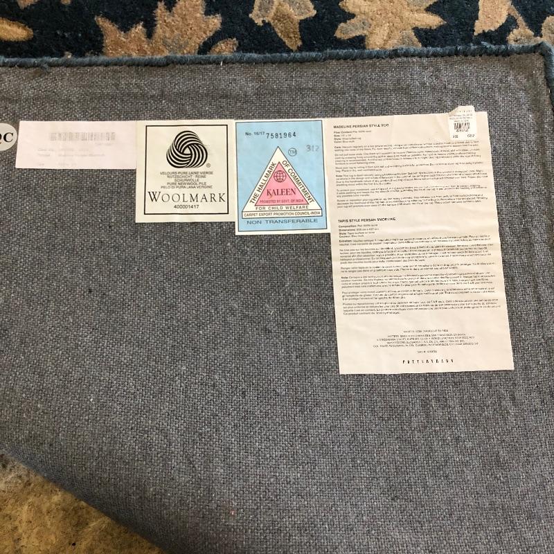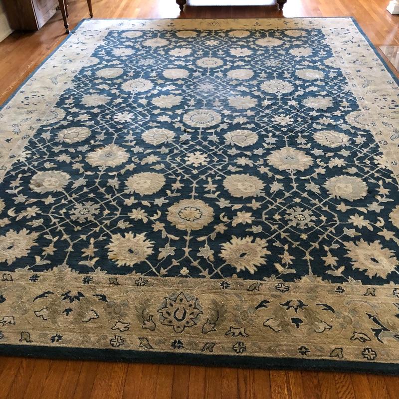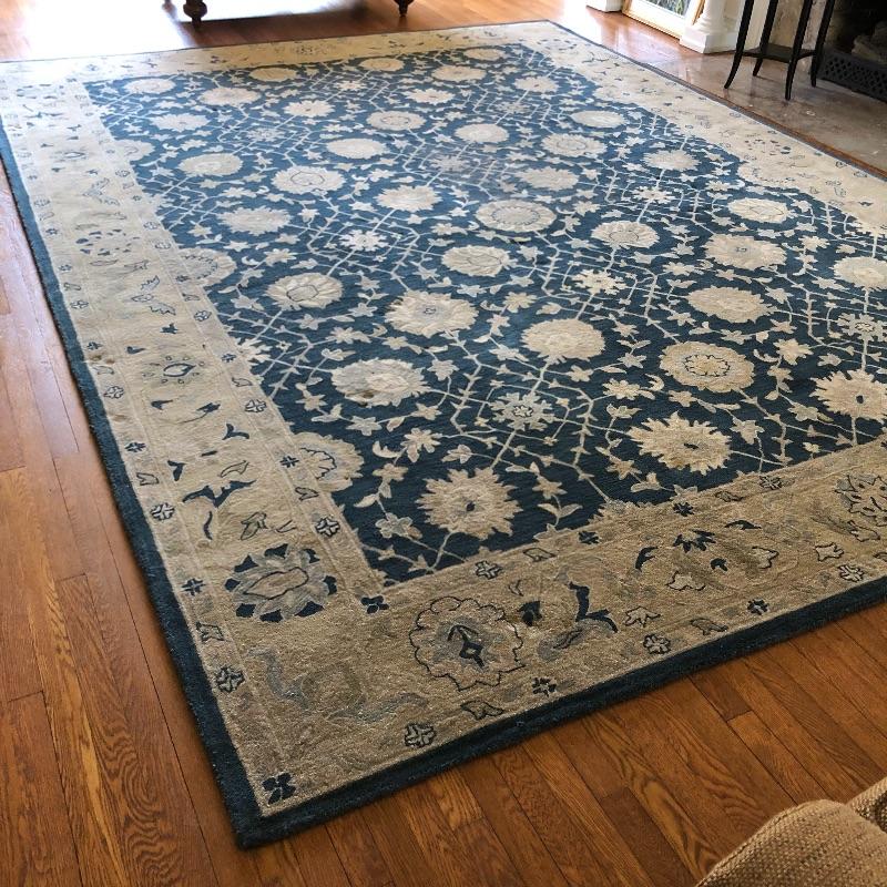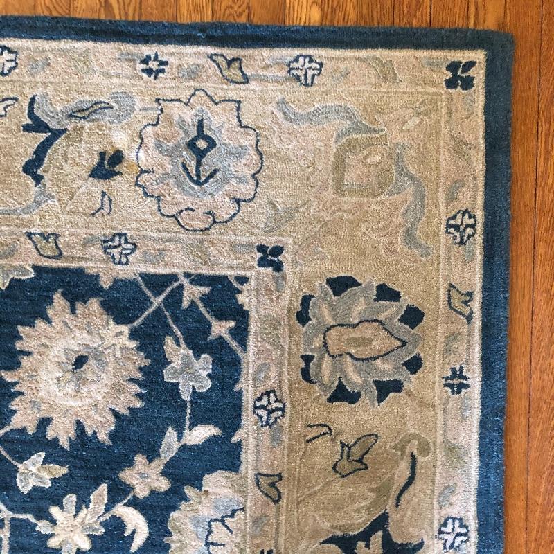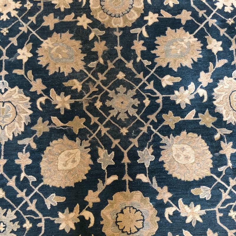 Large Wool Indian Rug will keep your toes warm and protect your floors. Rug appears to be in good shape in blues, tans and gray colors and comes with pad. Rug measures 120” x 168”.
