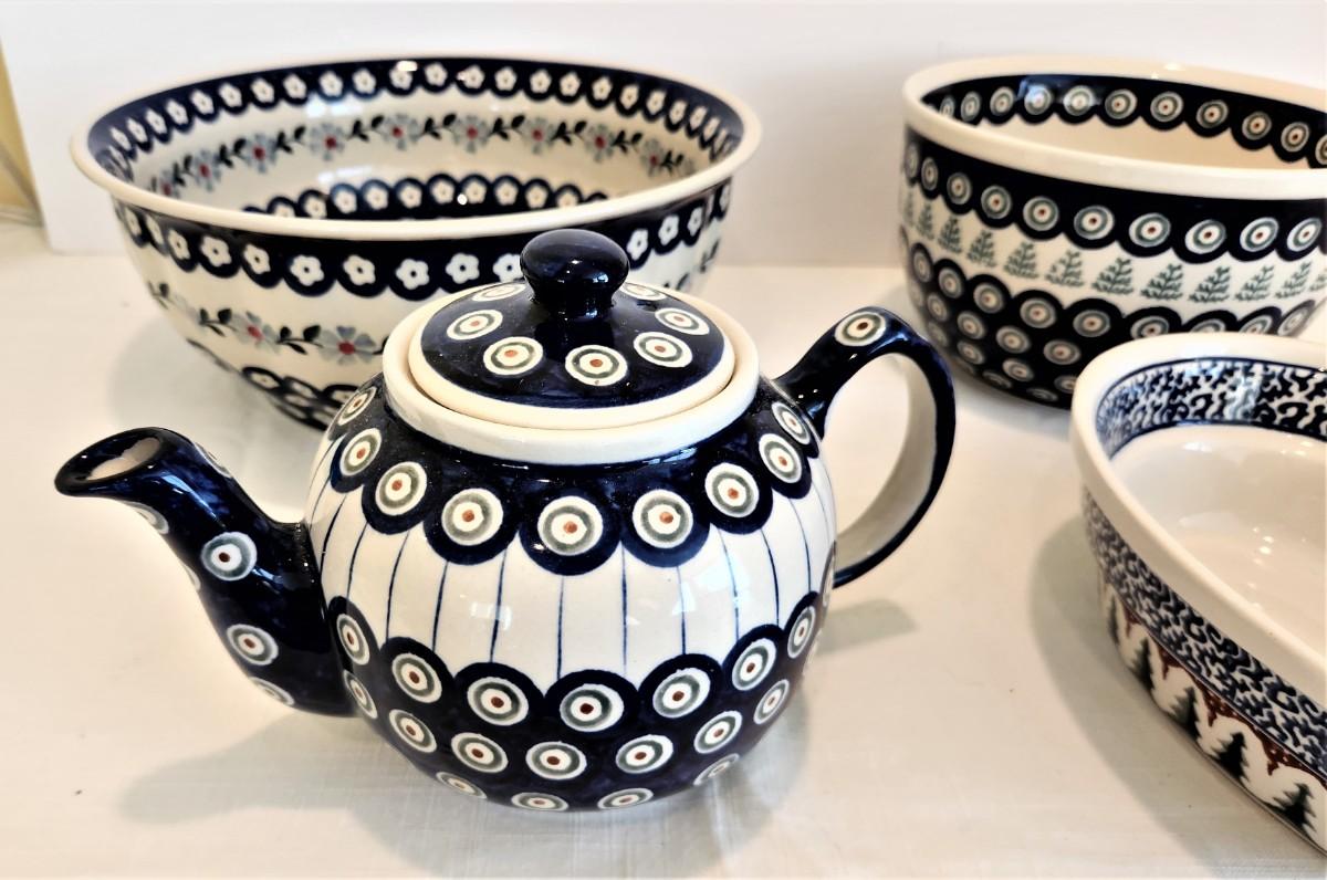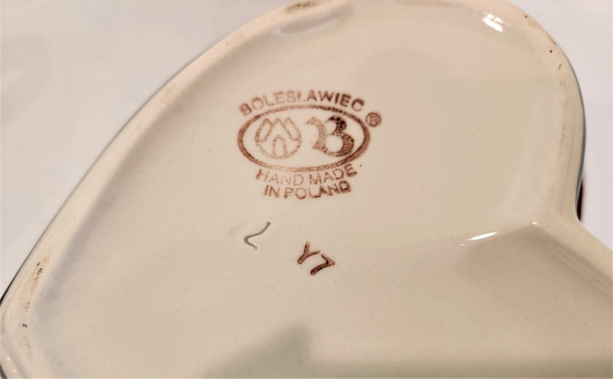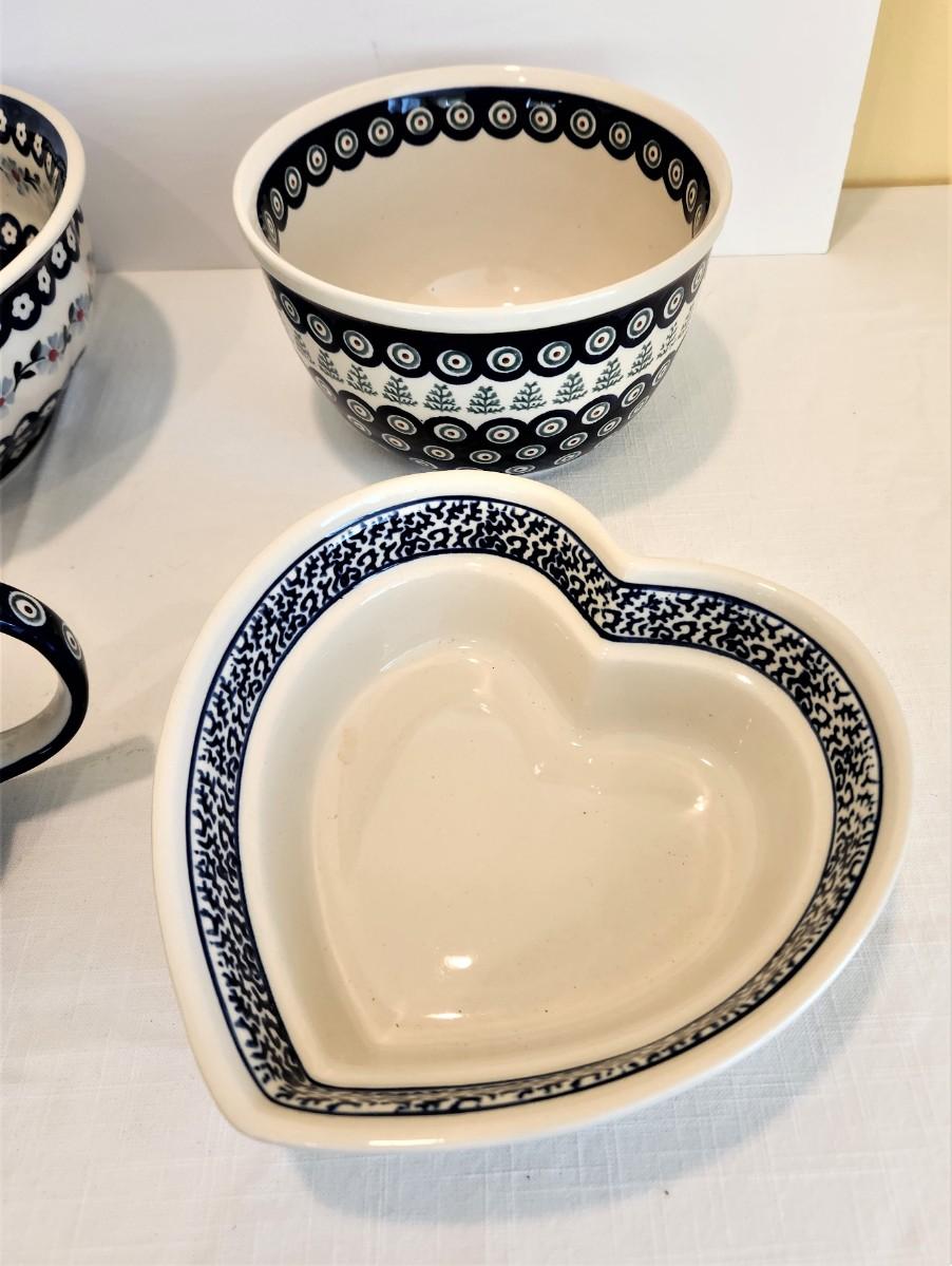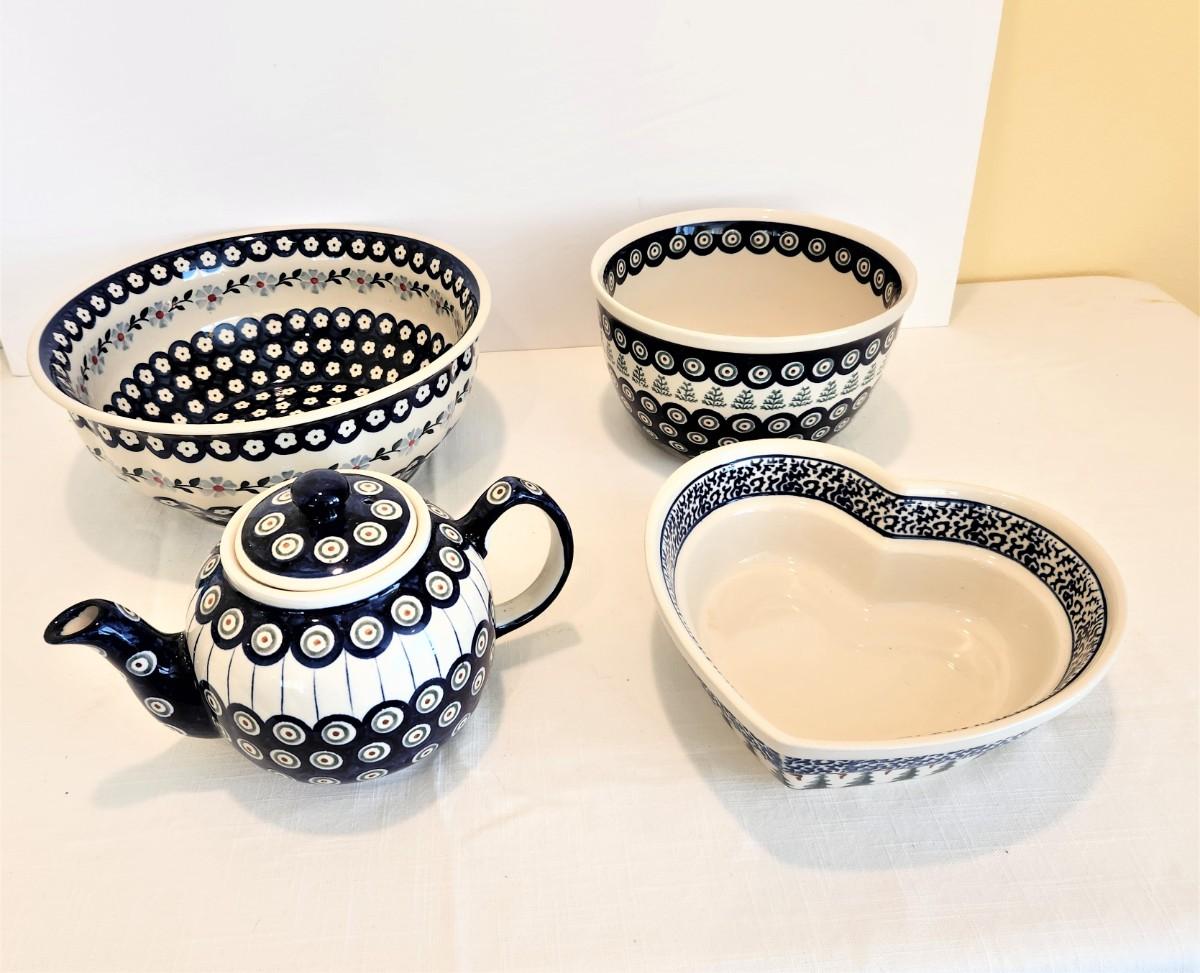 You get all you see here - all made in Poland - teapot, heart-shaped bowl, large bowl (11" across, 4.5" tall), and smaller bowl (8" across, 4.75" tall.) All in good condition.
