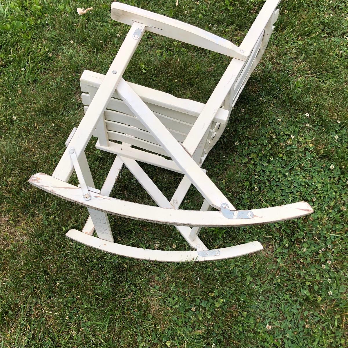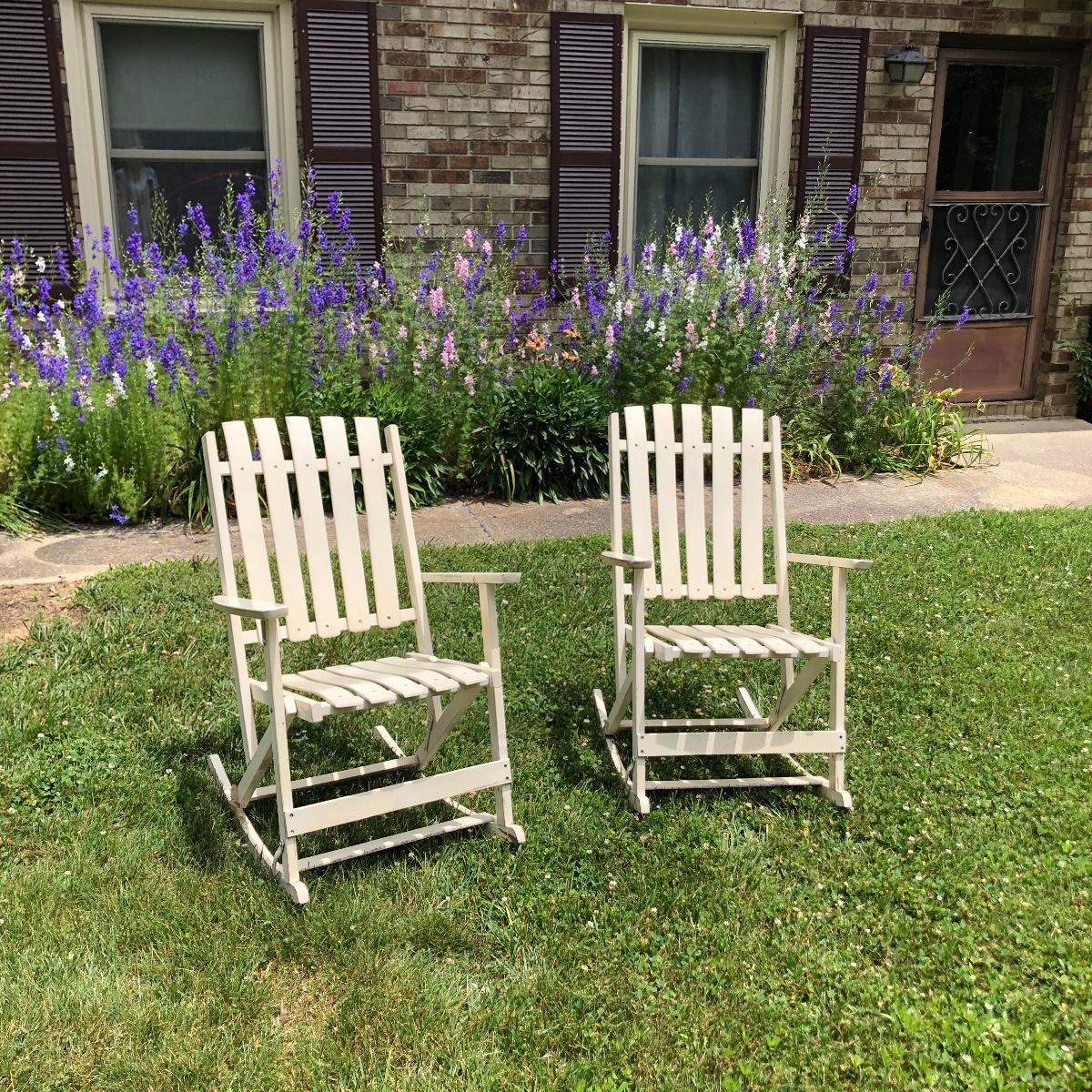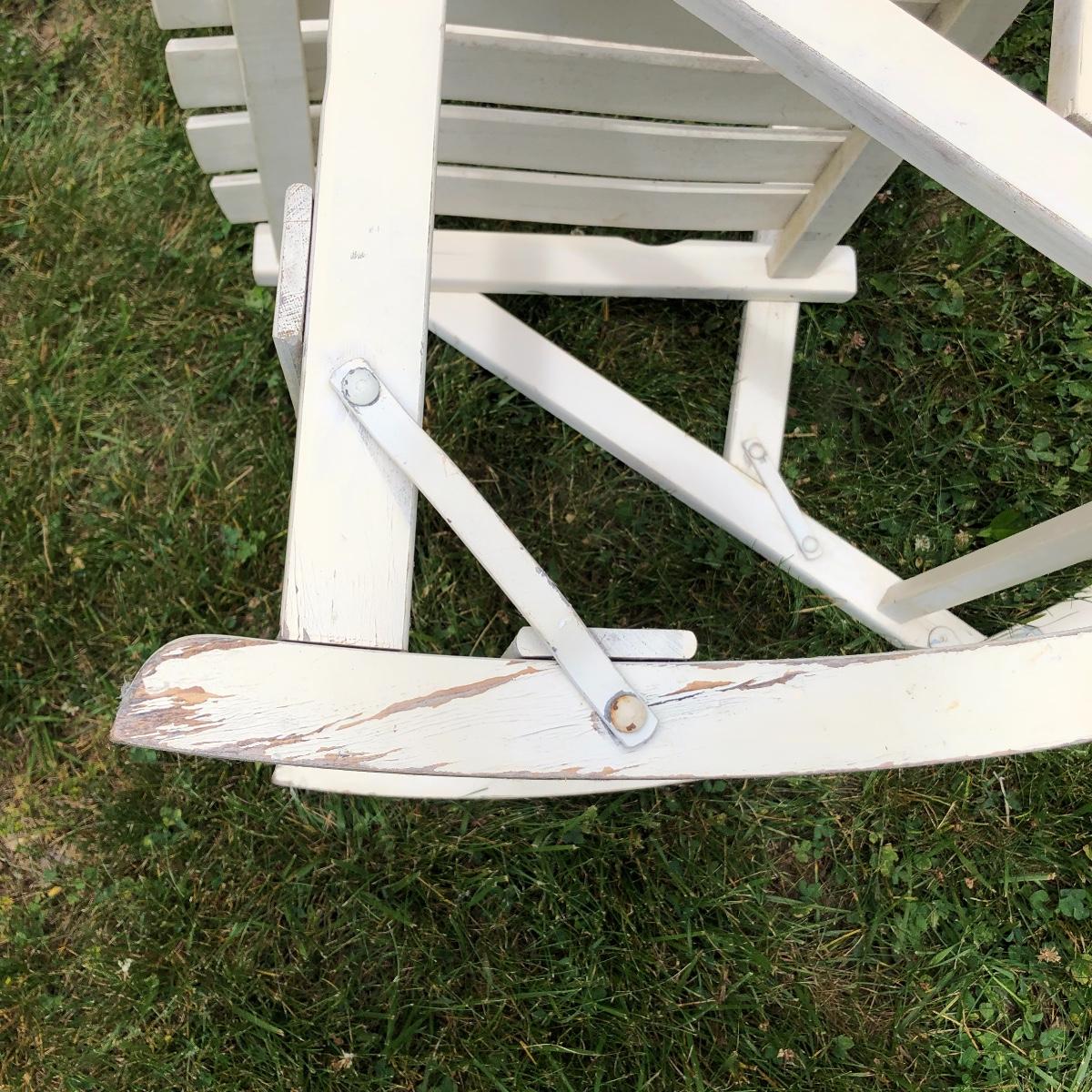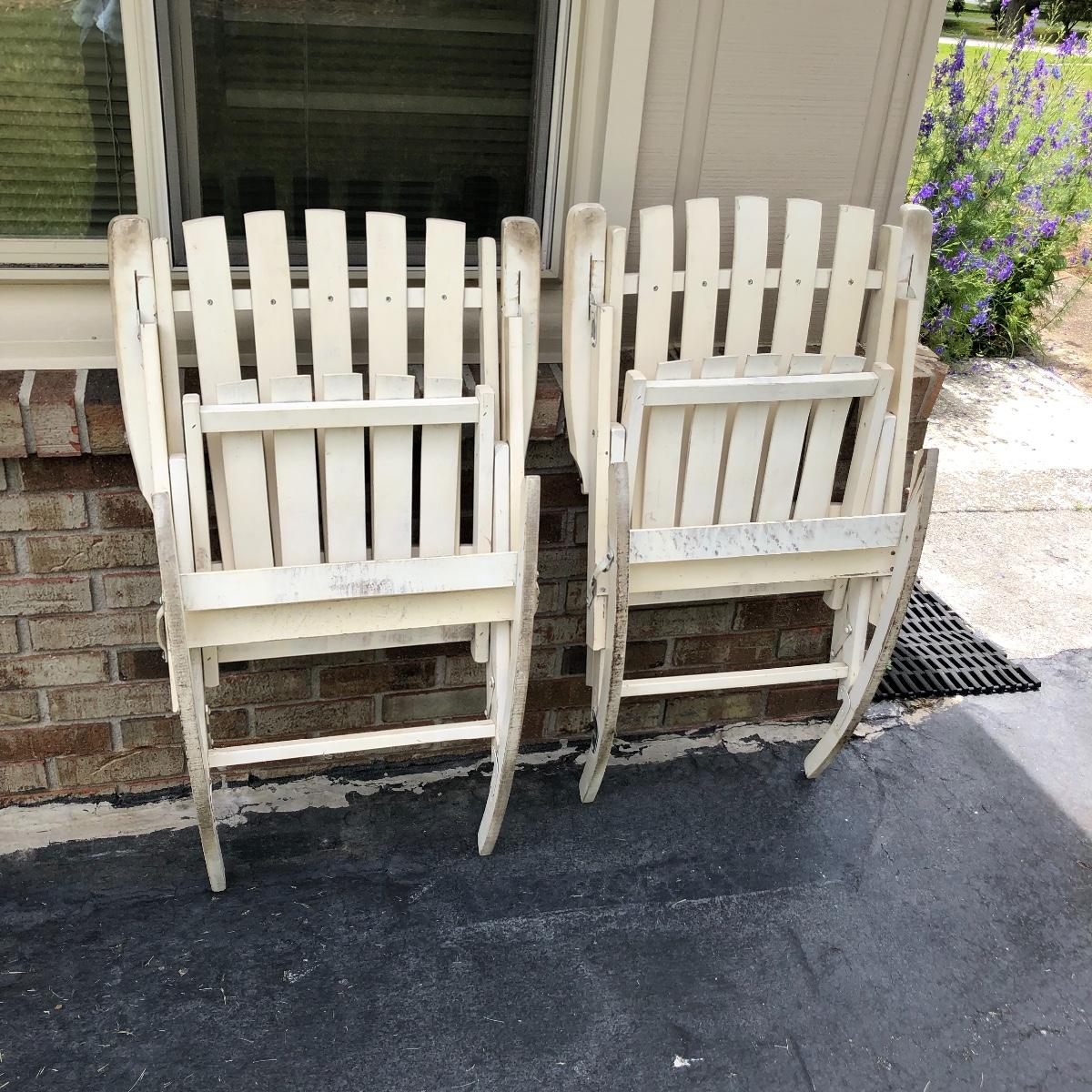 This pair of matching patio chairs fold up for easy storage. They are wood rockers painted white that has worn slightly over the years so a fresh coat of paint would restore them to new looking unless you like the shabby chic look, in which case they are good to go!