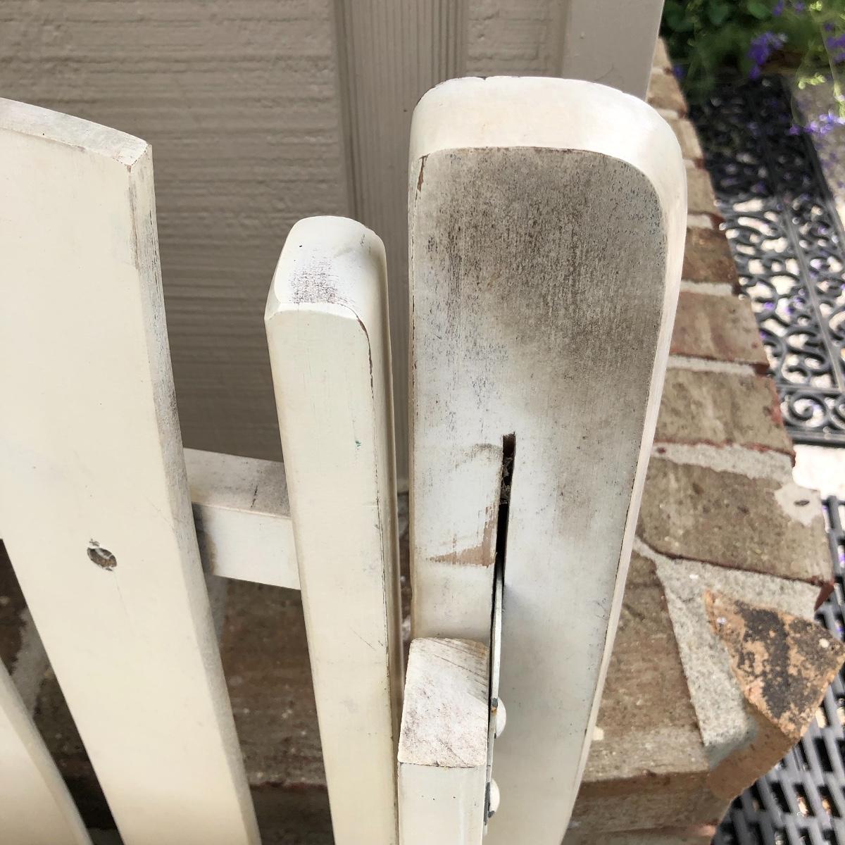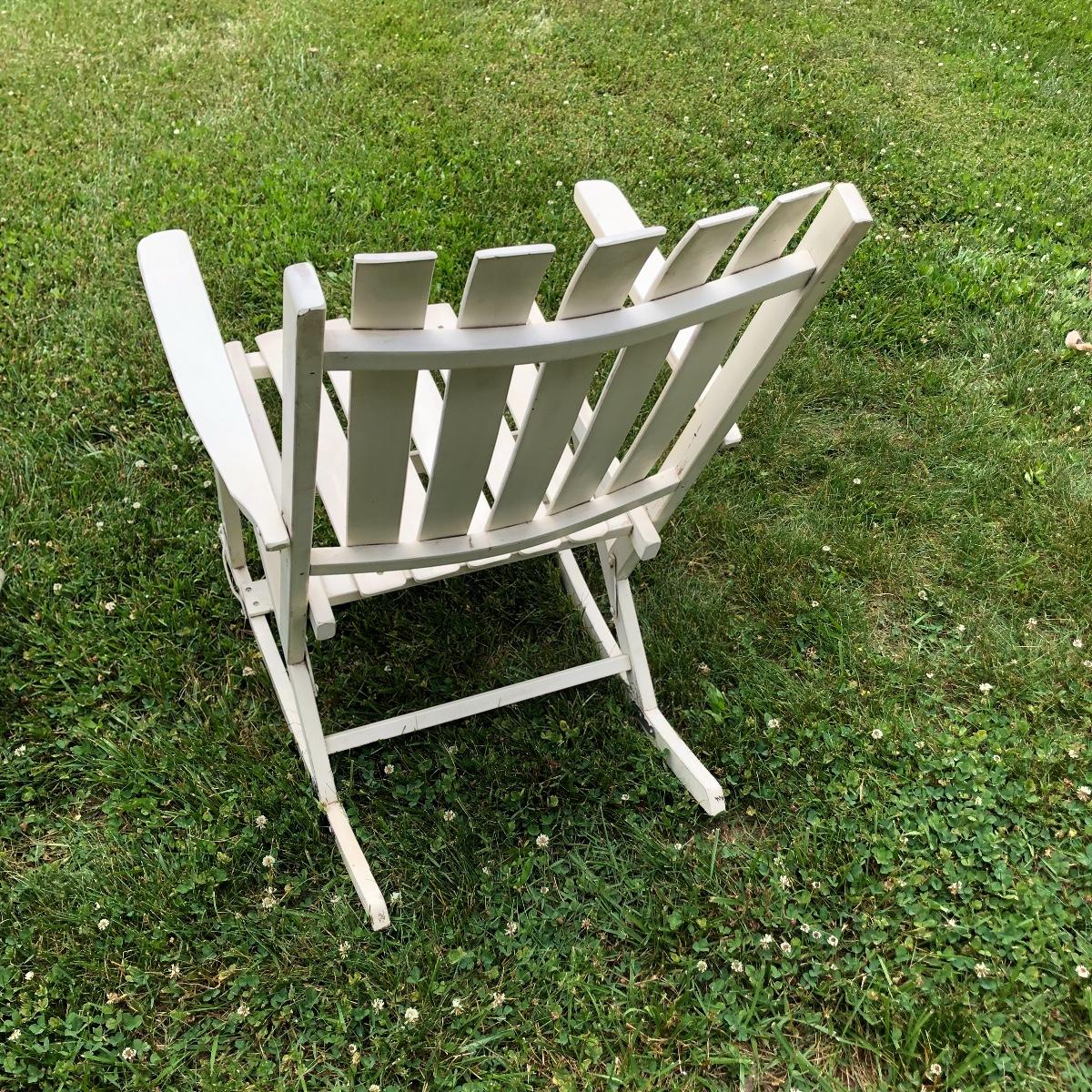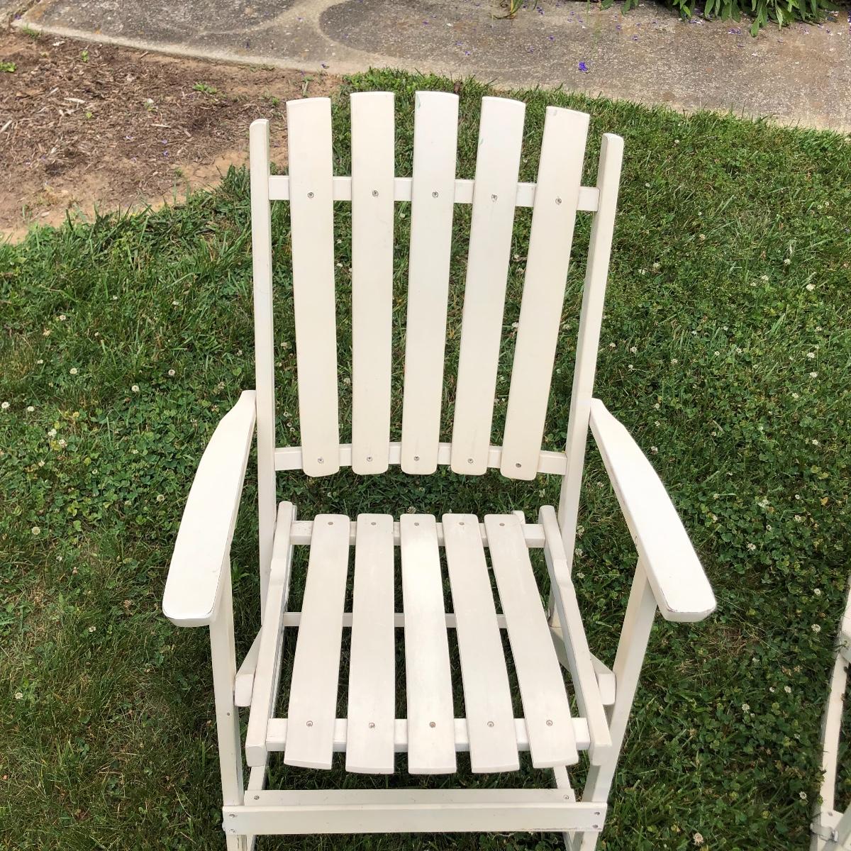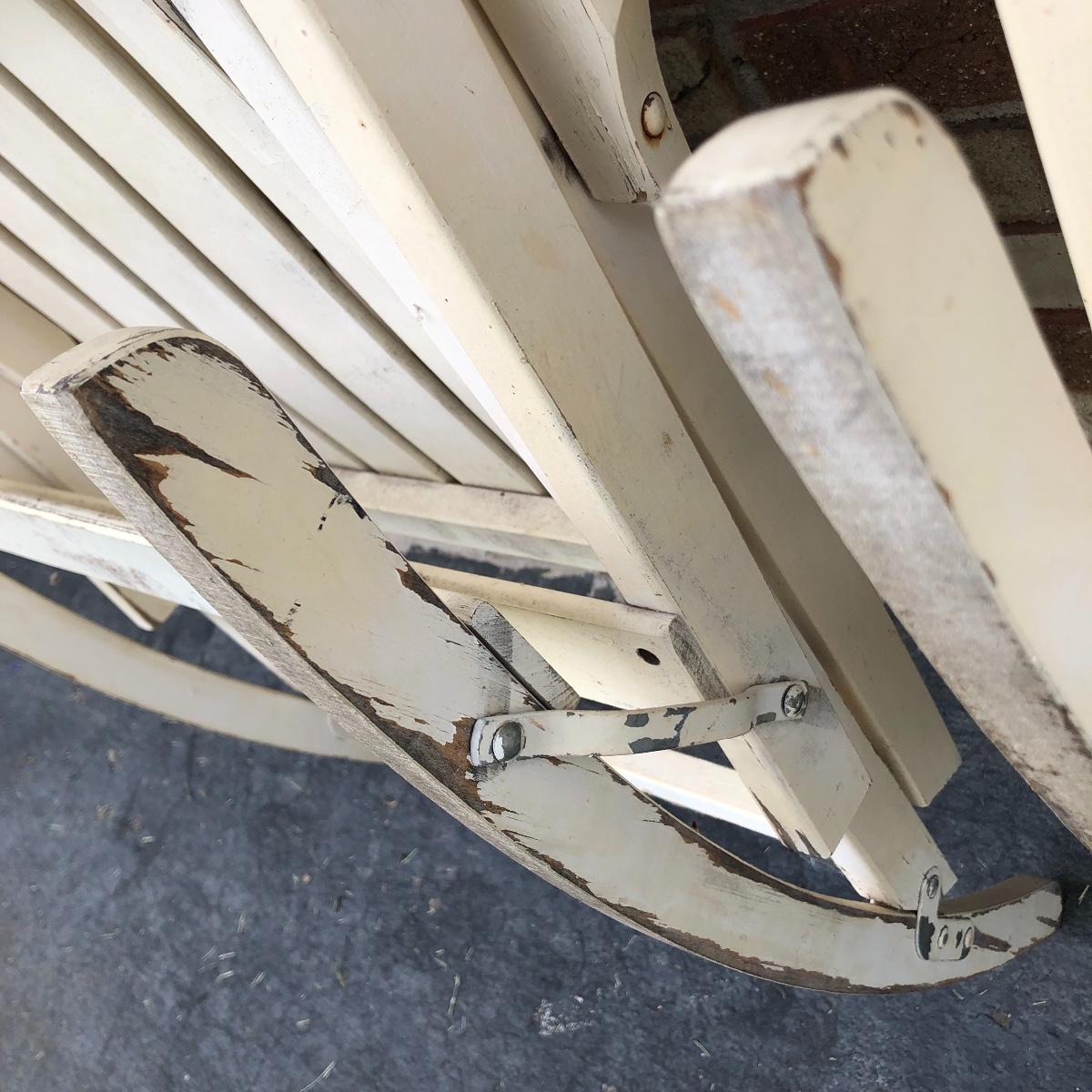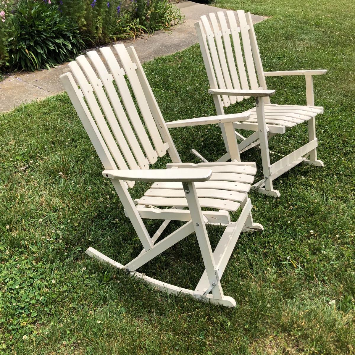 This pair of matching patio chairs fold up for easy storage. They are wood rockers painted white that has worn slightly over the years so a fresh coat of paint would restore them to new looking unless you like the shabby chic look, in which case they are good to go!