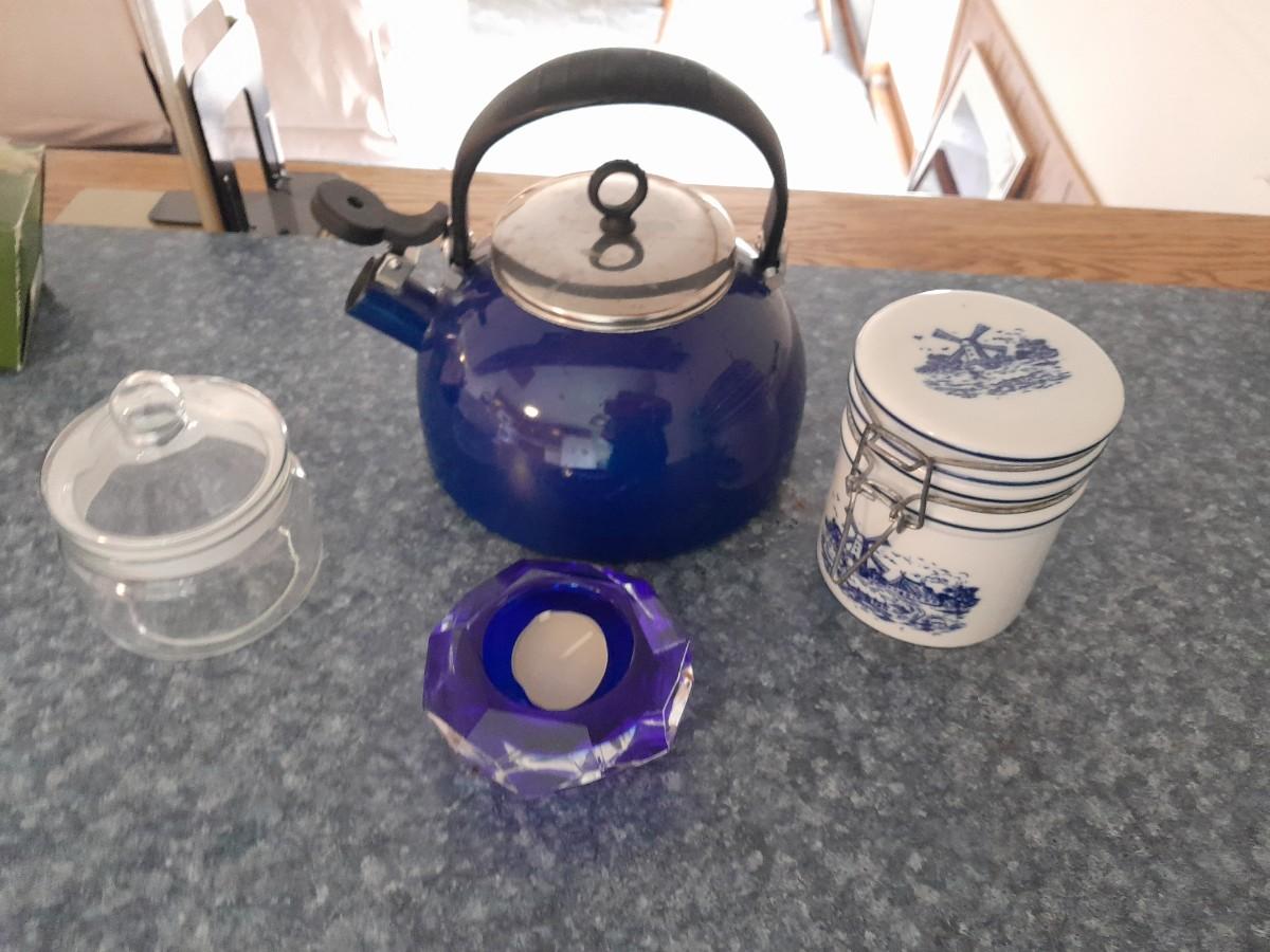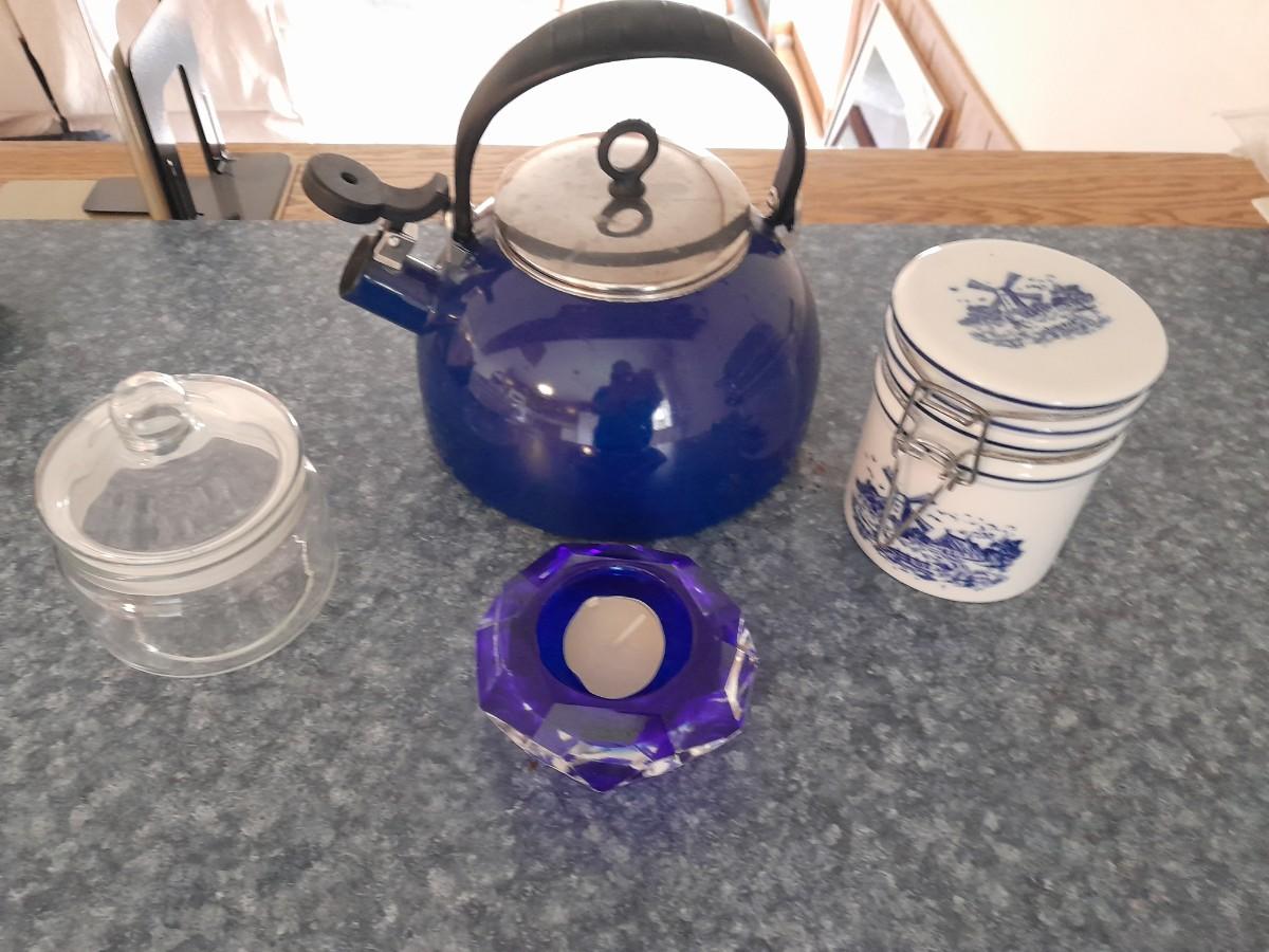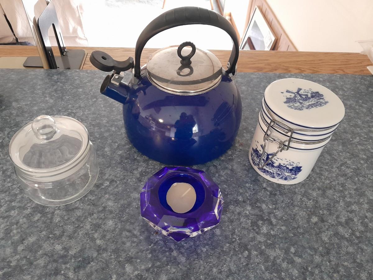 LOT 48 METAL TEA KETTLE WITH CANISTER AND MORE