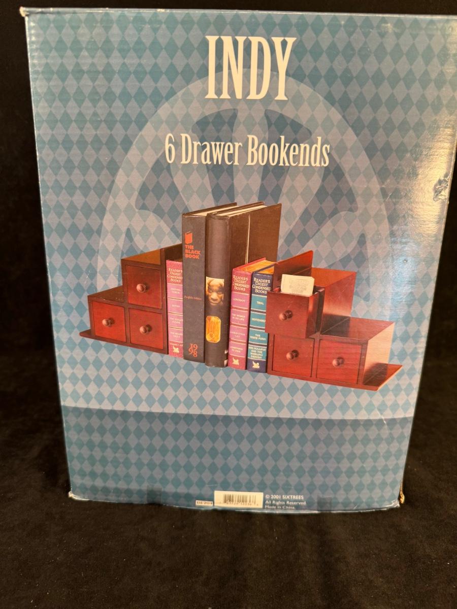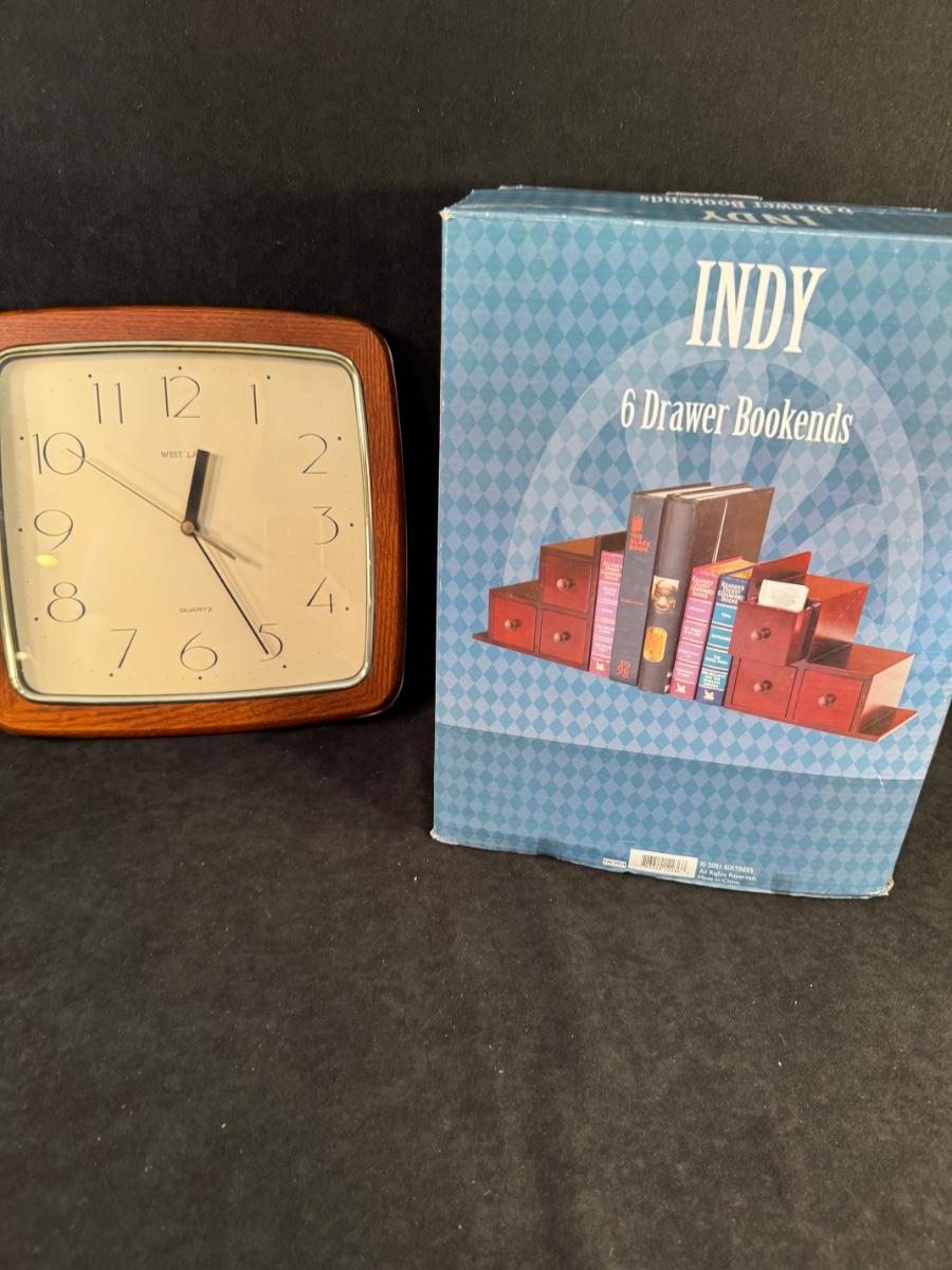 Includes a new set of 6 drawer bookends and a West Land battery operated wall clock.