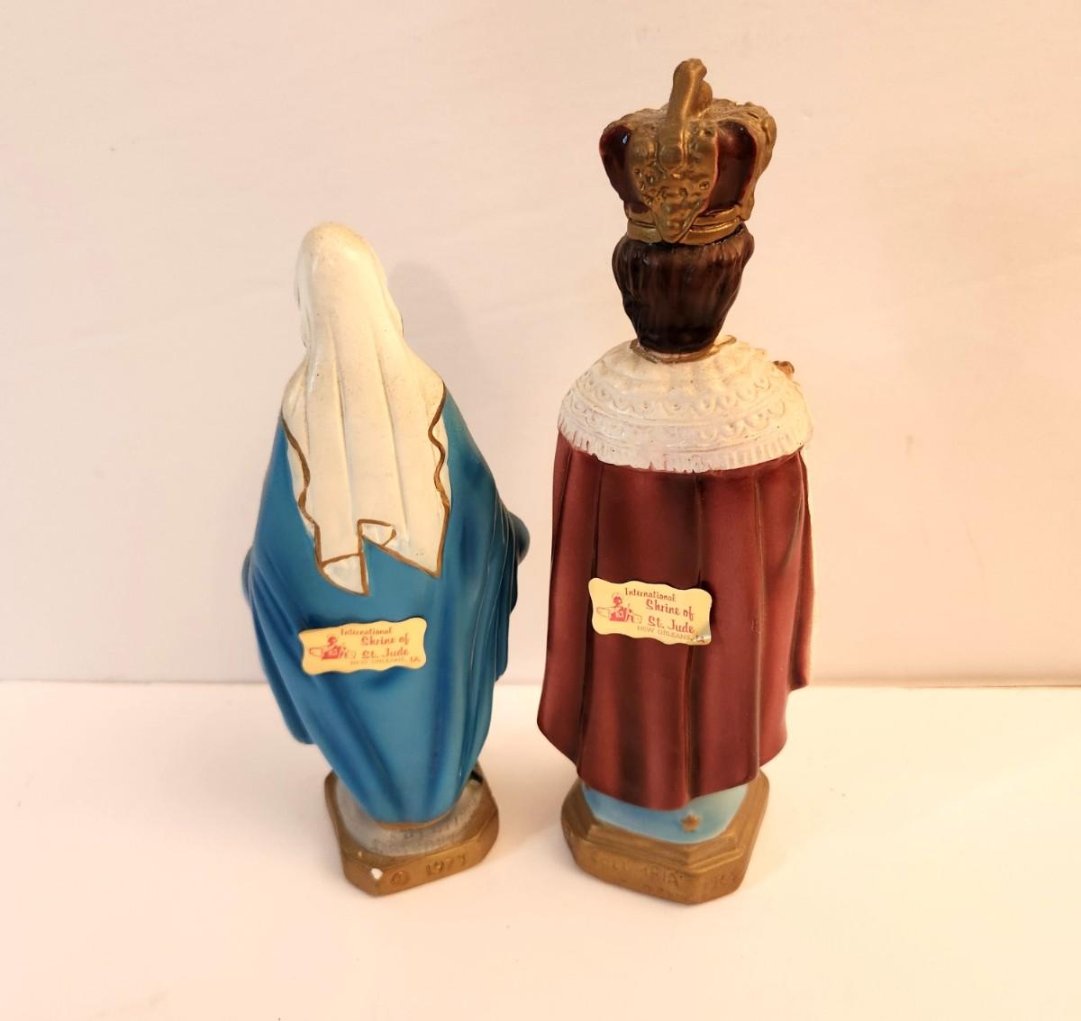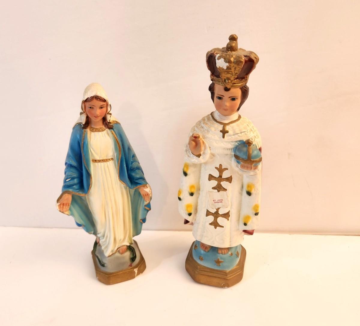 Two vintage chalkware religious statues - the Virgin Mary (8" tall) and the Infant of Prague (9" tall) - Chippy, as is common with these older statues.