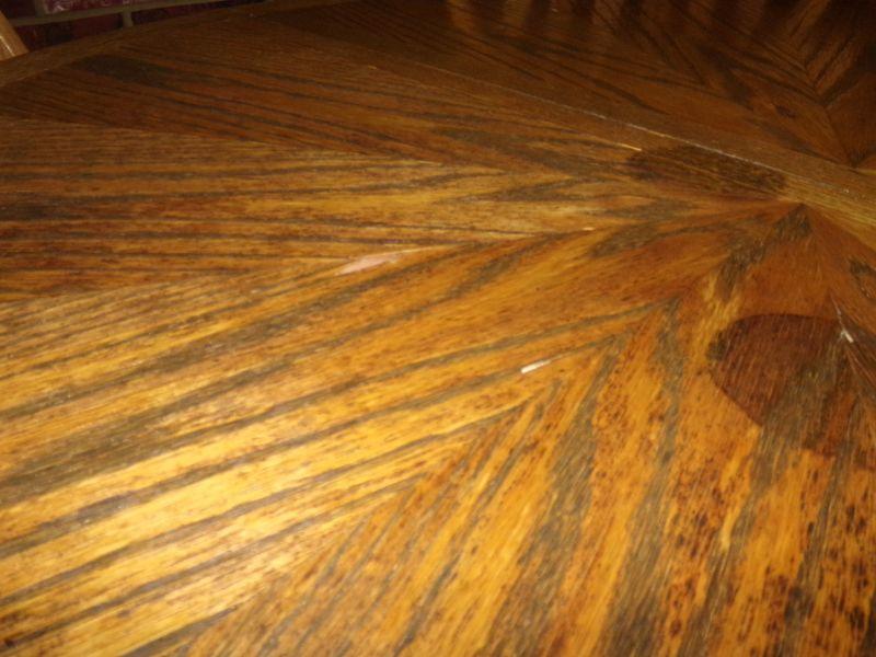 THERE IS CONSIDERABLE DAMAGE TO THE TOP OF TABLE AND THE LEAF