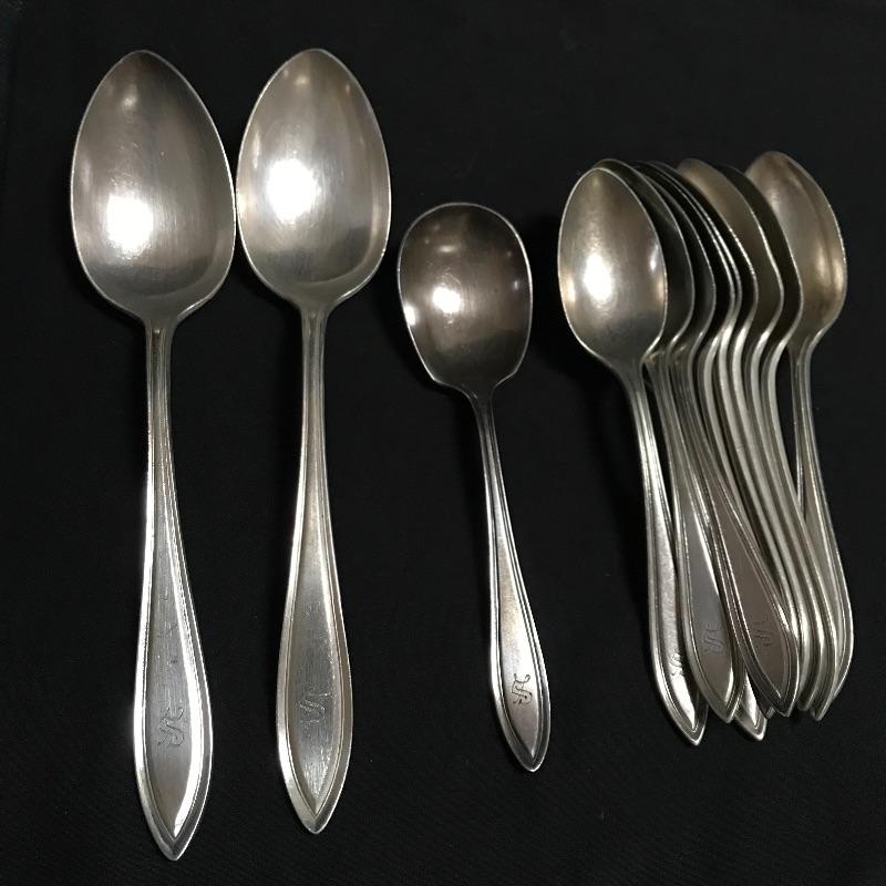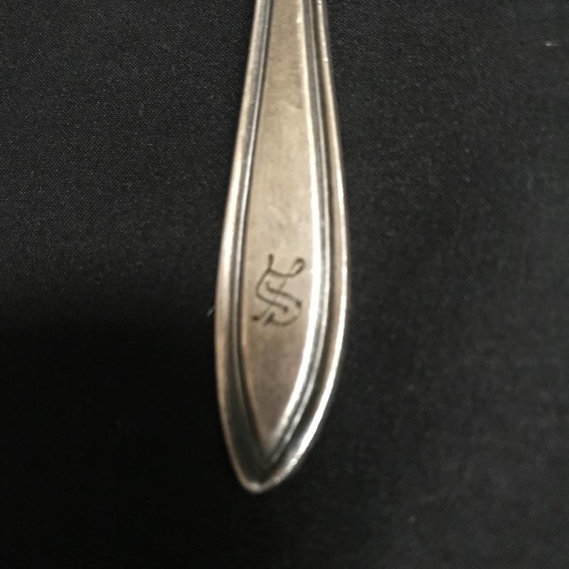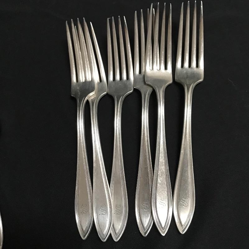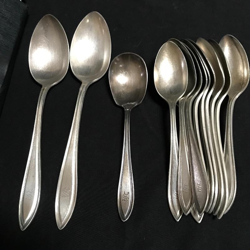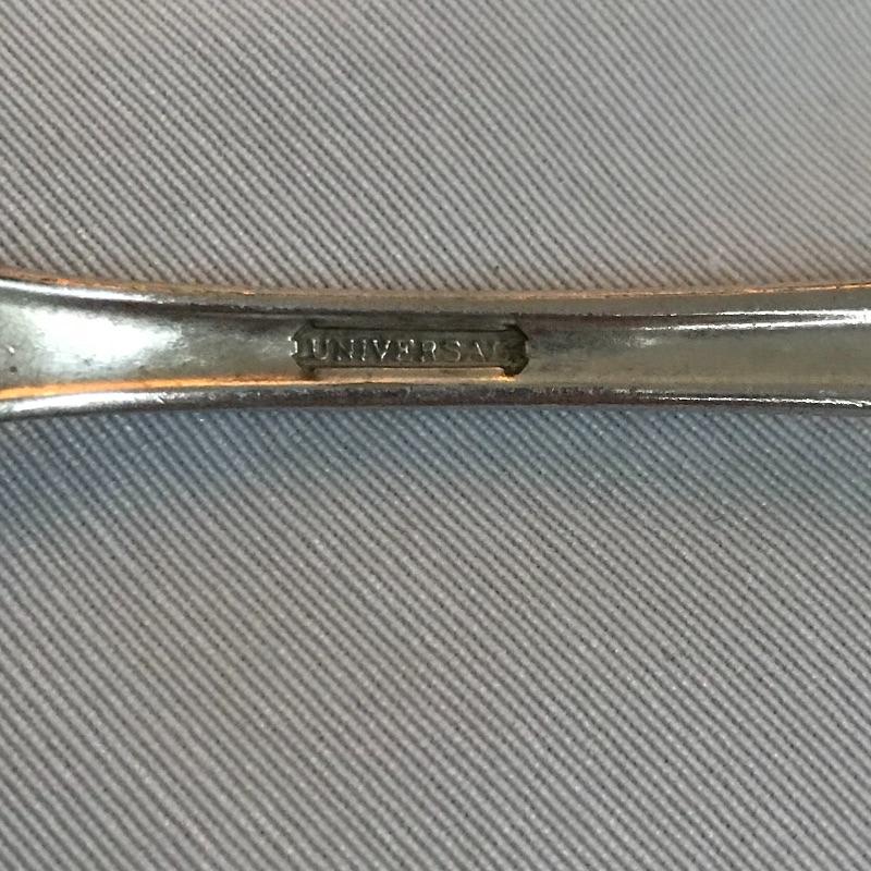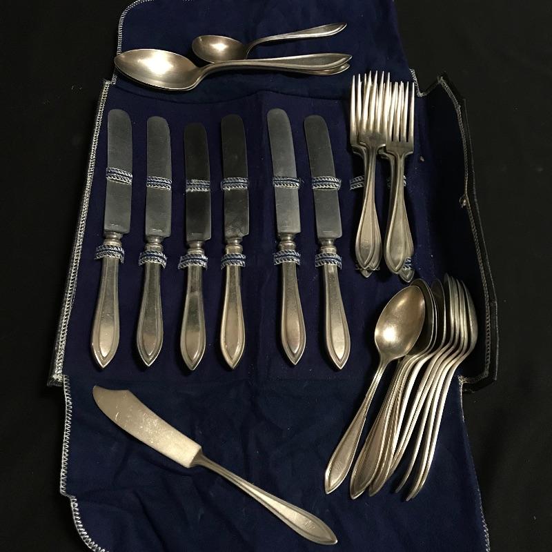 Solid and heavy silverware and service initialed with a beautiful “S” on each piece. Six dinner knives and forks with ten coffee spoons, one butter knife and three serving spoons. All pieces appear to be stamped “Universal” on the rear side. Set comes in a cloth lined blue folding clutch. Shipping available.