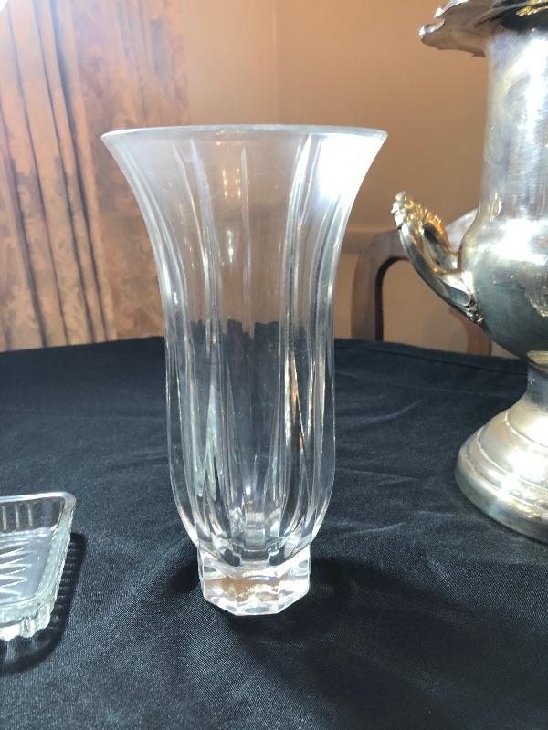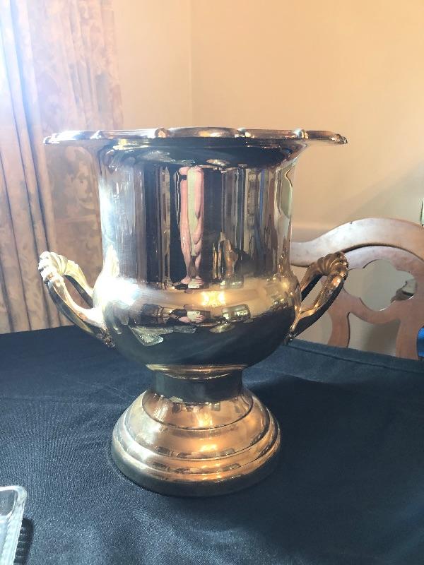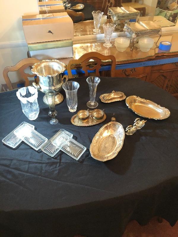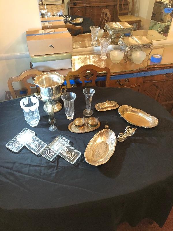 Lot 48 - Silver Ice Bucket, servers, butter dish, bread plates, cream & sugar bowl, swan salt & pepper, silver bell, flower vases