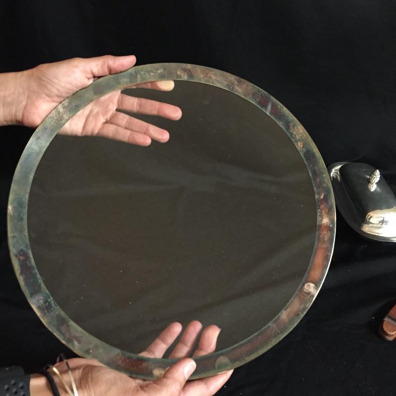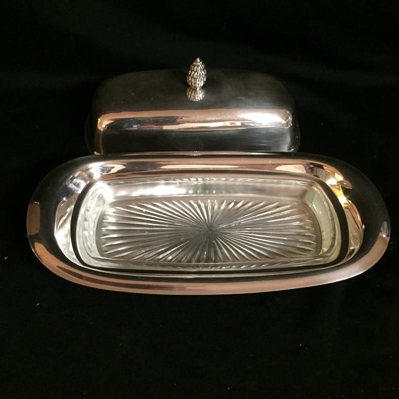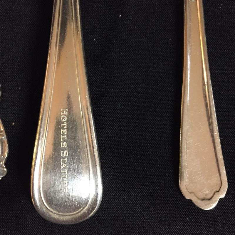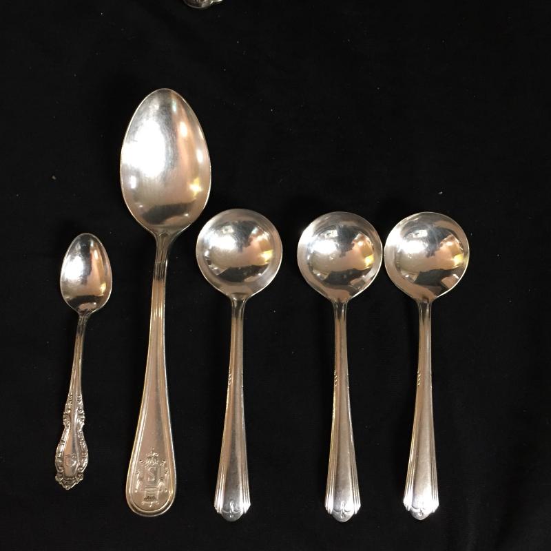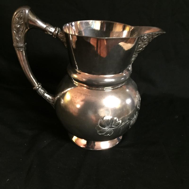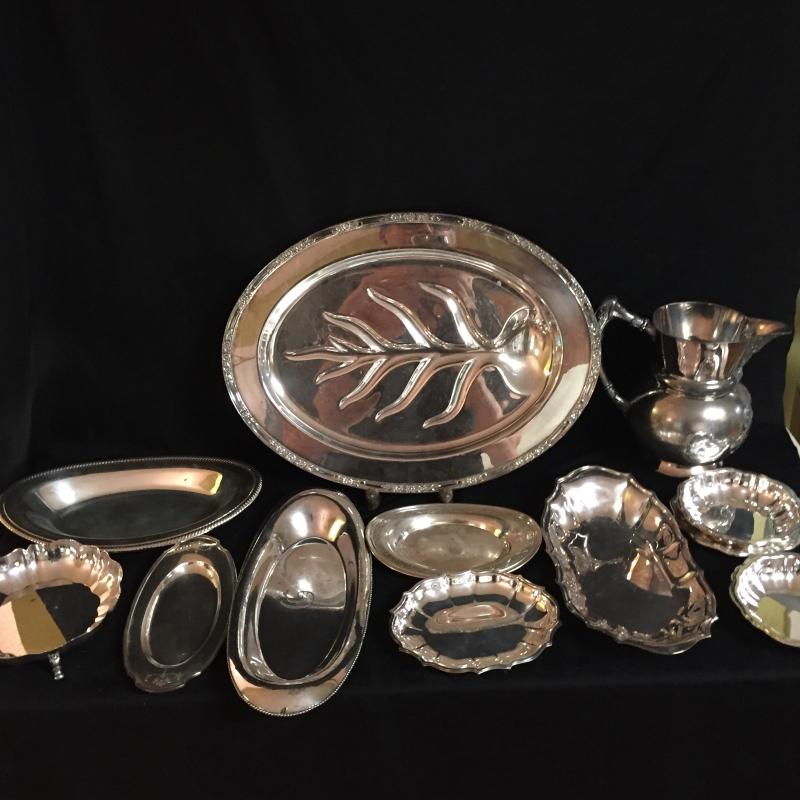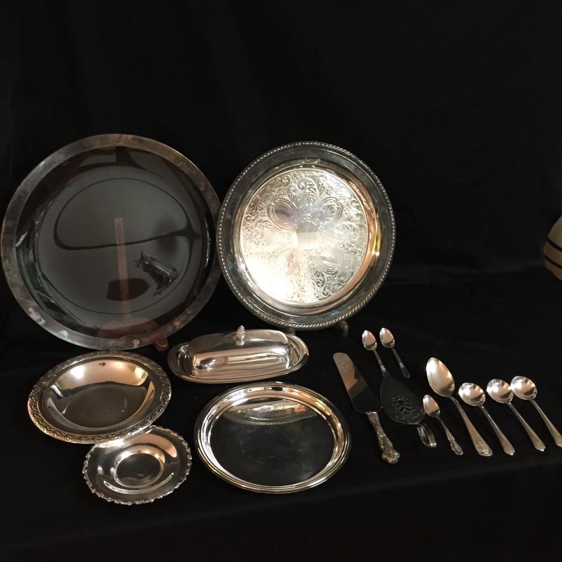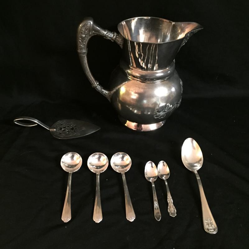 This silver plated lot includes several serving pieces and a glass and silver lined platter. It also includes hotel spoons from Waldorf Astoria and More. The Pitcher appears to be pretty old and is engraved with floral design. Oval Plate Measures 18”. Local Pickup Only