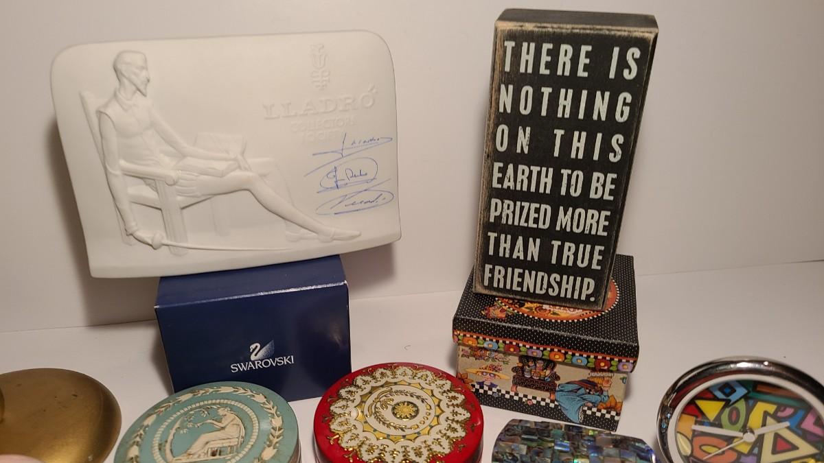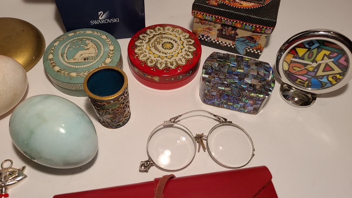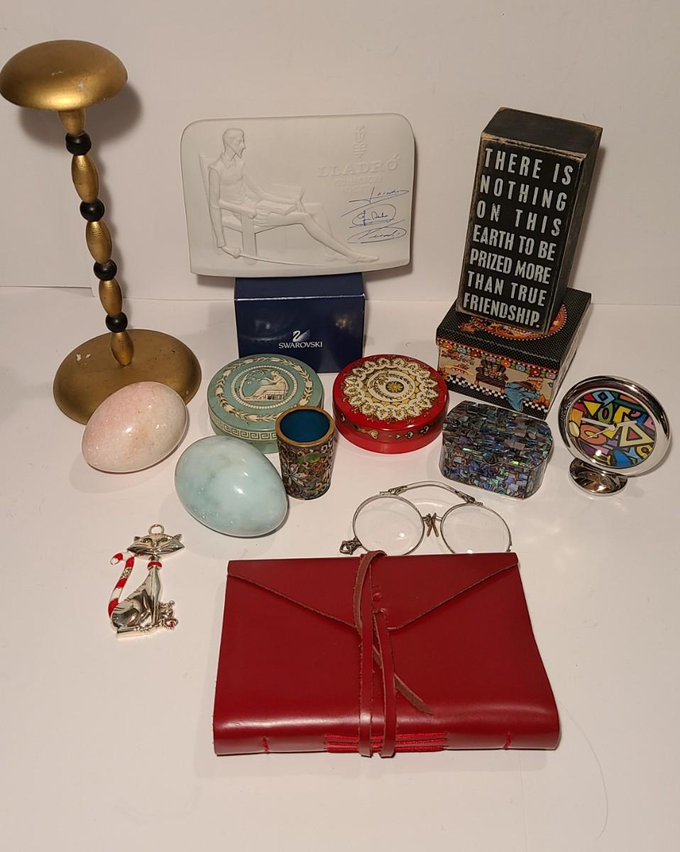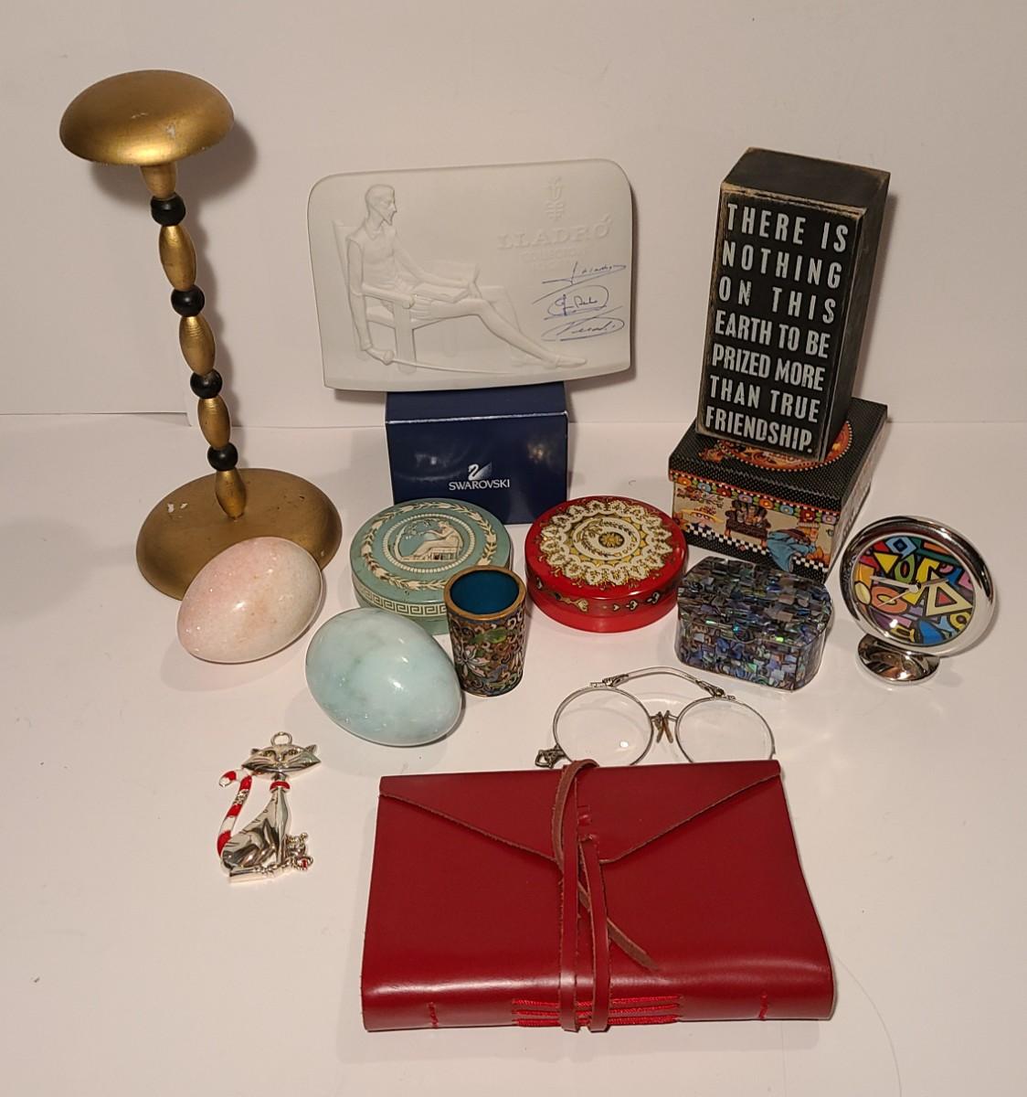 Great lot of collectibles/gifts including leather wrap journal, marble eggs, antique hat stand, Lladro collector sign, Sterling brooch, cloisonne toothpick holder, Brighton cat ornament, and more. Crystal has flea bite edge to tail. Please see all pictures for content of the lot, condition of the lot, and measurements if taken. Pictures are the best representation of the items listed and items are untested unless indicated in description. Thank you for looking and have fun bidding!
