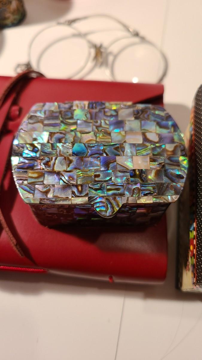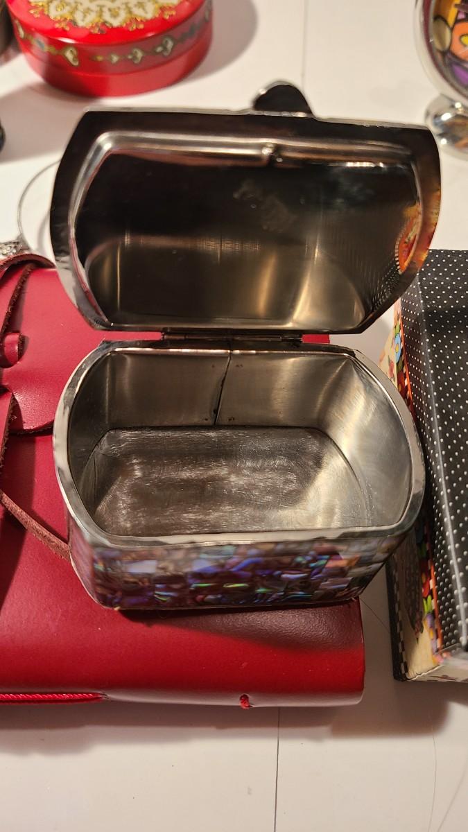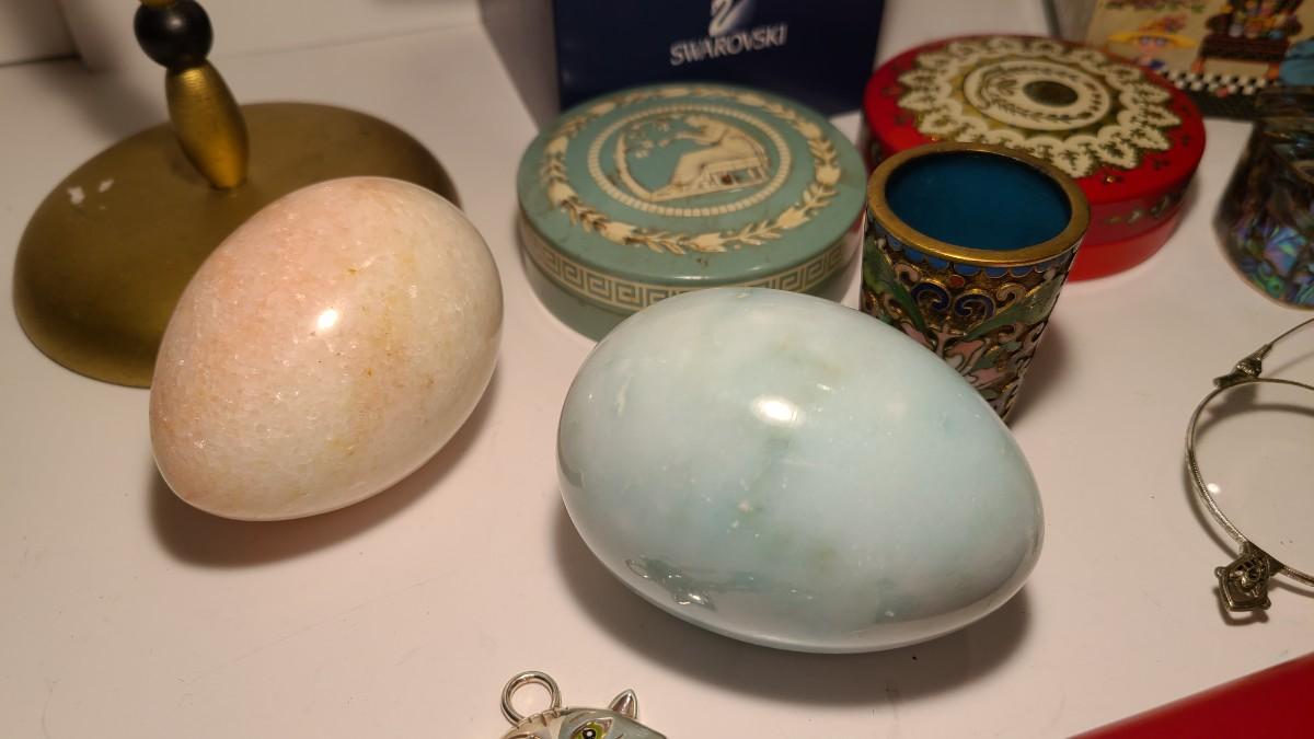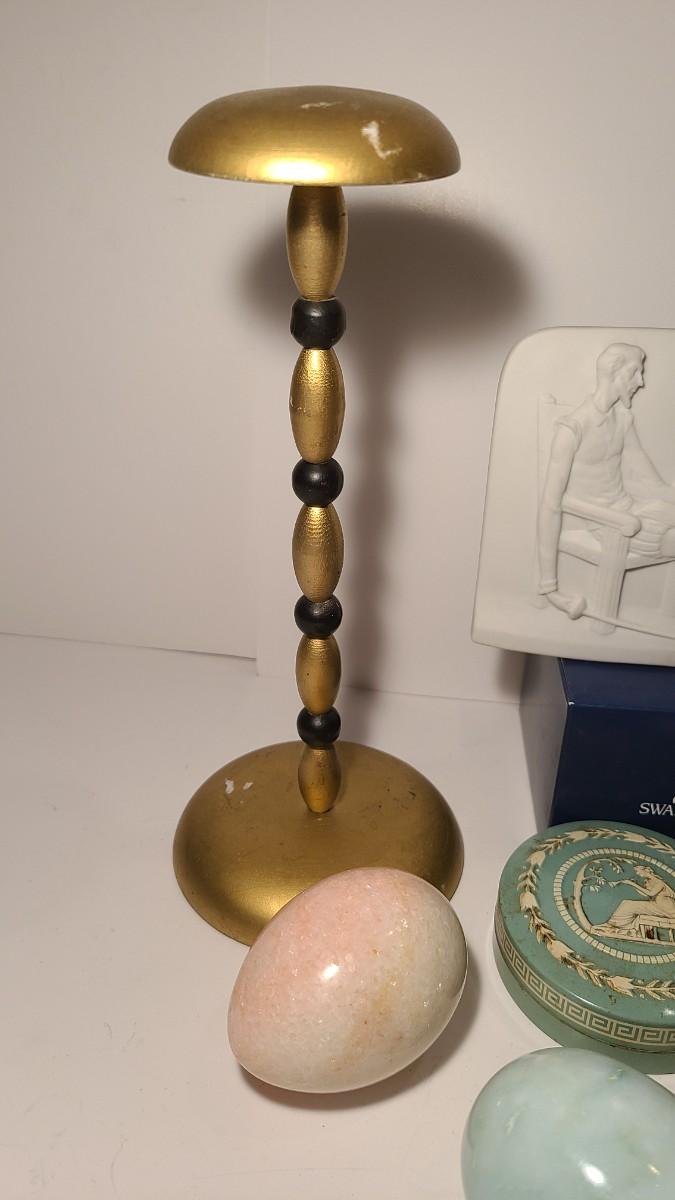 Great lot of collectibles/gifts including leather wrap journal, marble eggs, antique hat stand, Lladro collector sign, Sterling brooch, cloisonne toothpick holder, Brighton cat ornament, and more. Crystal has flea bite edge to tail. Please see all pictures for content of the lot, condition of the lot, and measurements if taken. Pictures are the best representation of the items listed and items are untested unless indicated in description. Thank you for looking and have fun bidding!