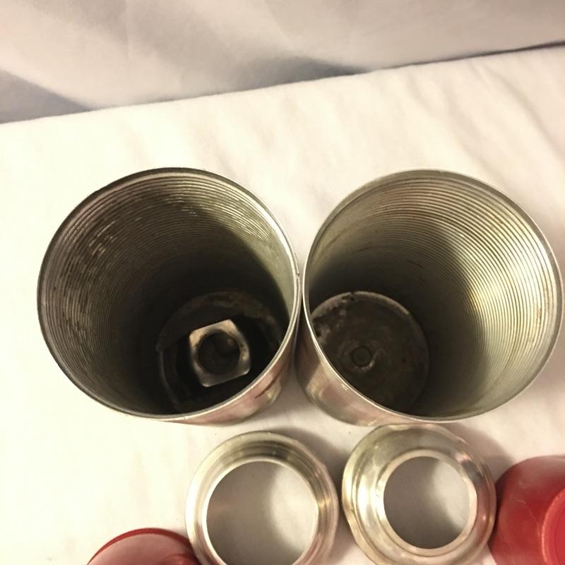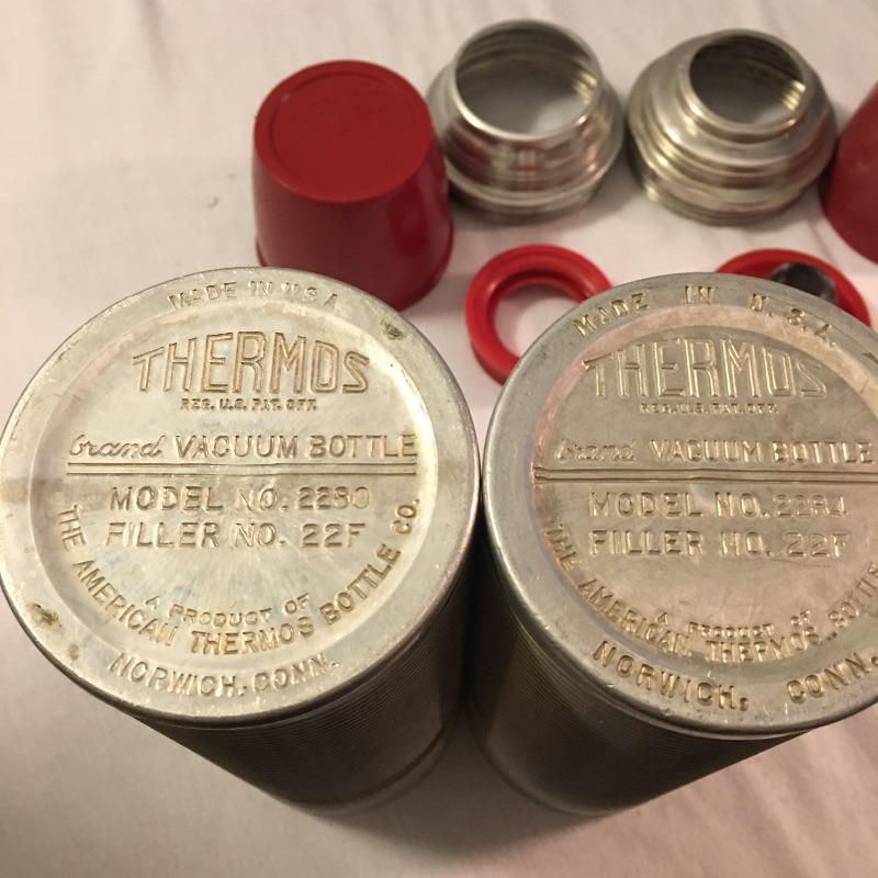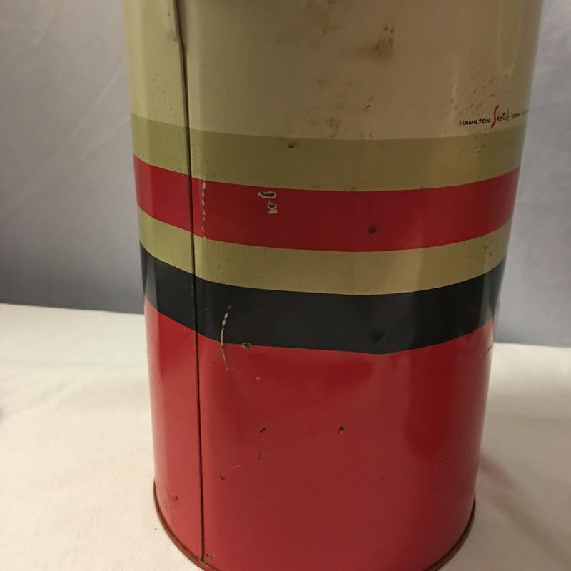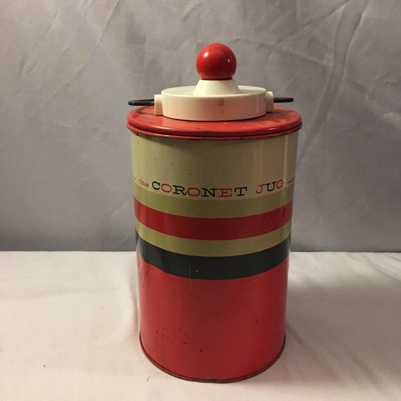 Old school cool is what’s in this collection of Thermos brand containers and The Coronet Jug insulated by the Hamilton Skotch Corporation. Includes five Thermos brand containers in a variety of sizes and The Coronet Jug that has a Ball jar inside its insulated container. Coronet jug measures 6”D x 12” tall and has a few dents. Two aluminum Thermos’ are missing inserts and measure 3”D x 10” tall with cap.
