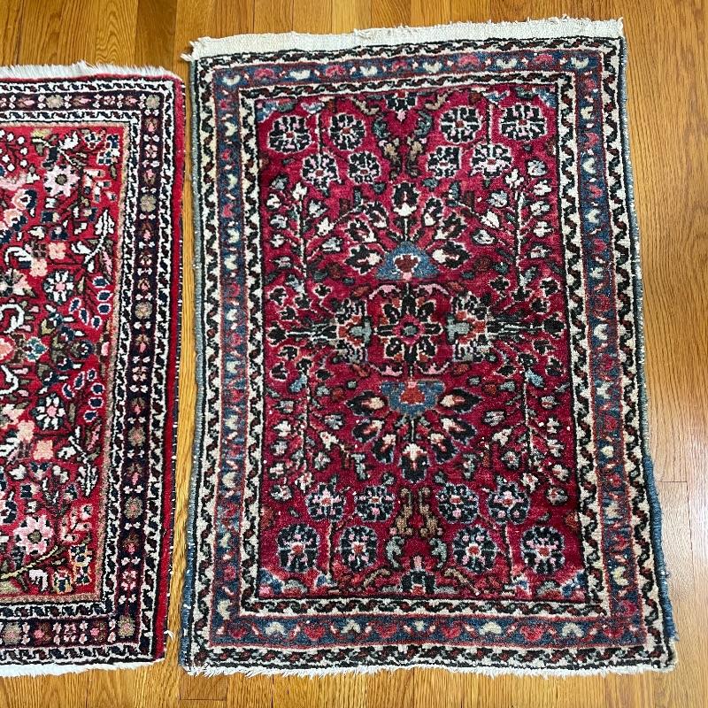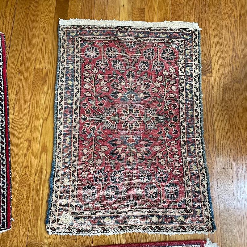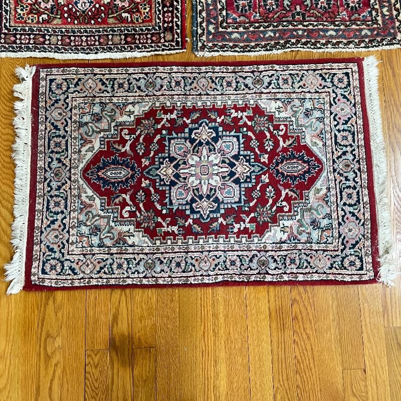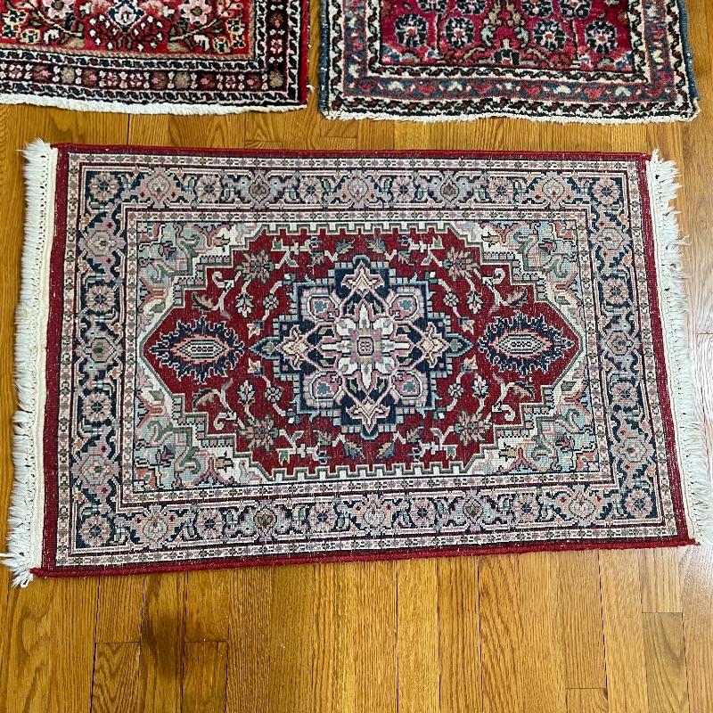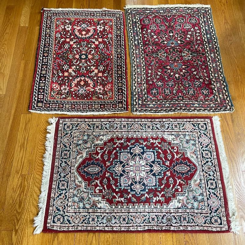 You’ll see Mrs. Olson has a fine taste and loved her rugs! Here’s three more (many are found in lots before and after this one)! These three quality rugs are soft to the touch and compliment each other nicely. The rugs vary is size only slightly. The two photographed vertically are about 22.5” x 30” and the larger one photographed horizontally is about 36” x 23.5”. See photos. Shipping available.