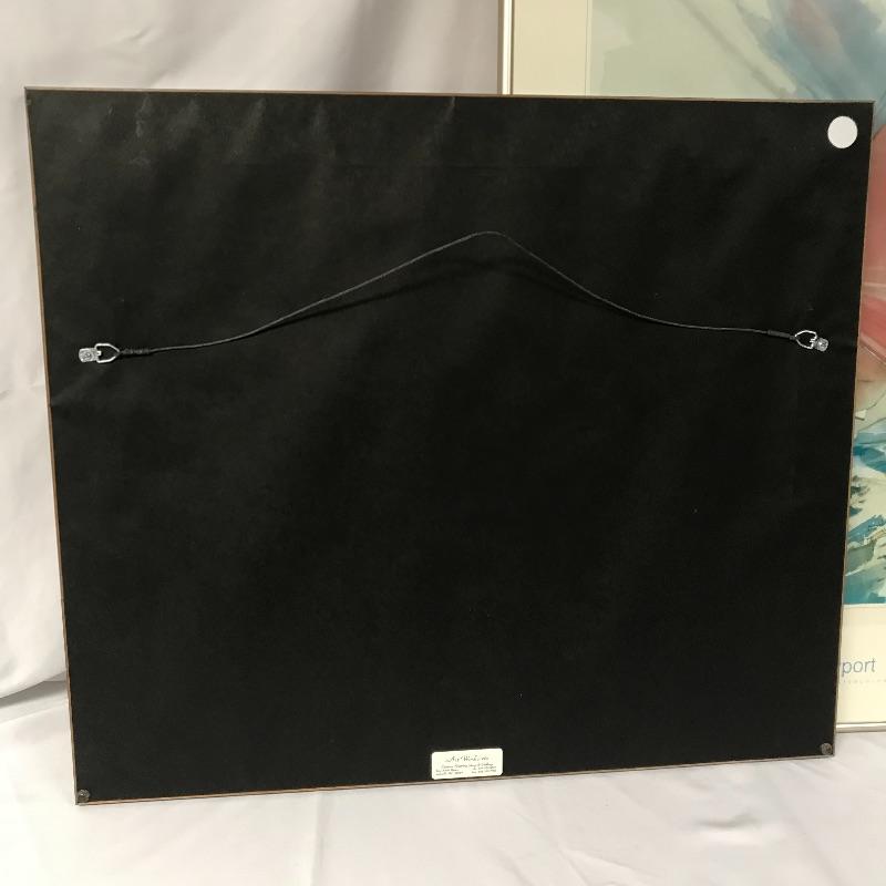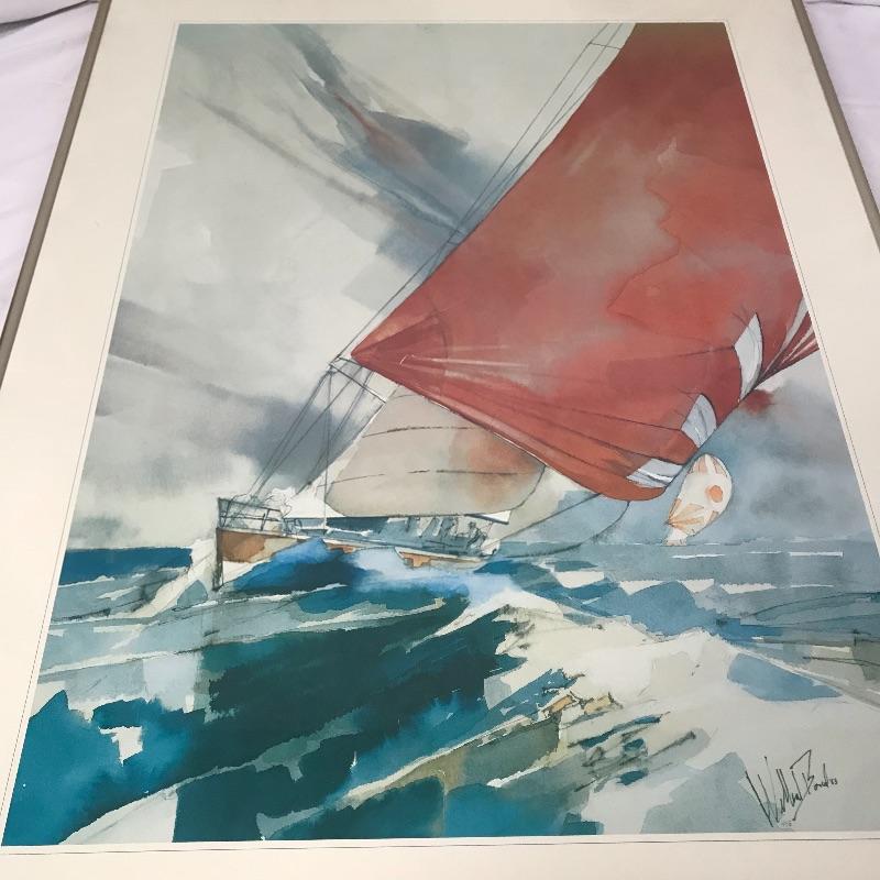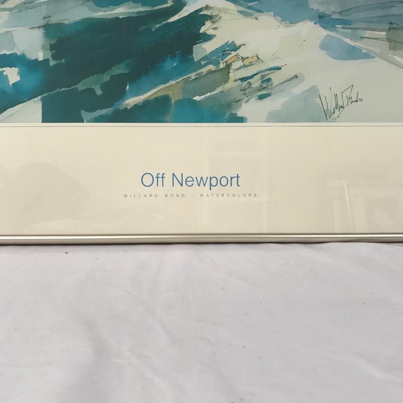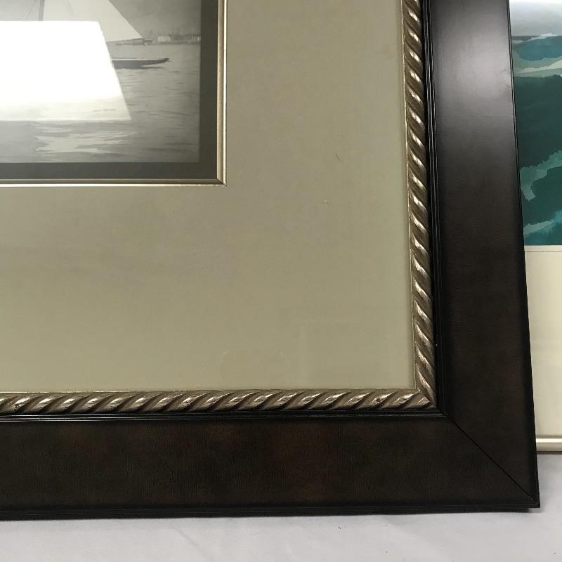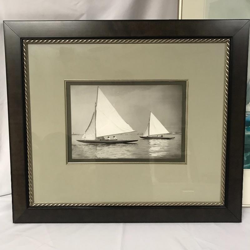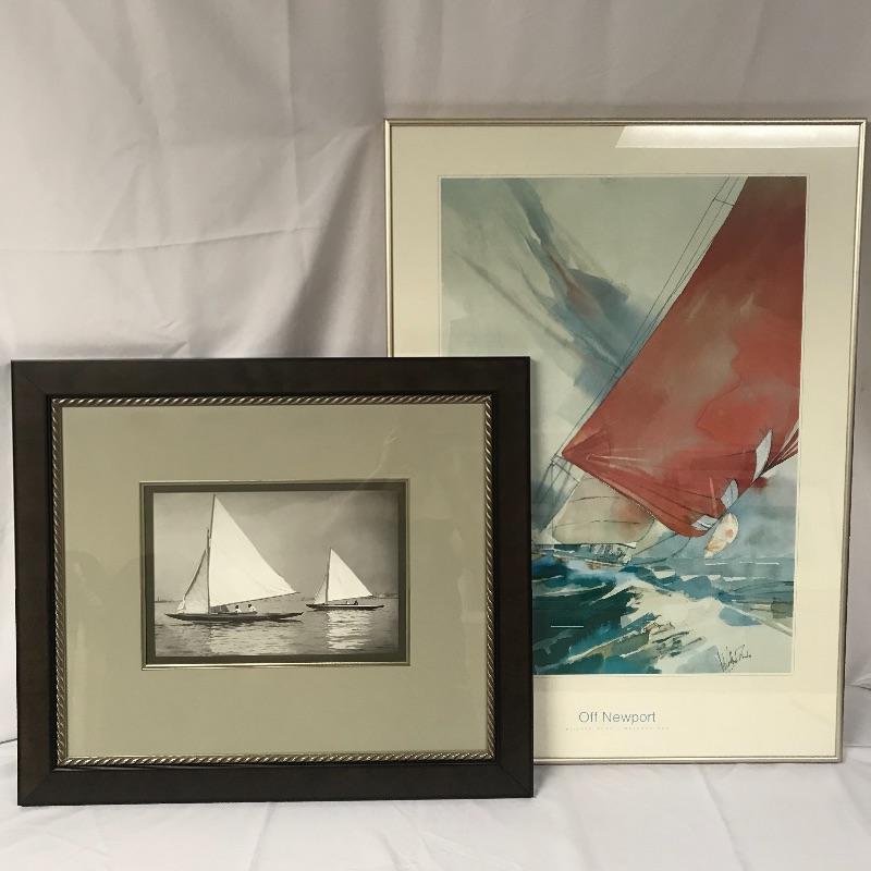 First, a black & white framed piece depicting two sailboats. This piece appears to be a photograph with metal accented matting and a metal and wood frame. Piece measures approximately 27” x 23”. Next a larger metal frame containing what appears to be a Willard Bond print that includes a printed signature and measures 25” x 34.5” frame. Both art pieces are placed behind glass.