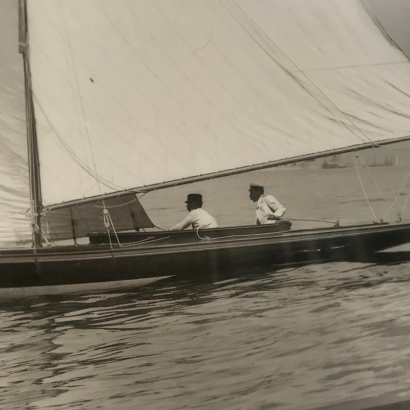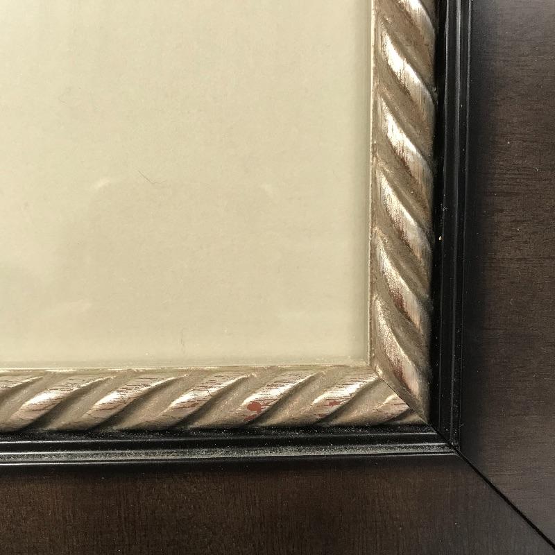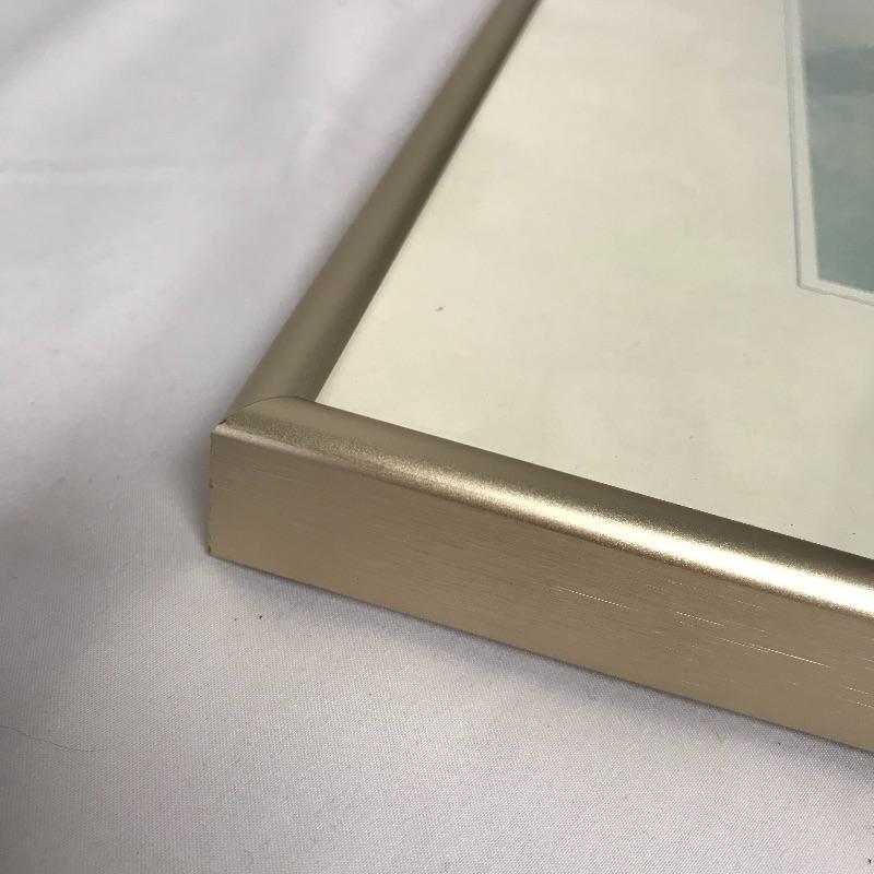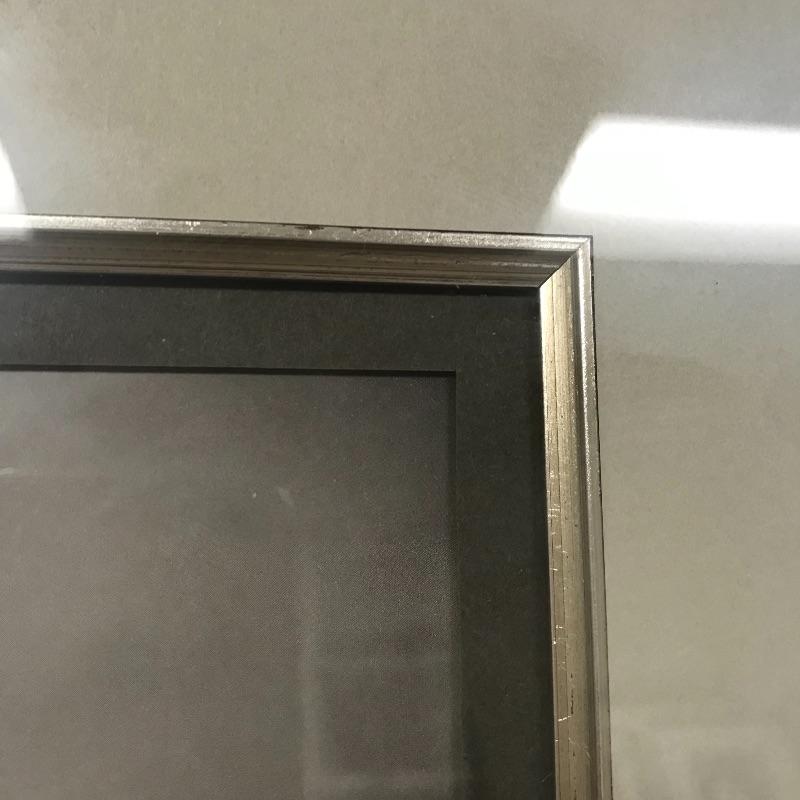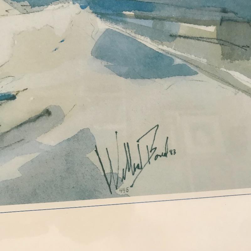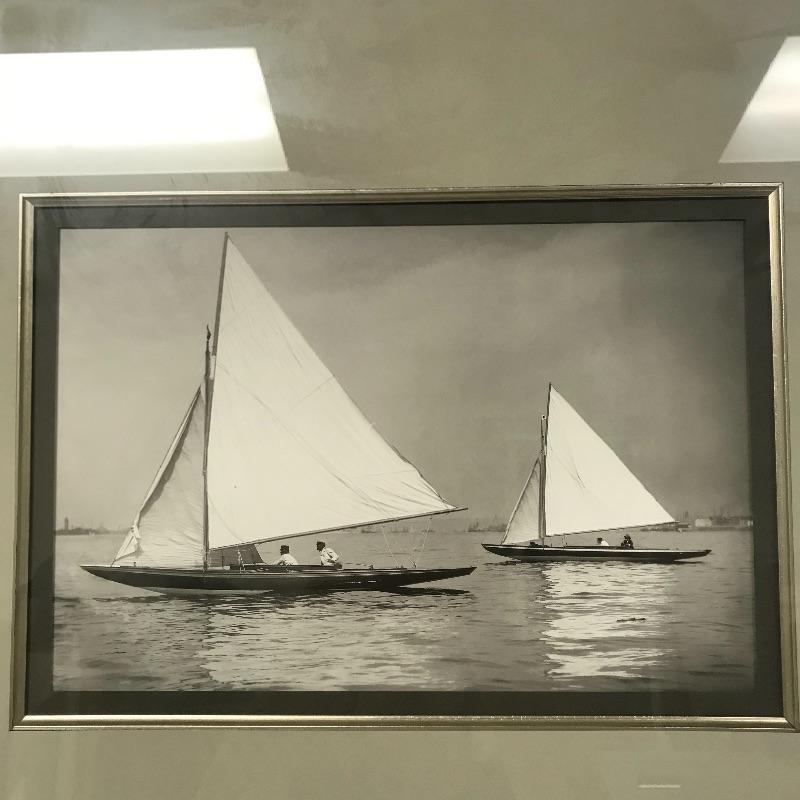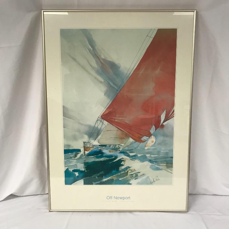 First, a black & white framed piece depicting two sailboats. This piece appears to be a photograph with metal accented matting and a metal and wood frame. Piece measures approximately 27” x 23”. Next a larger metal frame containing what appears to be a Willard Bond print that includes a printed signature and measures 25” x 34.5” frame. Both art pieces are placed behind glass.