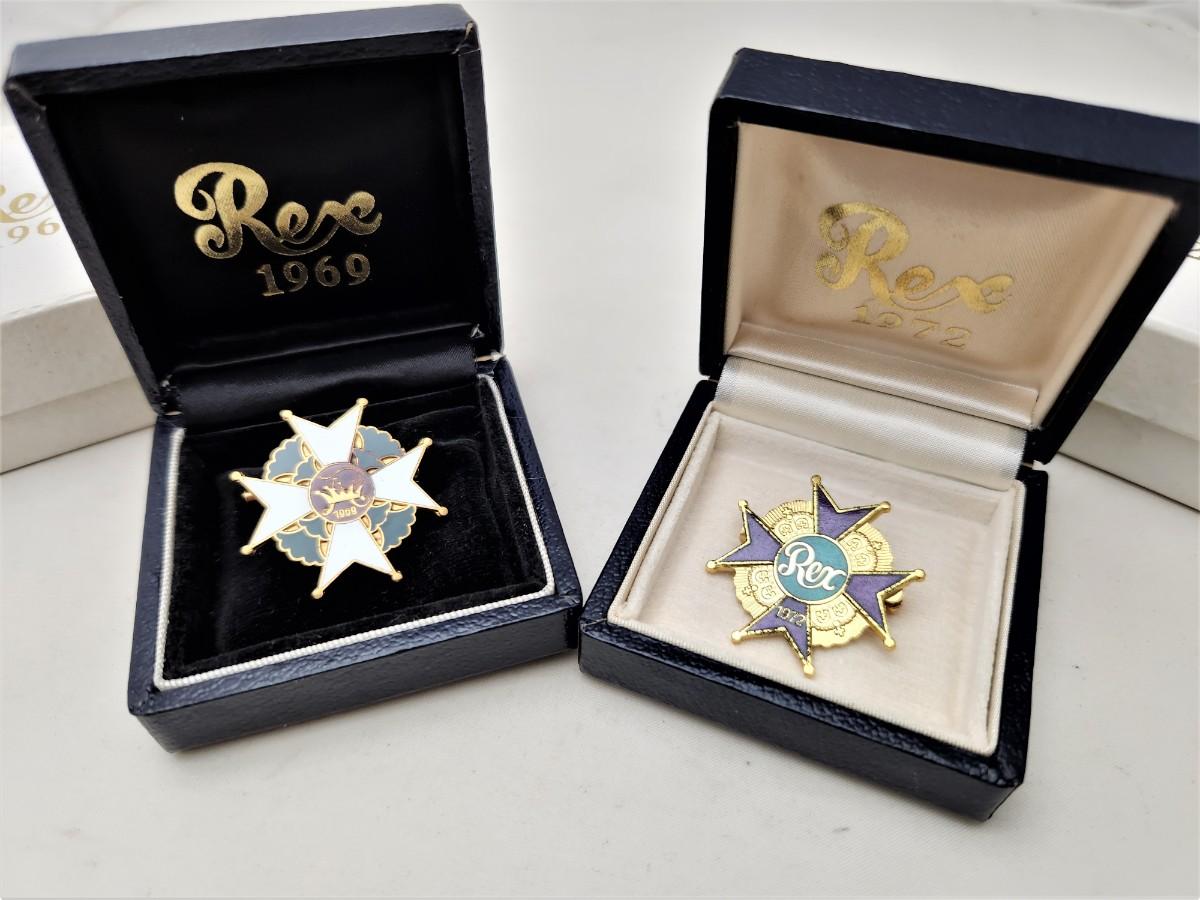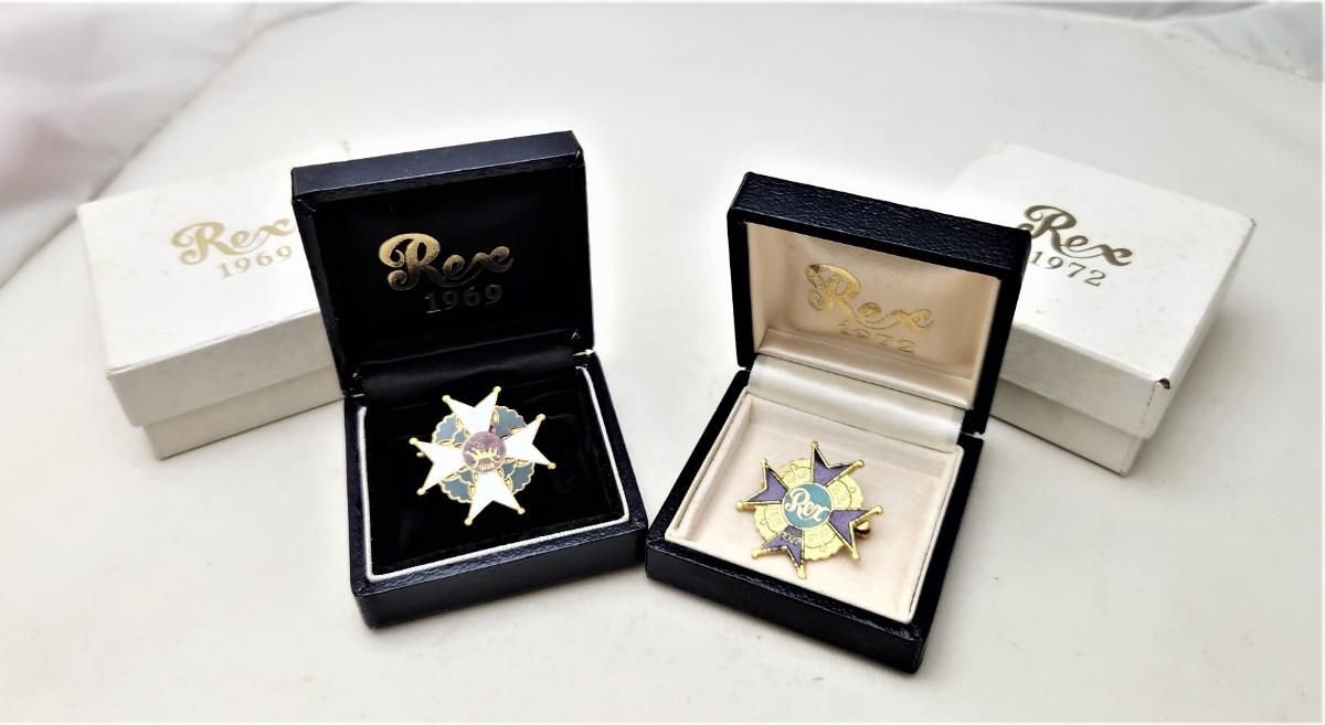 Lot of 2 REX Ladies ducals/favors/brooches in original boxes. You get the pin from 1969 and the one from 1972. Gold toned metal with enamel. Outer boxes show some wear - these have been in storage. Minor wear to the edges of the enamal in a couple of places on the pins. Highly collectible. I would be willing to ship these - you pay priority postage.