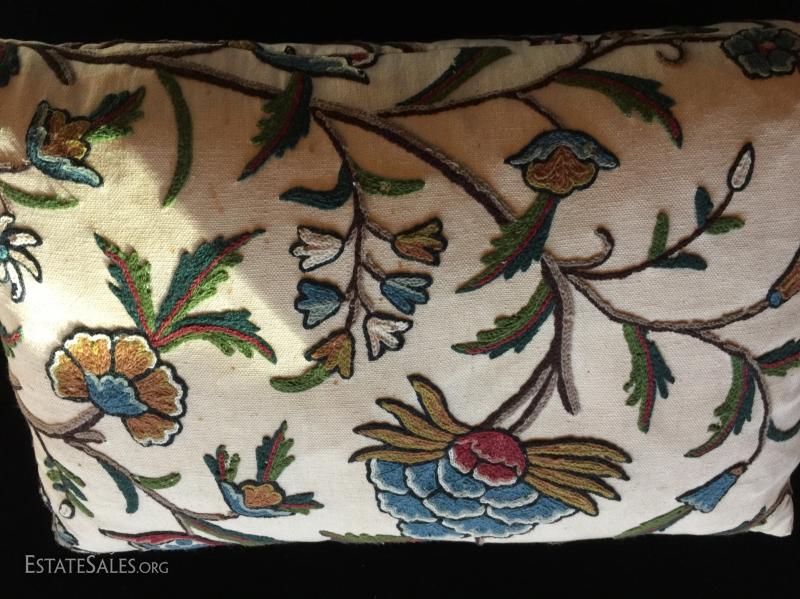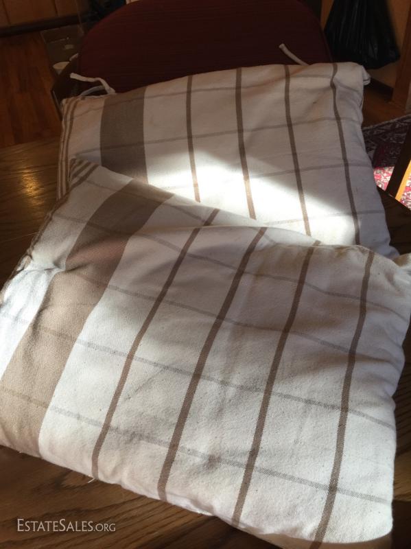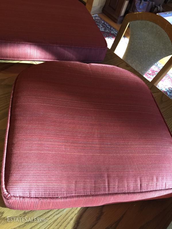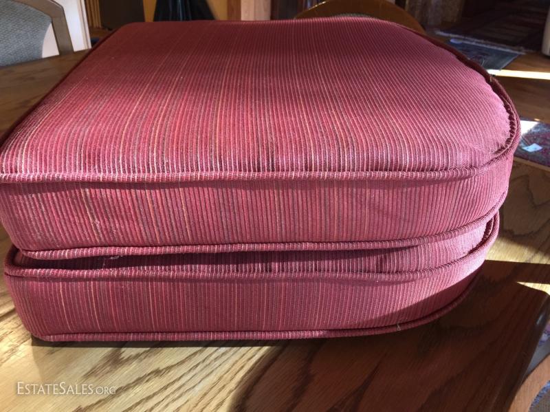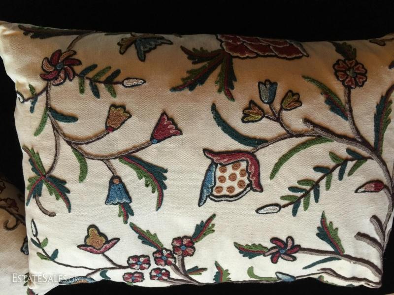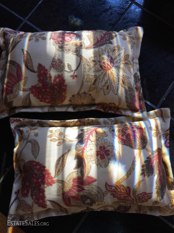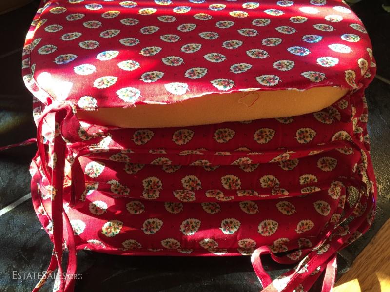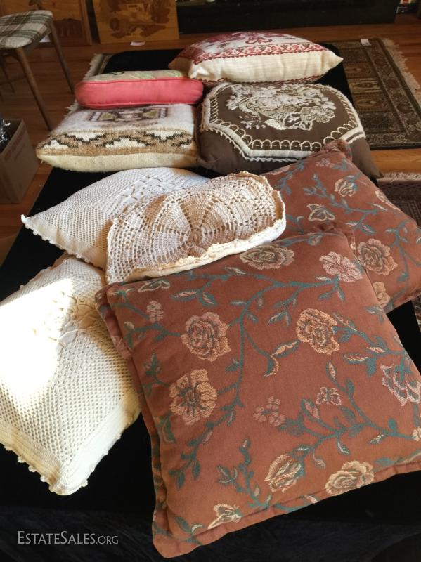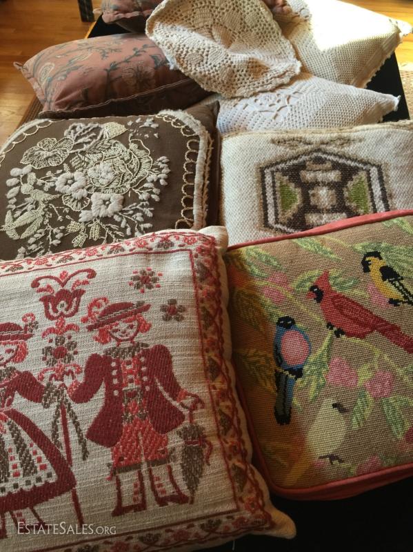 Lot of miscellaneous pillows and cushions. Various styles Includes set of 4 red chair tie cushions (some damage), set of 2 heavily embroidered pillows and another 14 misc pillows (some sets of 2) Some sets, Some single.